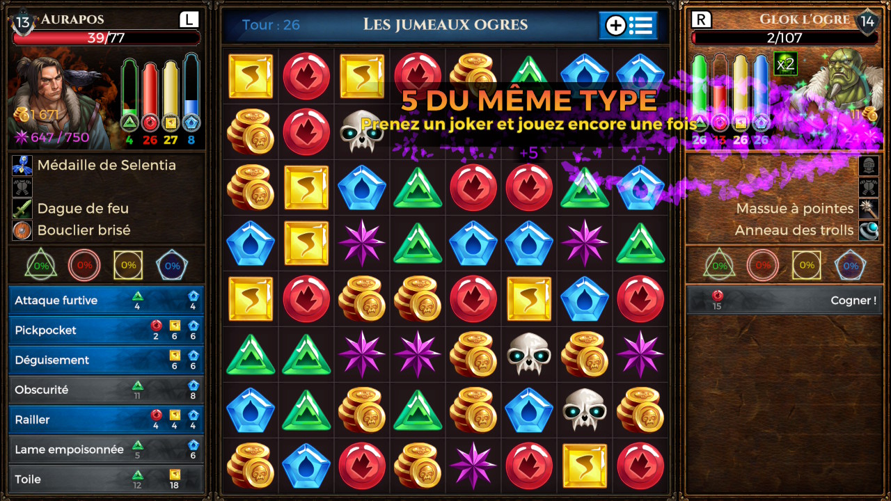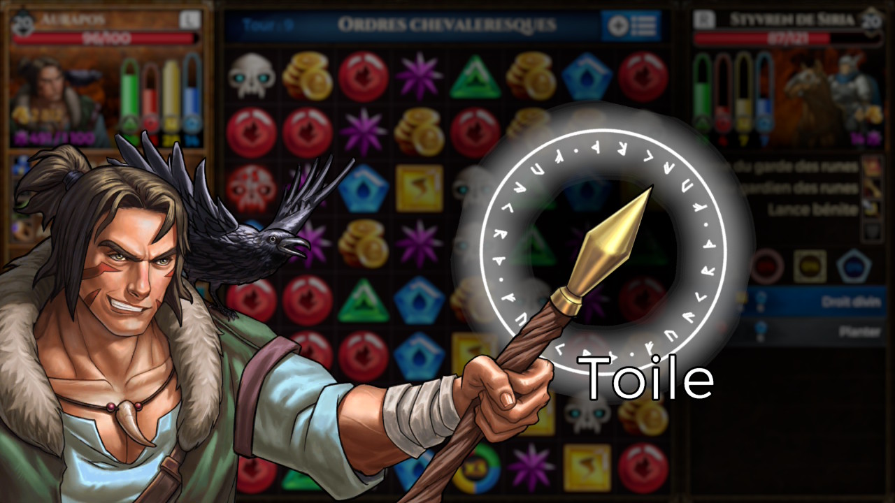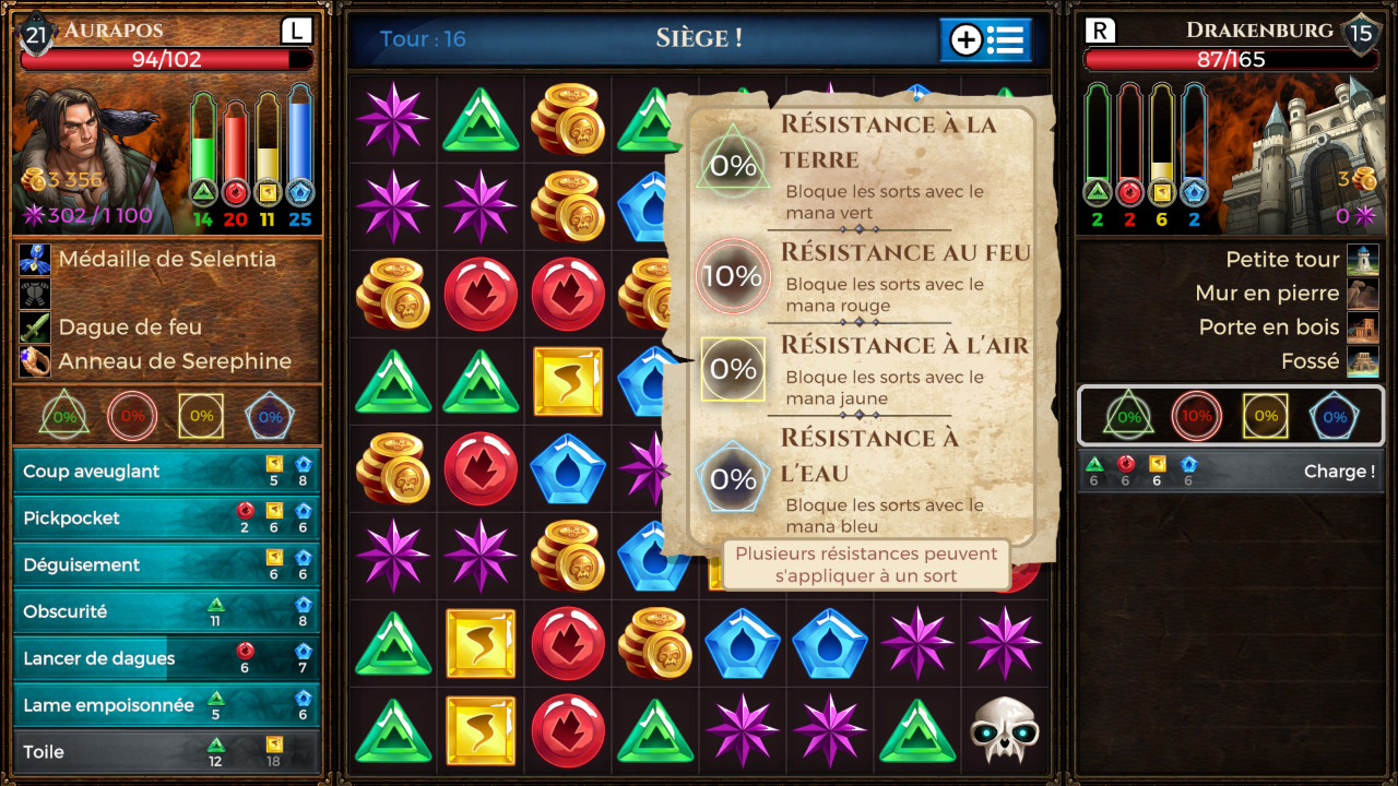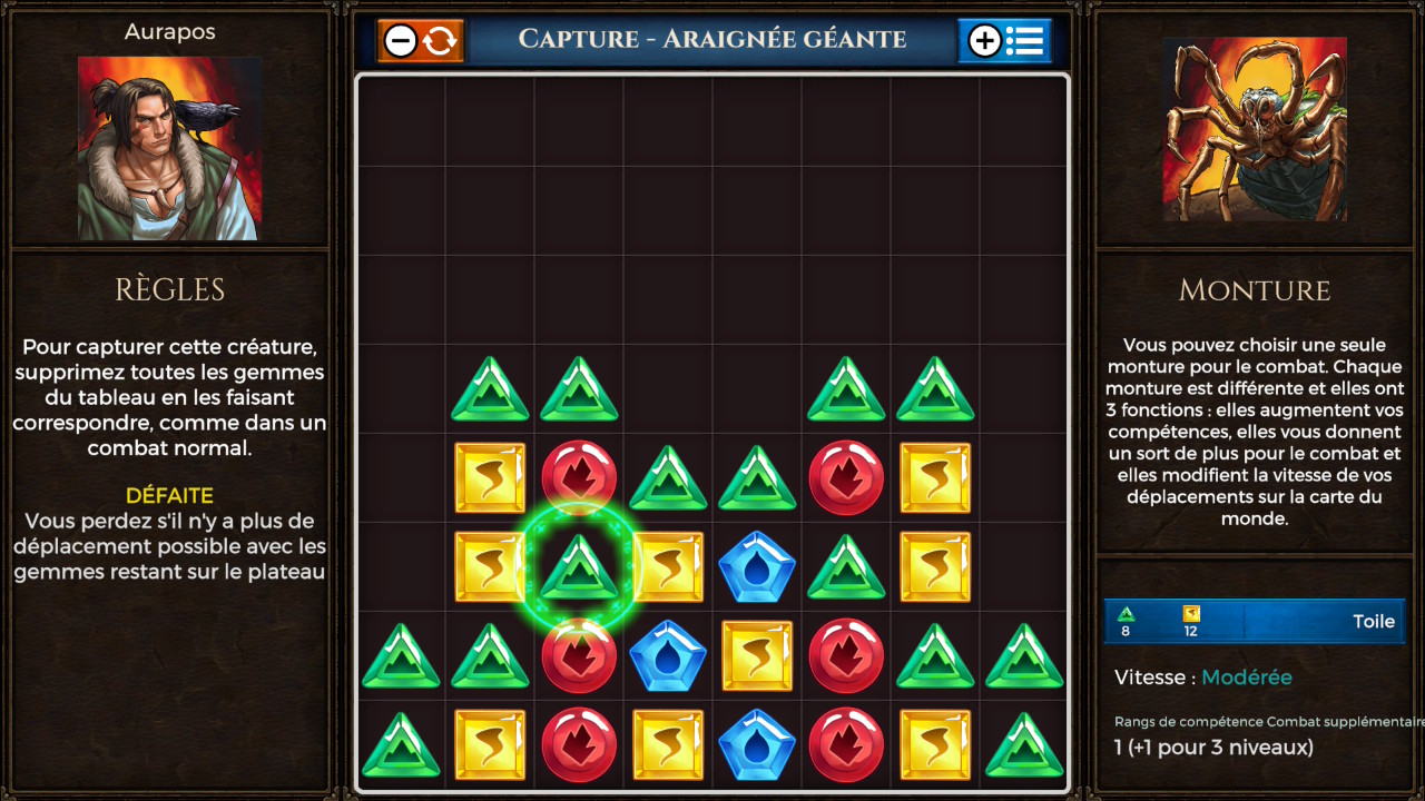 Entrons maintenant dans le vif du sujet: les combats! C’est bien entendu la partie puzzle du jeu. Lorsque vous déciderez d’affronter un adversaire, vous pourrez choisir le niveau de difficulté avant d’entrer dans le combat. Bien que réussir un combat dans le niveau de difficulté le plus élevé vous permettra de gagner plus d’or et plus de points d’expérience pour votre personnage, ce n’est pas obligatoire. Les trois niveaux de difficulté proposés se distinguent bien entre eux et le tout est vraiment bien balancé. J’ai principalement joué en mode « difficile », mais il m’est arrivé quelques fois de baisser le niveau de difficulté à « facile » (ces maudites attaques de siège!). Les combats se déroulent dans une grille de 8 blocs par 8 blocs. Vous devrez mettre un minimum de 3 emblèmes de la même couleur côte à côte pour les faire disparaître et ainsi, en fonction de l’emblème combiné, gagner du mana, de l’or, de l’expérience ou bien infliger des dégâts physiques à l’adversaire. Si vous combinez une certaine couleur, comme le jaune, vous obtiendrez des points de mana de la couleur correspondante. Avec celle-ci, vous pourrez utiliser des sorts ou des capacités et je peux vous dire qu’il y en a beaucoup ! De plus, en montant de niveau, votre personnage déverrouillera une multitude de nouvelles habiletés. De plus, les créatures que vous capturerez, car oui, il est possible éventuellement de faire cela, vous apprendront aussi les leurs. Ce n’est donc pas le choix qui manque. Vous devrez bien choisir, car vous pourrez en équiper seulement six en excluant celle de la monture, qui sera automatiquement ajoutée à votre sélection.