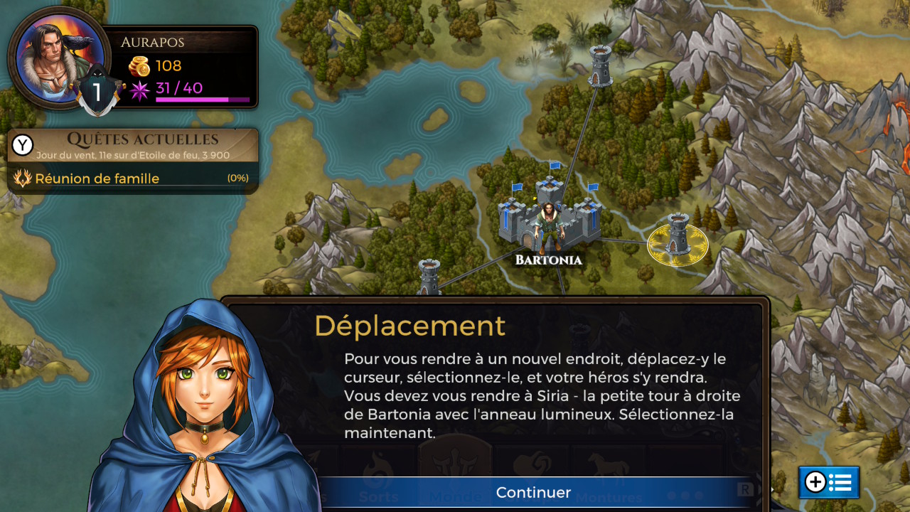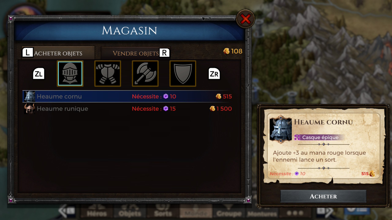 Le magasin, comme expliquer plus haut, permettra d’acquérir des équipements. Bien qu’il y ait plusieurs façons de dépenser votre or, j’aurais grandement aimé plus de personnalisation de votre château. Après seulement quelques heures de jeu, tout était acheté et j’étais très loin d’avoir terminé l’aventure principale. Outre les cités que vous pourrez conquérir pour gagner de l’or de façon périodique, il y aura des points d’intérêt sur la carte qui vous permettront de récupérer des runes. Ces runes serviront à la forge que vous pourrez déverrouiller dans votre château. Lorsque vous explorerez la carte du monde, des monstres pourront apparaître de façon aléatoire, ce qui vous obligera à les combattre pour emprunter les routes qu’ils bloquent.
