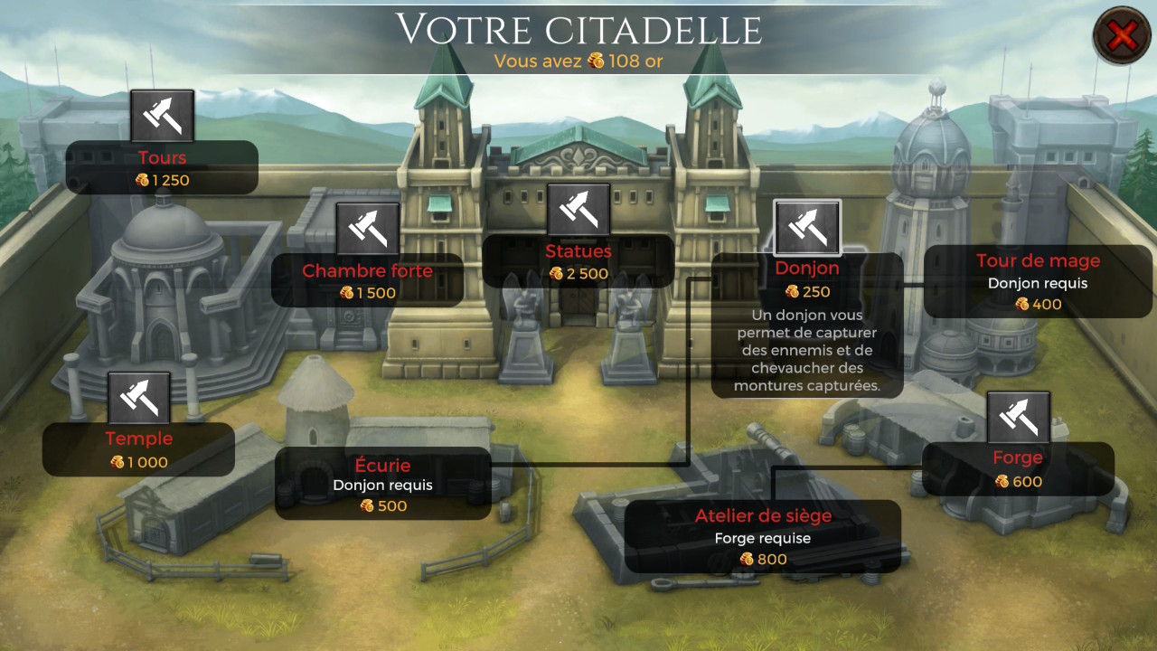 Il est possible d’activer quatre quêtes actives à la fois, ce qui vous obligera parfois à compléter une quête pour être en mesure d’en sélectionner une nouvelle. J’ai bien aimé que certaines quêtes offrent plusieurs choix et dénouement. Il y aura des quêtes accessibles seulement lorsque vous en aurez terminé d’autres. Il est donc sage de retourner dans les villes où vous aviez achevé vos missions pour vérifier si de nouvelles missions ne sont pas apparues. En allant à la citadelle, vous pourrez, encore une fois, dépenser de l’or. Cela vous permettra de déverrouiller de nouvelles mécaniques de jeu qui vous seront grandement utiles par la suite. Je ne ferai pas le tour de chacune d’entre elles, mais, pour vous donner un exemple, il est possible de déverrouiller l’écurie. Cette dernière vous permettra, après avoir vaincu une certaine créature un nombre défini de fois, de la capturer. Lorsque vous aurez accompli l’exploit, la créature deviendra une monture que vous pourrez équiper pour vous donner une compétence en combat. Dans mon cas, j’ai adoré l’araignée géante que nous débloquons très rapidement. Elle a un look d’enfer et sa compétence est très puissante. À la taverne, vous pourrez payer pour avoir des renseignements sur différentes choses dans l’univers du jeu.