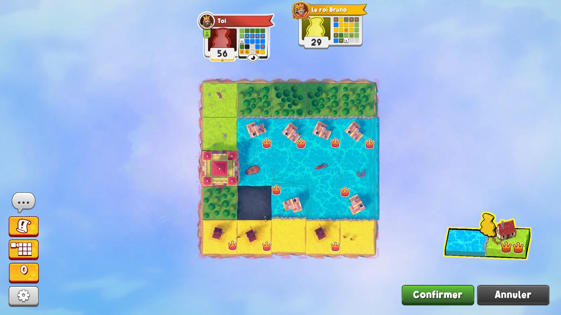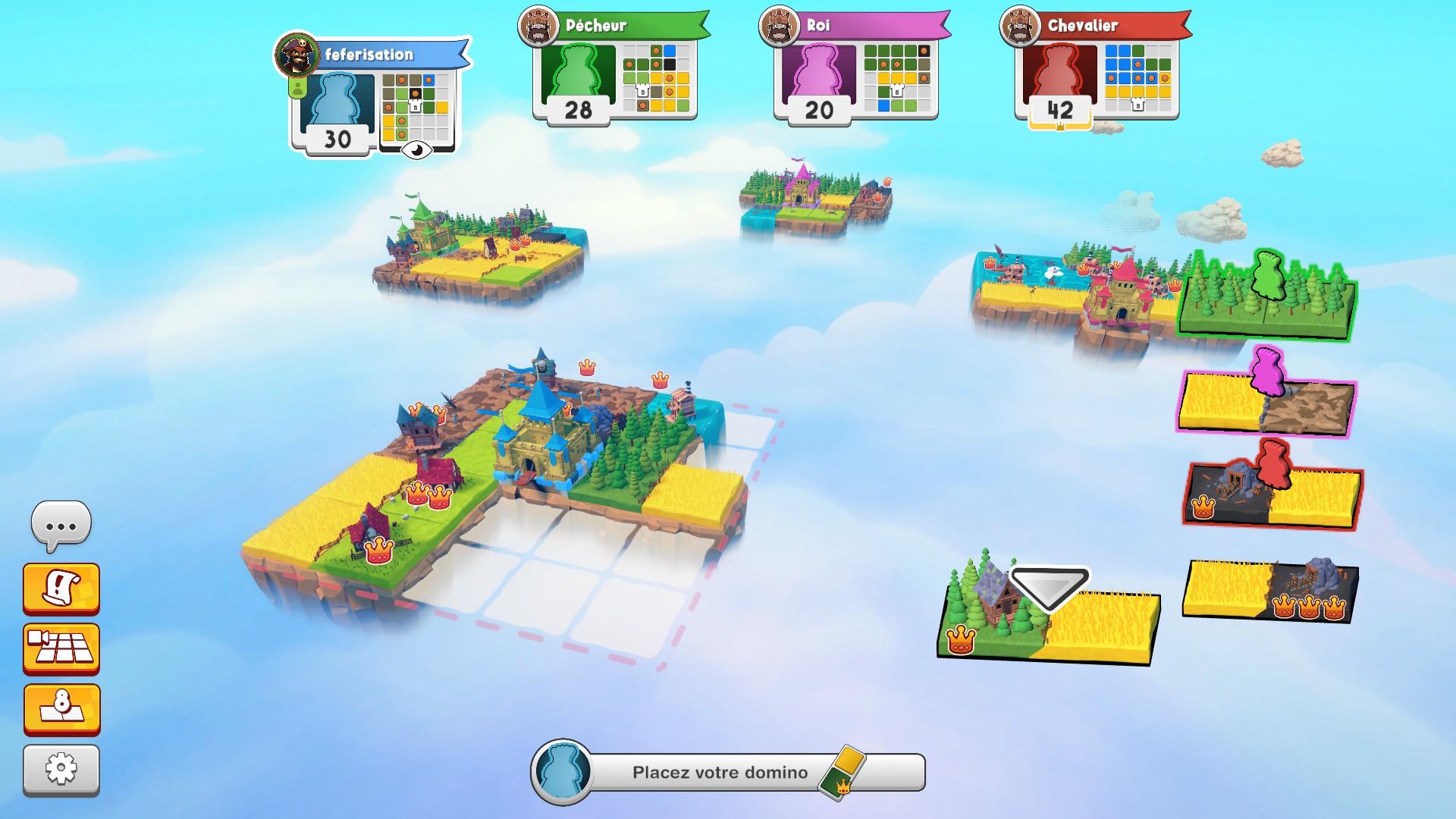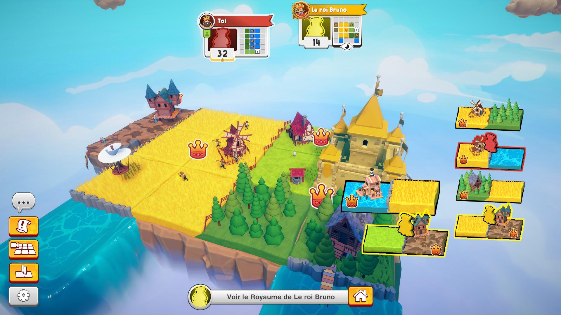 Les royaumes des adversaires apparaissent également au loin au fil de la partie, ce qui donne l’impression d’un vrai sentiment de progression. Enfin, une mini-carte de notre royaume est visible en haut de l’écran, ce qui nous permet de garder un œil sur notre royaume, mais aussi sur celui de nos adversaires et ainsi adapter sa stratégie sans perdre de temps. Après tout, il ne s’agit pas seulement de choisir la meilleure tuile pour votre royaume, mais aussi d’empêcher vos adversaires de mettre la main sur la leur.
