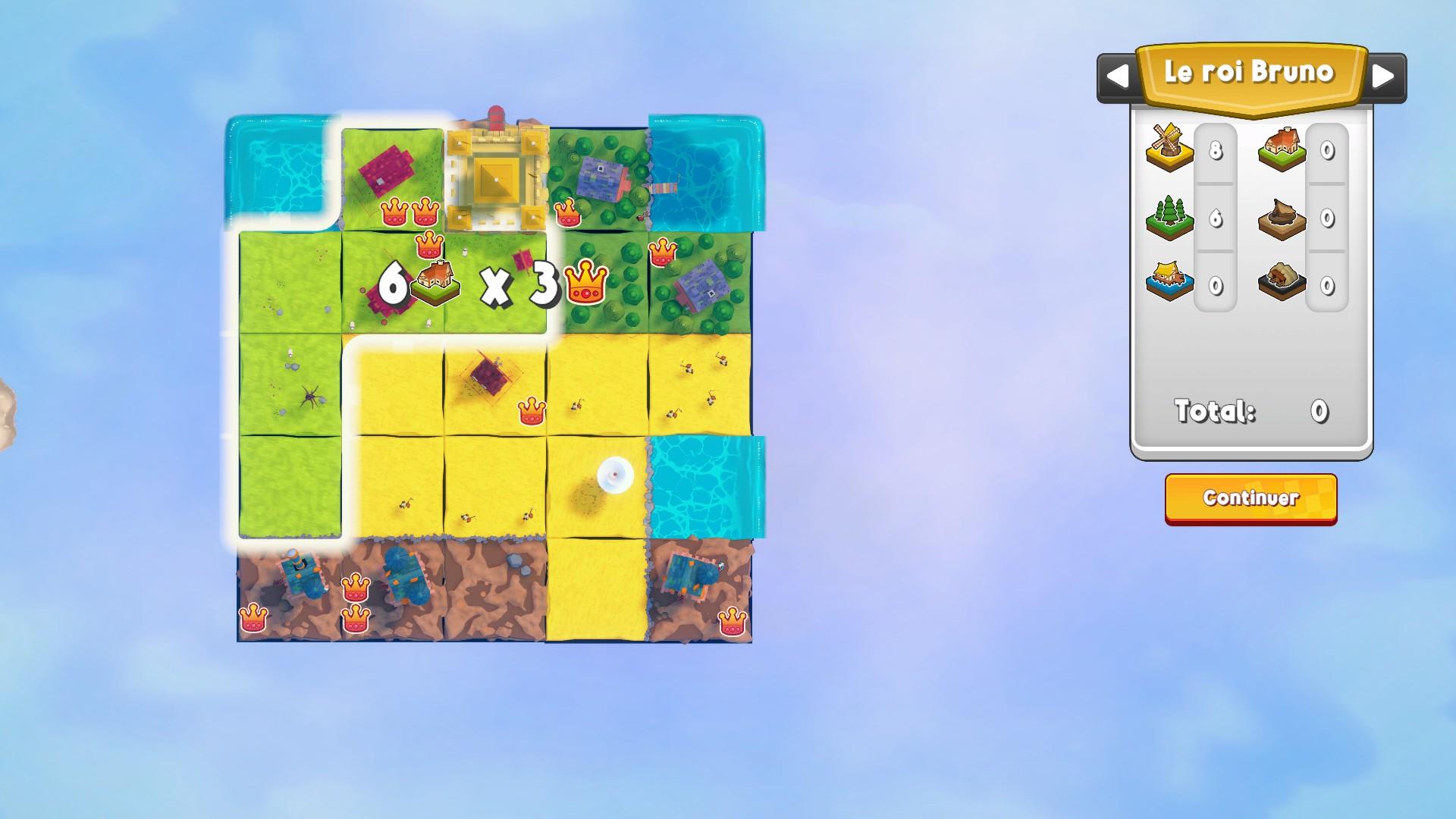 Certaines parcelles comportent des couronnes, indispensables pour marquer des points. Le pointage final est calculé en multipliant le nombre de tuiles d’un même type par le nombre de couronnes présentes dans cette zone. Par exemple, un groupe de cinq champs vert, contenant deux couronnes, rapportera 10 points de victoire. L’optimisation et le placement de nos tuiles sont donc cruciaux. Il est important de créer les plus vastes territoires, sans oublier d’y inclure des couronnes pour que le territoire rapporte plus de points. En fin de partie, le décompte des points de victoire est fait pour chaque type de tuiles et, par la suite, la somme de ces résultats sera notre score final. Le joueur avec le plus de points remporte la partie.
