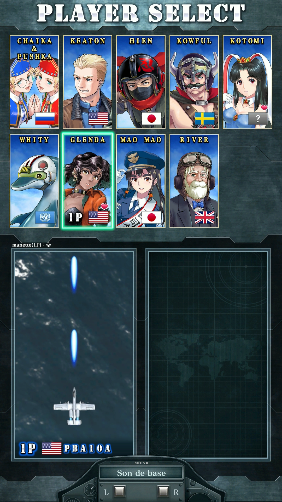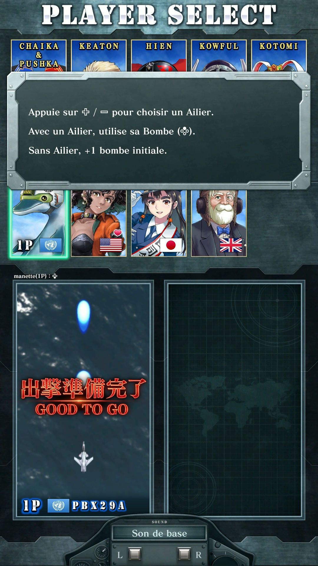 Avec une jouabilité qui est dans la digne succession de jeux comme 1942, Katakis, Xenon, Battle Squadron et Banshee, il ne faut pas s’attendre à beaucoup de nouveautés pour ce Sonic Wings Reunion. Vous constaterez, en observant bien le menu du jeu, qu’il n’y a pas grand-chose à se mettre sous la dent à part le mode arcade, l’entraînement, le classement et les options. « Pas beaucoup de choix », me suis-je dit. J’ai tout de même lancé fébrilement le mode « arcade » pour découvrir huit avions pour mener à bien mes missions. Une fois l’avion sélectionné, on peut choisir un ailier, en clair, vous pouvez choisir l’attaque secondaire d’un autre avion, qui vient s’ajouter à votre tir de base et à l’attaque secondaire de votre propre appareil. Ceci dit, cela vous coûtera un emplacement de bombe en moins si vous choisissez de prendre un ailier, l’amélioration n’est pas gratuite!