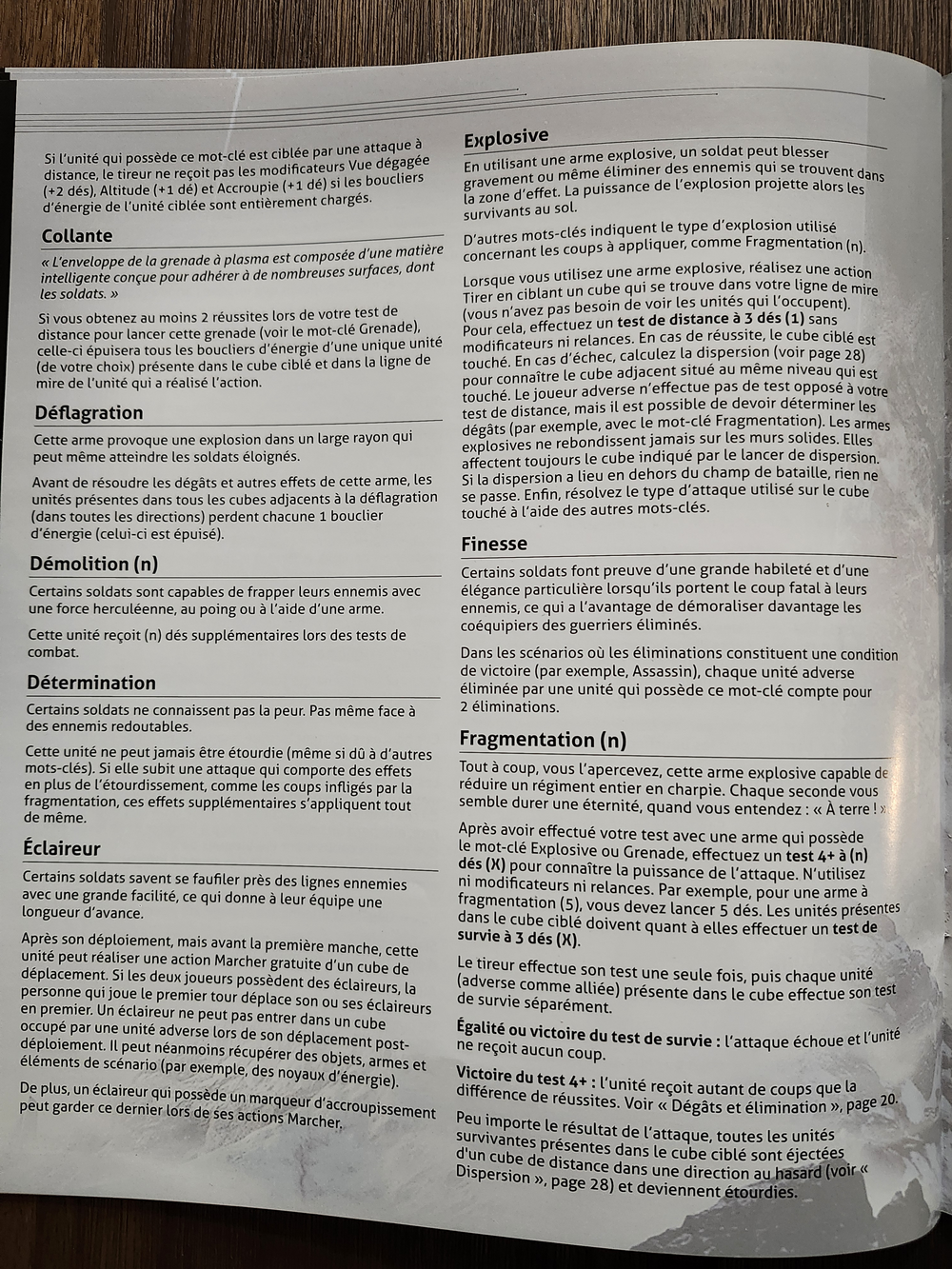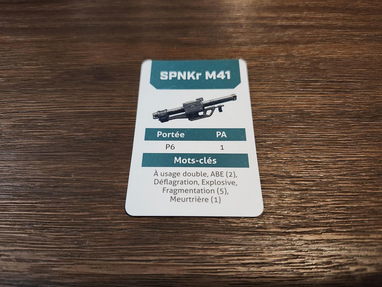 Le problème est que cette complexité se retrouve dans presque toutes les actions que vous accomplirez, un simple tir devient une série de calcul et de jets de dés interminables dans lequel plusieurs éléments doivent être pris en compte. Même après plusieurs parties, nous devions encore nous référer au livret de règle presque à chacune de nos attaques pour nous assurer que le calcul soit correct. Mais la complexité ne s’arrête pas là. Lors d’une attaque, les mots-clés présents sur l’arme utilisée doivent aussi être pis en compte. Par exemple, une arme qui comprend les mots-clés « optique » et « meurtrière » permettra à son utilisateur d’ajouter 1 dé à son jet d’attaque, de compter les 7 et les 8 comme étant des coups critiques et d’infliger un point de dégâts supplémentaire à l’adversaire à condition que celui-ci ait subi des dégâts lors de l’attaque. S’il s’agissait d’apprendre une dizaine de mots-clés, ce serait tout de même raisonnable, mais le jeu comporte 41 mots-clés et certains sont plutôt complexes. Par exemple, le SPNKr M41 possède 6 mots-clés à lui seul. Pour l’utiliser, nous avons mis facilement une bonne quinzaine de minutes afin de comprendre toutes ses subtilités et, même à cela, nous n’étions pas sûrs que le coup avait bien été exécuté.