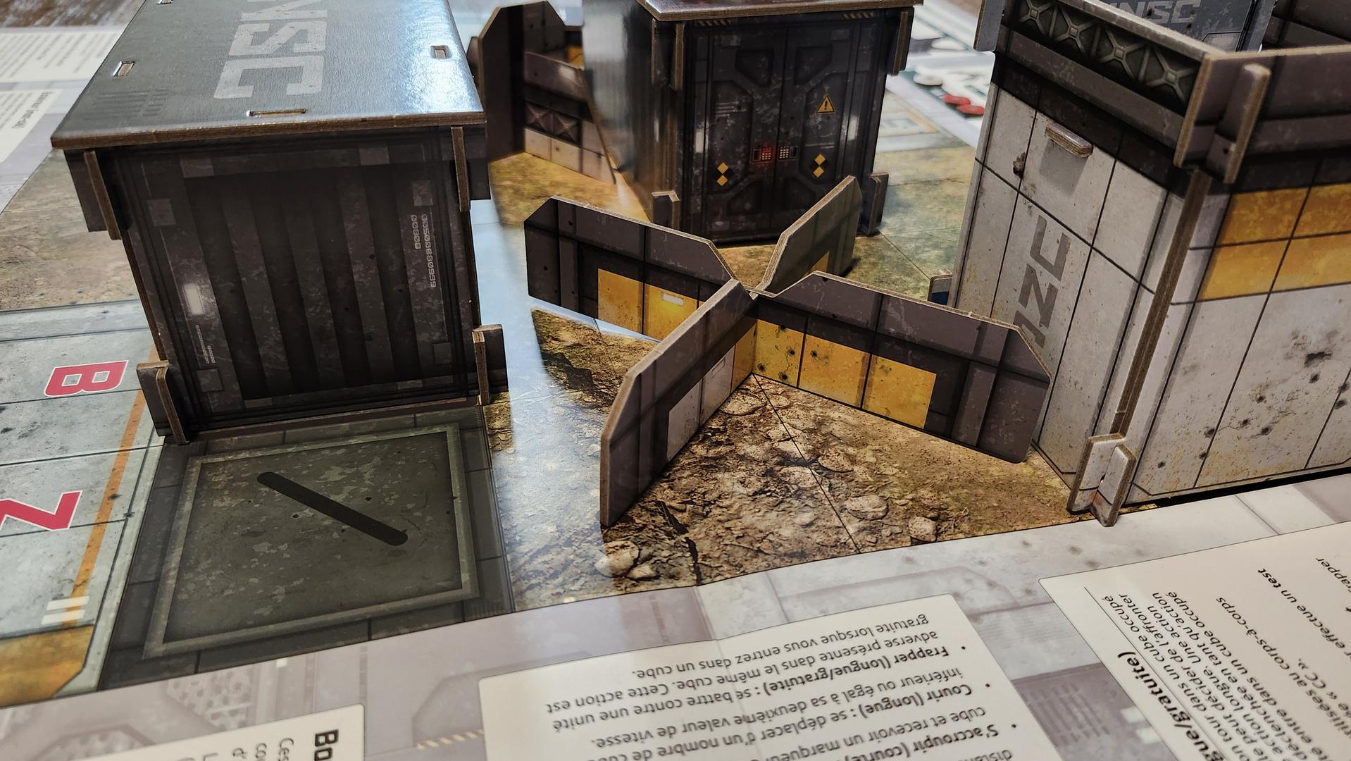 D’un autre côté, c’est le reste des règles qui est parfois trop complexe. Et si la première partie nous permettait de facilement nous repérer grâce aux aide-mémoire imprimés sur le plateau, ce fut très différent pour les parties suivantes. Dans cette section de ma critique, je vais parler plus en détail des règles. Je vais vous parler de ce que j’ai aimé et de ce que j’ai moins aimé en commençant par les déplacements. À ce niveau, le jeu est assez clair. Bien que cinq pages du livret de règle soient consacrées uniquement aux déplacements, ce n’est pas le point qui nous a le plus causé de problèmes. Pour vous déplacer, il faut bouger de façon orthogonale, c’est-à-dire en n’empruntant pas les diagonales. Si un mur se trouve sur votre chemin, vous devez le contourner. Il est possible de passer par-dessus les petites barricades et d’escalader les éléments 3D, comme les conteneurs, les caisses et la tour de guet. Toutefois, il arrive que certains éléments soient placés de façon à ce que l’espace disponible pour circuler soit restreint. Si vous disposez d’au moins un demi cube pour vous déplacer, vous pouvez circuler librement, mais si l’espace est réduit, vous devrez discuter avec votre adversaire en début de partie afin de déterminer les endroits que vous considérez comme franchissables.