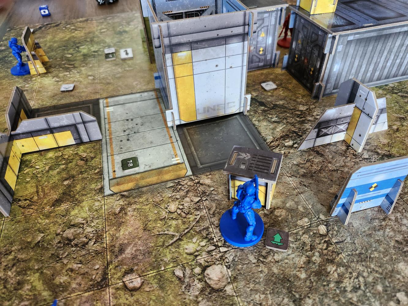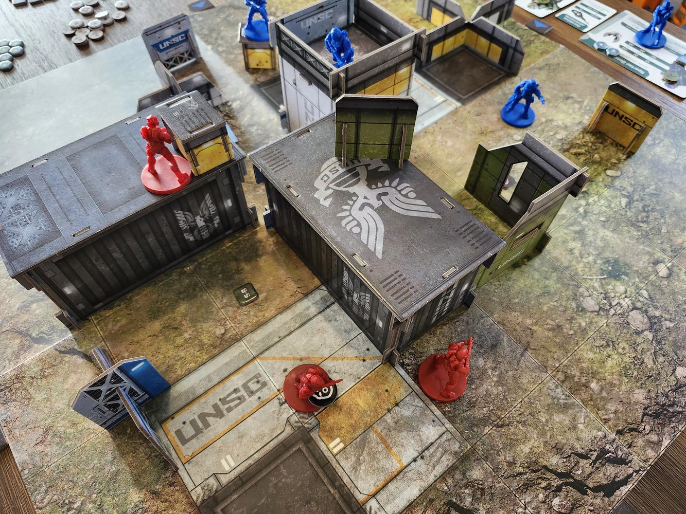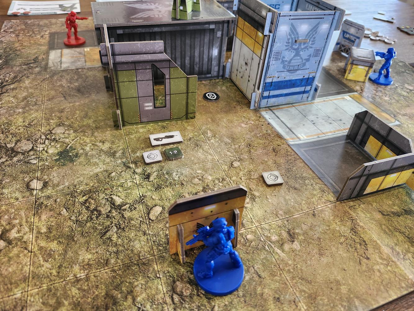Une chose que j’ai trouvé très intéressante est que chaque partie est unique. En plus de choisir parmi l’un des cinq modes de jeu, vous aurez l’occasion de personnaliser la partie lors de la préparation du plateau. Vous commencerez par installer les éléments 3D, comme les barricades, les conteneurs, la tour de guet et les caisses. Pour cette partie de la préparation, nous avons toujours privilégié le drafting. C’est-à-dire que, à tour de rôle, nous choisissions des éléments à mettre en place sur le plateau. Ainsi, chaque joueur a l’opportunité de placer des éléments d’une manière qu’il pense avantageuse pour son équipe. Le résultat était toujours très bien équilibré et personne n’avait l’impression d’avoir été désavantagé lors du placement. De plus, le résultat était toujours unique et nous poussait à essayer de nouvelles choses en superposant des éléments de jeu pour créer des positions tactiques toujours plus surprenantes les unes que les autres. Les objets, eux aussi, varient d’une partie à l’autre. En roulant les dés, vous déterminez la rangée et la colonne dans laquelle placer les objets. Chaque objet nécessite son jet de dé et le résultat, même s’il n’était pas aussi équilibré que les éléments 3D, était généralement satisfaisant.