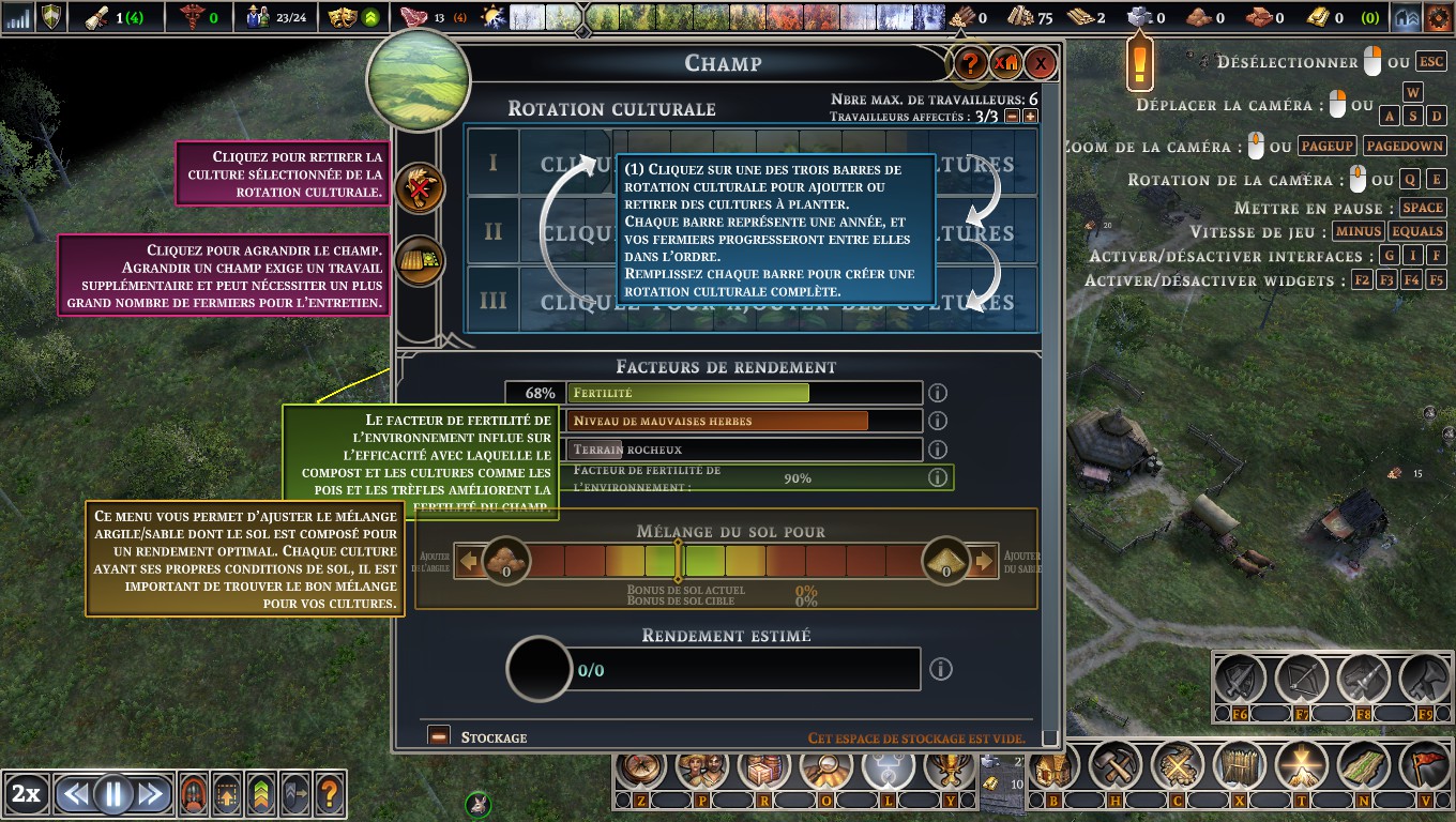 La force de Farthest Frontier tient dans un écosystème où chaque geste en entraîne un autre. On ne “pose” pas des bâtiments, on orchestre des chaînes qui se répondent. L’agriculture en est le socle: la fertilité d’un champ, encombré de pierres et de mauvaises herbes, varie avec son ratio sable/argile et impose d’adapter les cultures plutôt que d’appliquer une recette universelle. La rotation devient un art d’équilibre entre rendements et conservation: les céréales se gardent mieux, mais fatiguent certains sols, tandis que les légumes, plus fragiles, exigent un assolement réfléchi. Comme la nourriture se gâte, les greniers, fumoirs et boulangeries ne sont pas des raffinements tardifs, mais des amortisseurs qui conditionnent votre premier hiver.