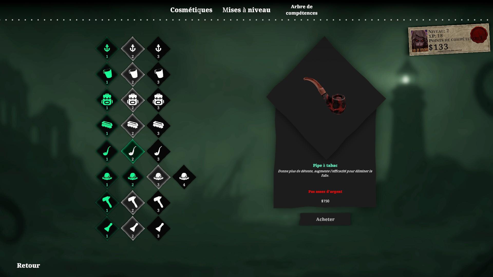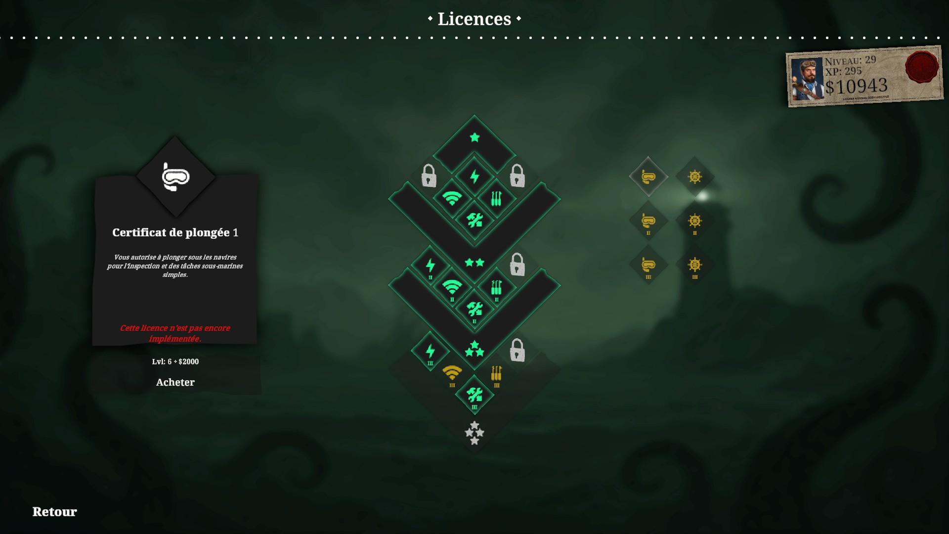 Dans Sunken Engine, vous gagnez de l’expérience chaque fois que vous accomplissez une tâche de réparation ou de nettoyage et vous pouvez obtenir des points de compétence en gagnant un niveau. Diverses possibilités s’offrent à vous, telles que réduire la vitesse de croissance de la jauge de folie, gagner plus d’argent en complétant des contrats, augmenter les chances de pêcher un poisson rare et bien d’autres.
