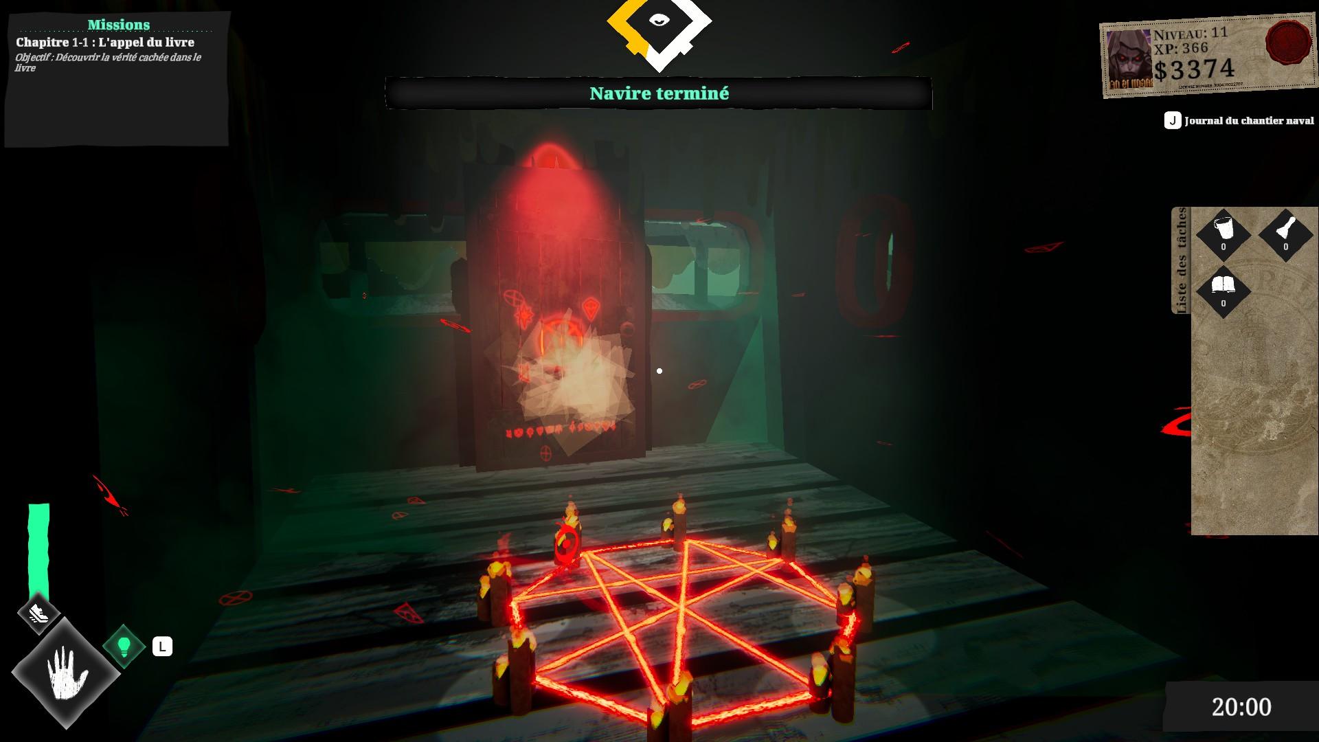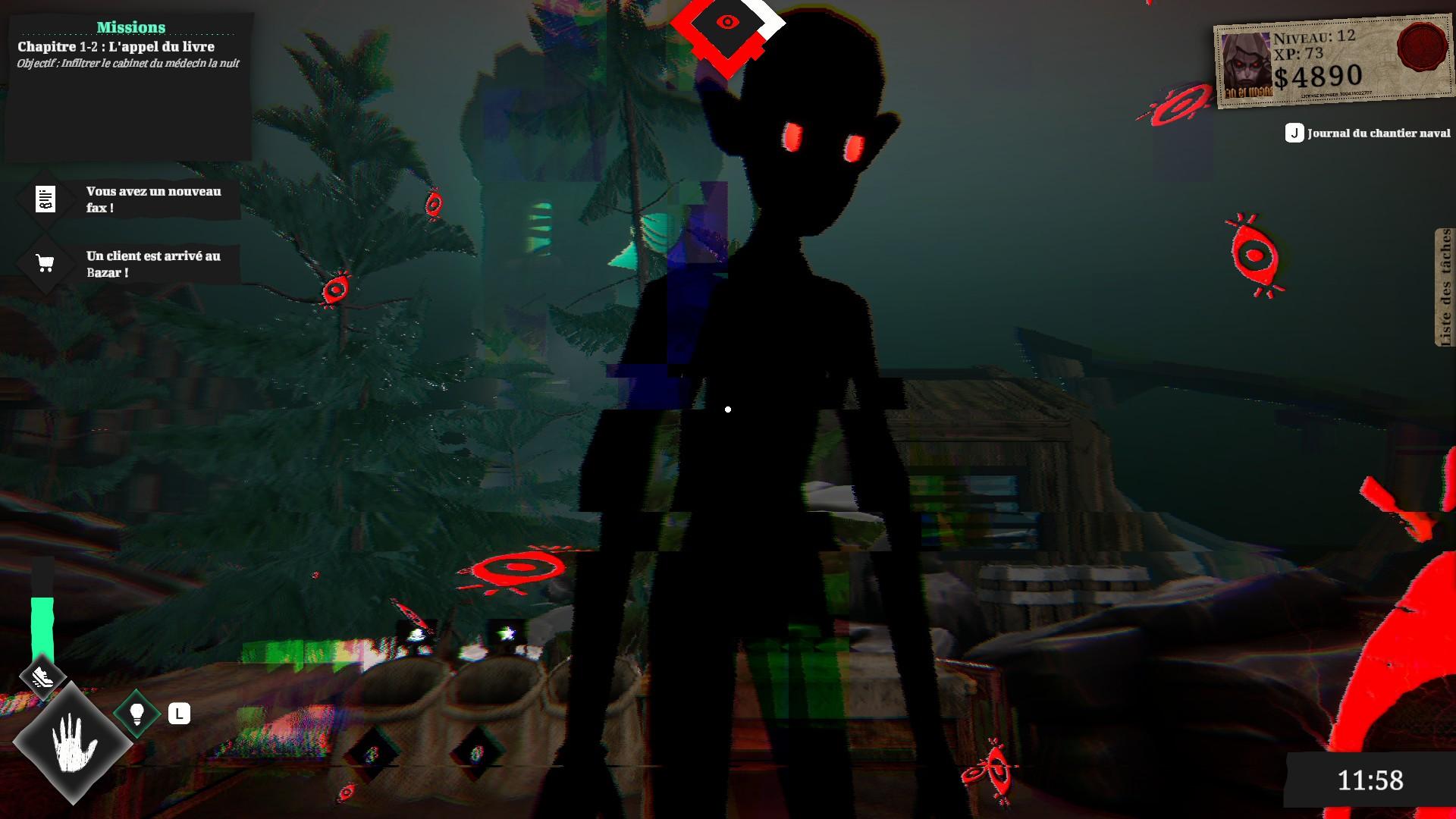 Par contre, les journées défilent rapidement et à partir de 20h00, le temps s’arrête, l’ambiance devient lugubre et mystérieuse. À ce moment, vous ne recevrez plus de contrat et votre commerce sera fermé. Vous pourrez continuer à pêcher et finir votre contrat en cours, mais il se peut que des choses étranges arrivent pendant ce temps et que votre jauge de folie augmente. Pour vous calmer, vous pourrez toujours aller au bar afin de boire un verre et recevoir un bon massage. Il est aussi possible de jouer aux dés pour gagner un peu d’argent.