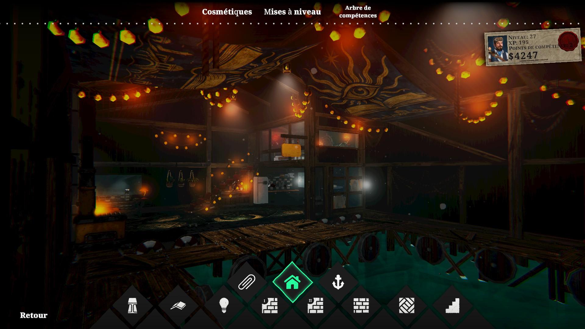 J’ai toujours aimé les jeux qui nous permettent de faire de la personnalisation et dans Sunken Engine, c’est le cas. Vous pouvez personnaliser votre chambre ainsi que le chantier naval, que ce soit en changeant le look des murs et du plancher ou en ajoutant des éléments décoratifs. Je trouve certains designs assez beaux! Pour ce qui est des améliorations, vous pouvez en acheter afin d’agrandir votre port pour pouvoir accueillir de plus gros navires ou avoir des outils plus performants pour votre travail au chantier. Vous débloquerez de nouveaux outils en faisant l’achat de différents permis de réparation à la mairie.