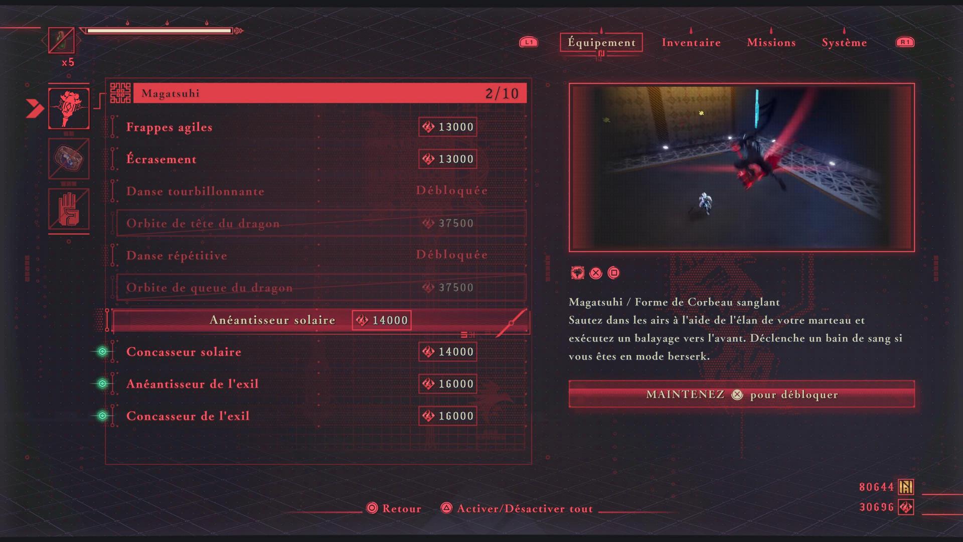 De plus, en effectuant des parades parfaites ou des esquives, vous pouvez déclencher de puissantes contre-attaques. Les attaques spéciales et les contre-attaques peuvent être déverrouillées en dépensant la monnaie obtenue dans le jeu. Vous commencerez le jeu avec les attaques de base soit carré pour les attaques rapides et triangle pour les attaques lourdes. En déverrouillant des attaques, vous pourrez ajouter des mouvements uniques, tels que « Haut », « Bas », « Carré » ou encore « Rotation » et « Triangle », et bien d’autres. En général, ce sont des combinaisons simples à retenir et à exécuter, ce que j’ai beaucoup aimé. Elles sont les mêmes pour toutes les armes et peuvent être exécutées dans le mode « Corbeau » comme dans le mode « Standard ».
