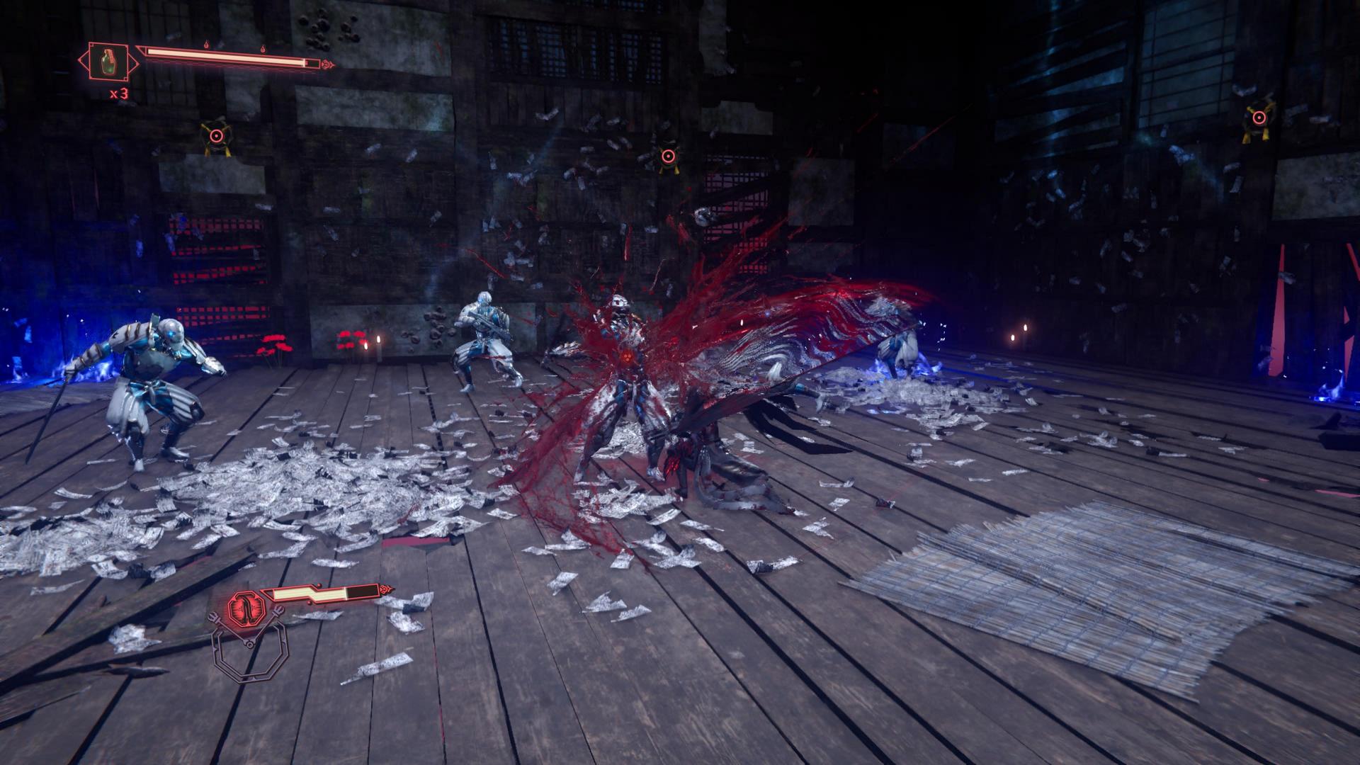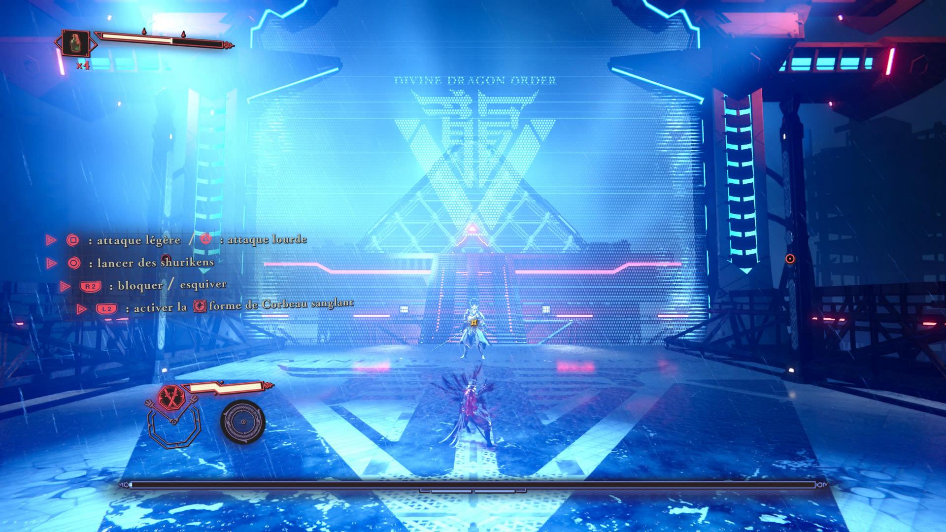 Parlant du mode « Corbeau », c’est un mode de combat qui s’enclenche en appuyant sur la touche « L2 ». Ce mode de combat consomme votre jauge de sang, mais délivre des attaques beaucoup plus puissantes. Dans ce mode, les armes se transforment, les attaques deviennent en général plus lentes, mais elles gagnent en portée et en puissance. Basculer entre le mode de combat « Standard » et le mode « Corbeau » est au cœur même des combats. De plus, certaines attaques ne peuvent être bloquées que lorsque le mode « Corbeau » est activé. Dans ce mode, toutes les attaques sont impressionnantes et leur puissance n’est pas à négliger.