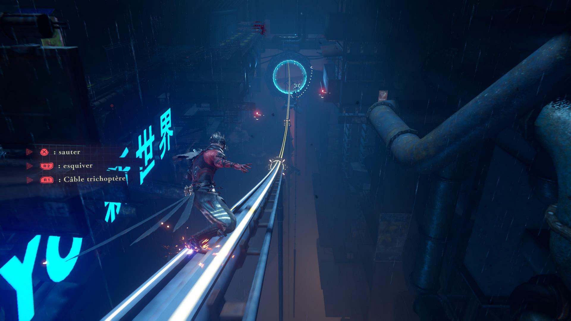 Lorsque l’on parle du design des niveaux, Ninja Gaiden 4 n’est pas une référence. Vous vous contenterez de passer d’un combat à l’autre dans des niveaux très linéaires avec très peu de possibilités d’exploration. Il y a quelques secrets, mais ceux-ci sont rares et souvent assez visibles. Heureusement, même si les niveaux sont très peu inspirés dans leur design, les décors sont variés et les déplacements sont plutôt amusants. En effet, vous marcherez très rarement d’un endroit à l’autre. La majorité du temps, vous vous balancerez d’un endroit à l’autre avec votre grappin, vous courrez ou sauterez sur les murs, vous planerez dans les courants d’air et vous ferez du surf sur les surfaces submergées. Les déplacements sont vraiment très ludiques et viennent briser la monotonie. Sans ce système de déplacements, les périodes mortes entre les combats seraient très ennuyeuses. Heureusement, Ninja Gaiden 4 ne se contente pas de vous faire marcher, il vous fait voler.
