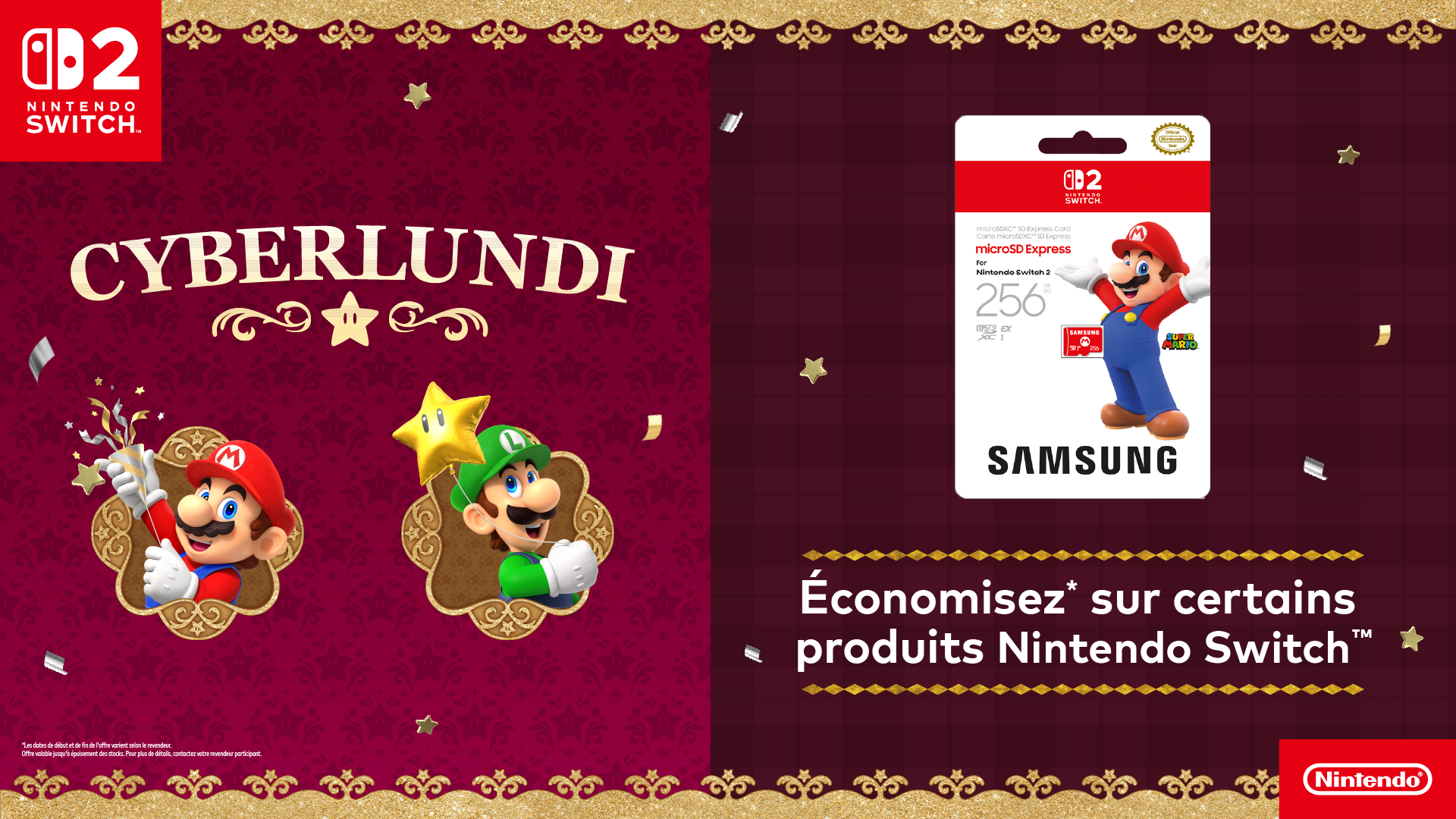 - Enfin, à partir du 30 novembre chez certains détaillants, prolongez la magie des Fêtes avec une réduction de 25 $ sur le prix de détail suggéré des cartes microSD Express de Samsung et obtenez un espace de stockage supplémentaire pour plus de jeux sur Nintendo Switch 2.
