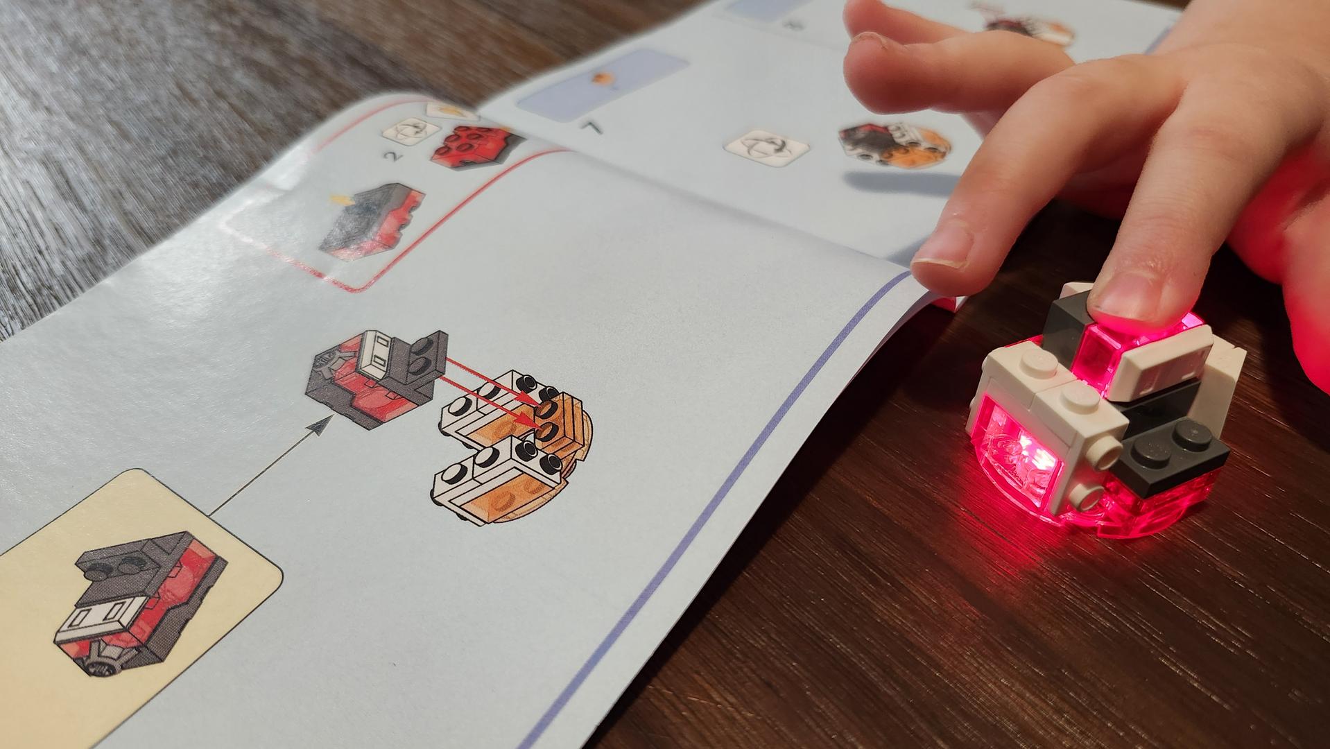 Bien évidemment, elle a voulu commencer par fabriquer le chien robot. J’ai alors étalé les pièces sur la table et nous nous sommes mis au travail. Dès le départ, rien n’indique que vous êtes en train de travailler sur un animal. Le début de la construction est un peu vague, mais les choses se matérialisent rapidement. Vous vous retrouverez vite avec ce qui semble être un corps et une queue et c’est à ce moment-là que ces yeux se sont illuminés. « C’est la queue du pitou! » m’a-t-elle dit avec enthousiasme. S’en est rapidement suivi l’installation du cœur qui s’illumine au grand bonheur de ma fille. C’est à ce moment que j’ai compris que le robot chien serait probablement plus amusant que je l’aurais cru.