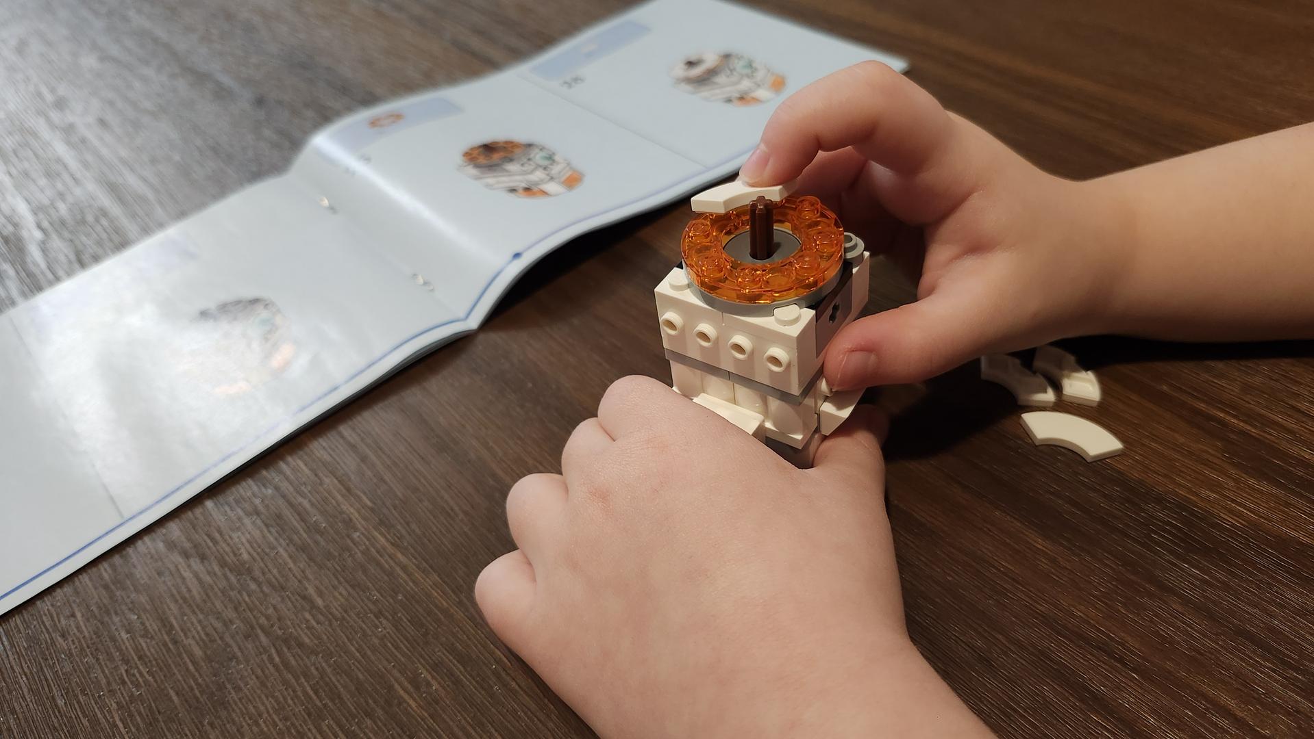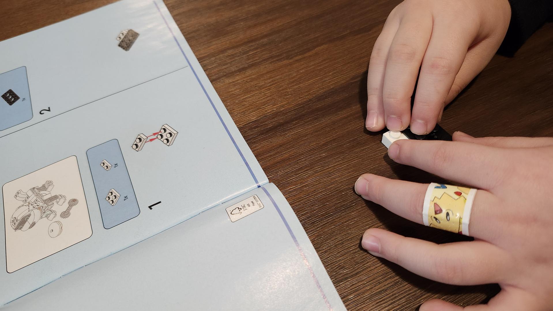 Le guide n’est pas aussi simple que c’est destiné aux très jeunes enfants, alors ma fille a eu besoin d’un peu d’aide pour bien interpréter certains placements de pièces. Par contre, elle a été capable de le construire les trois ensembles toute seule dans leur quasi-totalité. Le plus complexe est assurément le moment où les toutes petites pièces noires doivent être assemblées pour fabriquer les chenilles du robot ou la réalité que, puisque c’est un ensemble trois en un, tous les morceaux seront sortis de leurs sacs lors de votre deuxième et troisième construction, ce qui rend la recherche de pièces plus ardue.