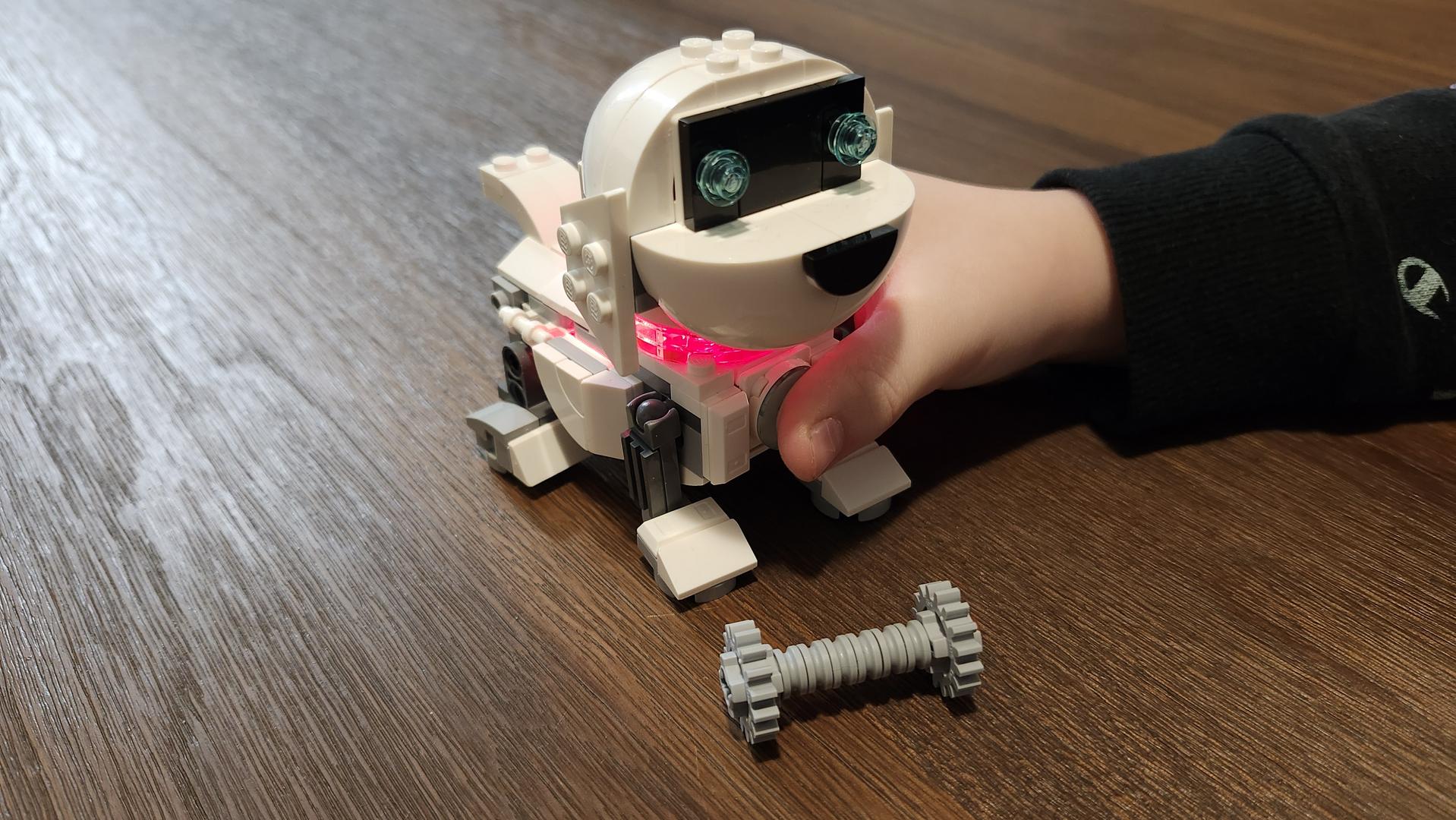 Dès que le cœur fut installé, la construction commença à avoir du sens. Chaque pièce ajoutée nous rapprochait du moment où nous pourrions jouer avec notre nouvel ami. Le cœur qui s’illumine est une belle touche, mais c’est lorsque la tête sera complétée que votre ami à quatre pattes commencera à prendre vie. Puis, ce sera le tour des pattes, puis des accessoires, et, enfin, vous pourrez jouer avec votre chien robot. Cependant, j’ai été un peu déçu par le fait que trop de pièces étaient inutilisées lors de cette construction. Le modèle aurait pu être plus gros si plus des pièces présentes avaient pu être intégrées.