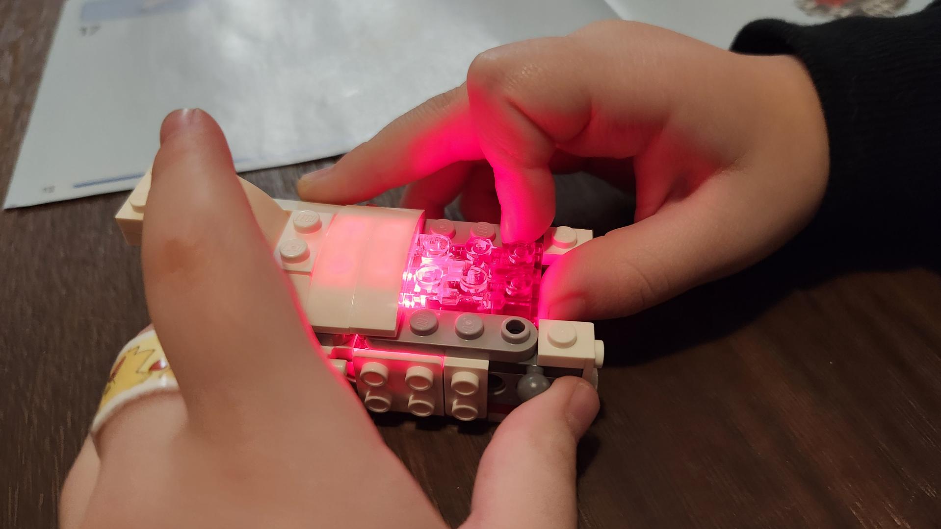 Notre deuxième construction fut la fusée. Après avoir joué avec le chien pendant quelques jours, il était temps de fabriquer le deuxième ensemble. Des trois, c’est le plus facile à fabriquer. Pour celui-ci, ma fille n’a pas eu besoin de moi pour l’assemblage. Je me suis alors contenté de trouver les pièces pour elle puisque, encore une fois, la fusée n’utilise qu’une petite partie de l’ensemble des pièces pour la fabrication. Rapidement, vous insérerez la brique lumineuse qui sera éventuellement activée en appuyant sur le nez de la fusée.