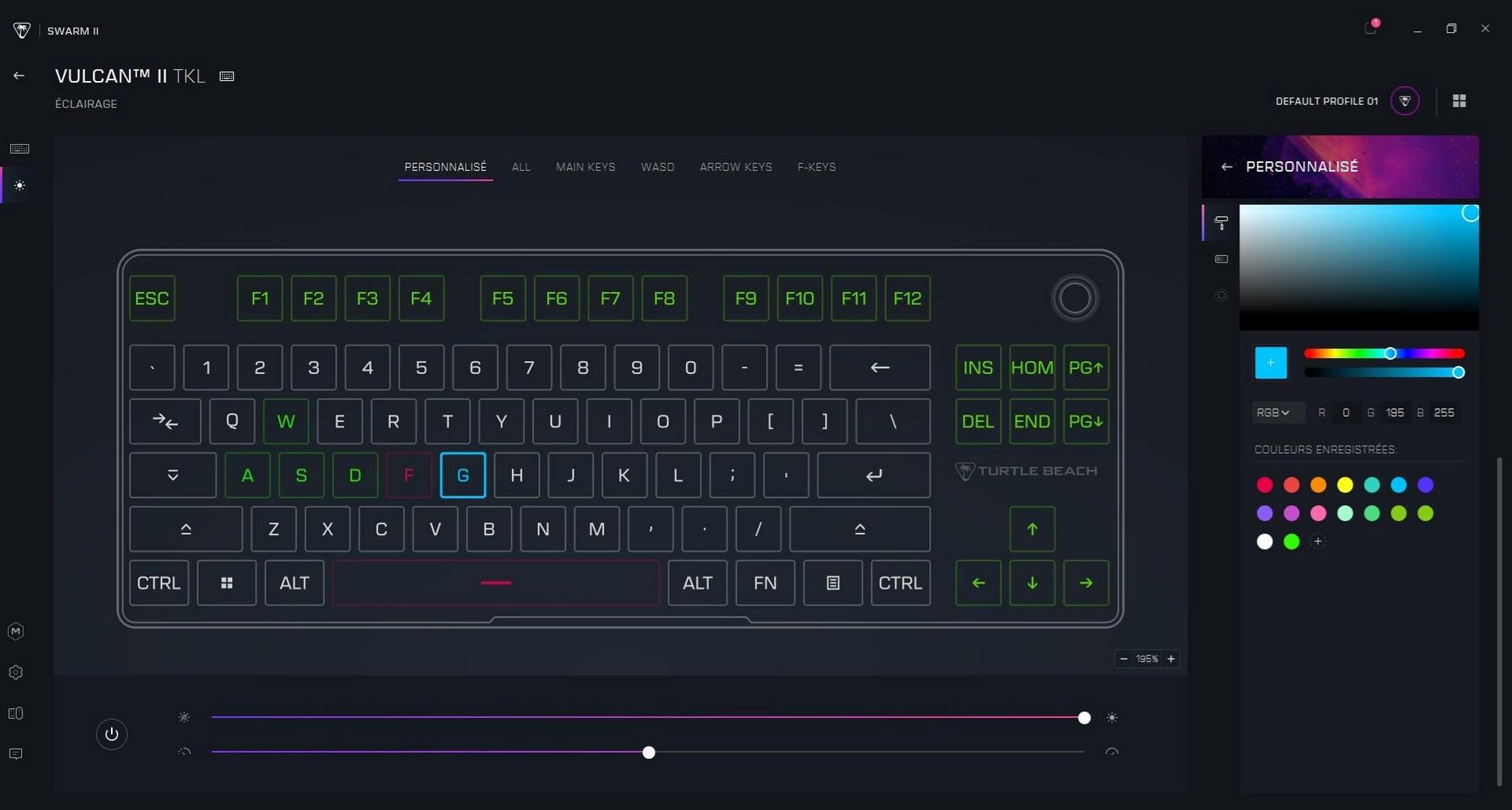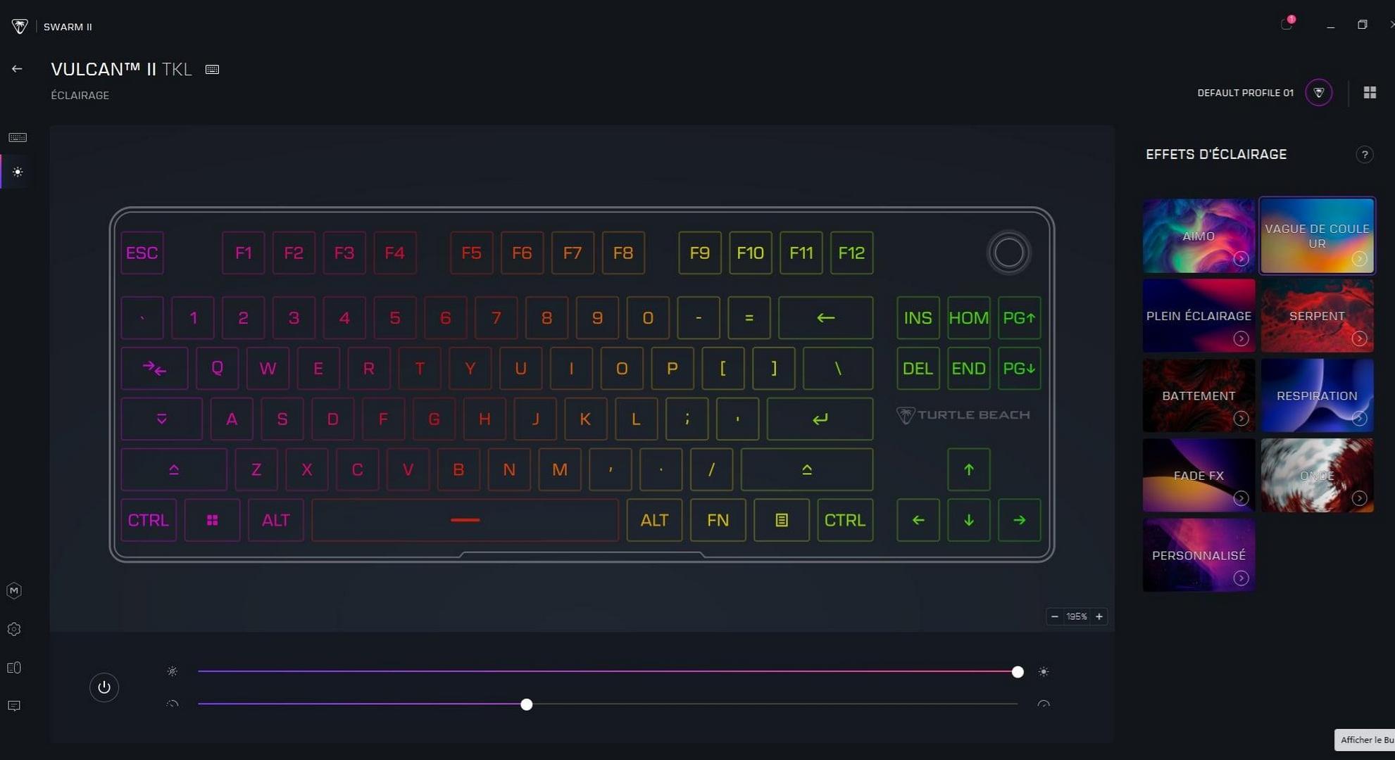 Grâce à l’application Swarm II, on peut modifier l’éclairage RGB du clavier. Par défaut, un effet de vagues multicolores traverse les touches, mais il est possible de personnaliser l’effet, la couleur ou même chaque touche individuellement. On peut passer d’un dégradé, à un effet de fondu en passant par un éclairage fixe. Mais là où ce système brille le plus, selon moi, est qu’il est possible de changer la couleur de chaque touche de façon individuelle. Si je veux que mes touches de déplacements soient vertes, que ma touche d’action soit rouge et que les touches inutiles soient d’un ton plus foncé, je peux le faire. Pouvoir créer ce genre de profil d’éclairage est aussi utile qu’amusant.
