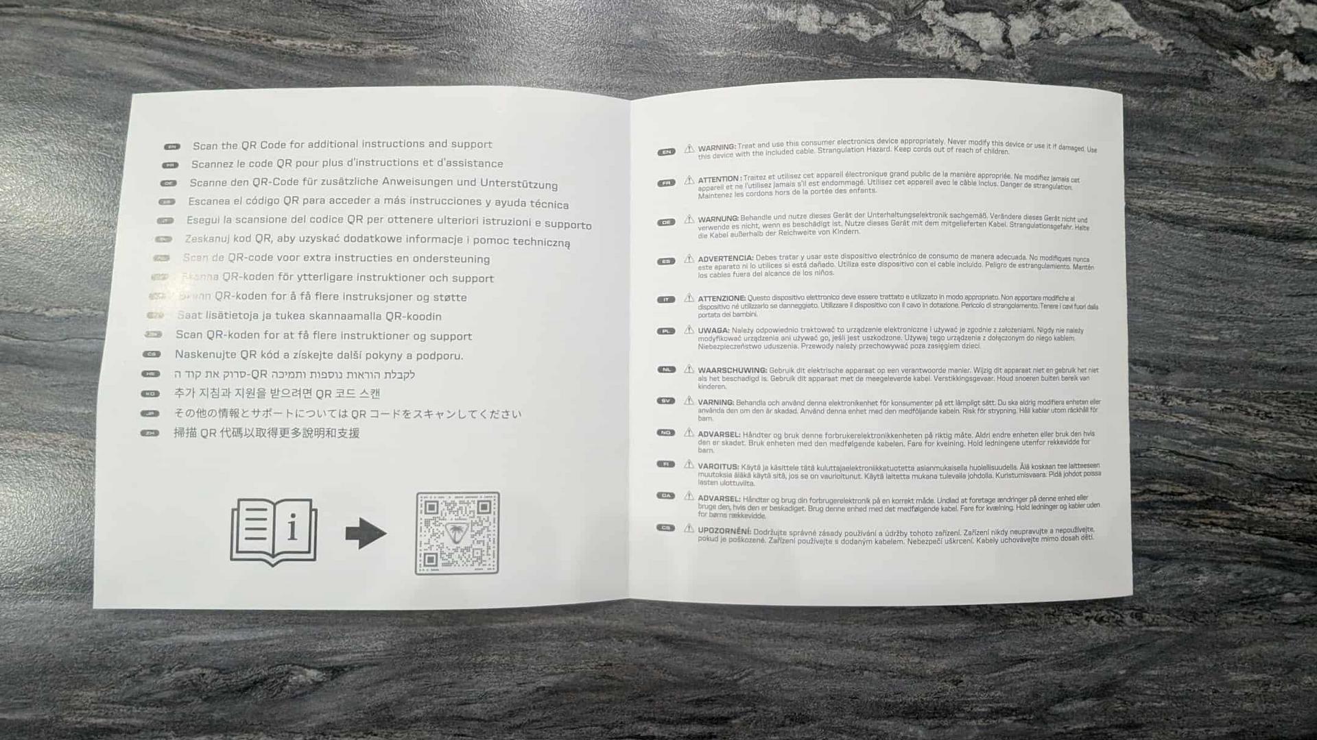 Sous le clavier, on retrouve uniquement le manuel d’instruction qui est, comme à l’habitude, très peu utile. Celui-ci présente un code QR menant à un guide complet, mais le livret en lui-même contient surtout des avertissements en de nombreuses langues, au lieu d’informations pratiques. Bref, la présentation du produit est sobre, élégante et professionnelle, à l’image de la marque. Le seul point faible demeure le manuel, qui gagnerait à être remplacé par une version 100 % numérique ou du moins une version papier mieux optimisée pour offrir de vraies instructions pratiques.