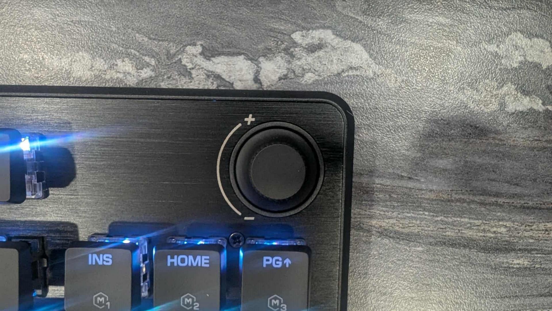 Dans le coin supérieur droit, on retrouve une molette permettant de contrôler le volume du PC ou du casque. Pour l’instant, je joue sur PC avec mon casque d’écoute Atlas Air (vous pouvez en voir ma critique ici) et celui-ci propose d’ajuster le volume en tournant la molette placée sur l’une des coques du casque. Sur la majorité des autres casques, il est aussi possible d’ajuster le volume grâce à un bouton ou une roulette sur le placé à même le casque. Voilà pourquoi je trouvais l’ajout d’un bouton de volume sur le clavier un peu inutile, mais, à force de l’utiliser, je confirme que l’utilité de ce bouton est tout à fait justifiée. La modification du volume peut se faire rapidement et très intuitivement grâce à son positionnement optimal. C’est facile d’accès, et à l’écart des autres touches. Une simple pression permet aussi de couper le son instantanément. C’est particulièrement pratique si vous n’utilisez pas de casque d’écoute, mais, même avec un casque, j’ai aimé cette fonction.