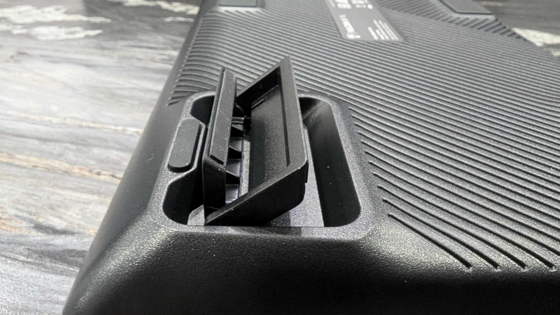 Sous la majorité des claviers, on retrouve de petites béquilles pour surélever légèrement le haut du clavier pour que celui-ci prenne un certain angle pour accommoder les gens qui n’aiment pas avoir un clavier complètement à plat. On retrouve habituellement une hauteur de béquille unique, mais le Vulcan II TKL propose une béquille double, qui permet de choisir entre deux hauteurs pour encore plus de confort.