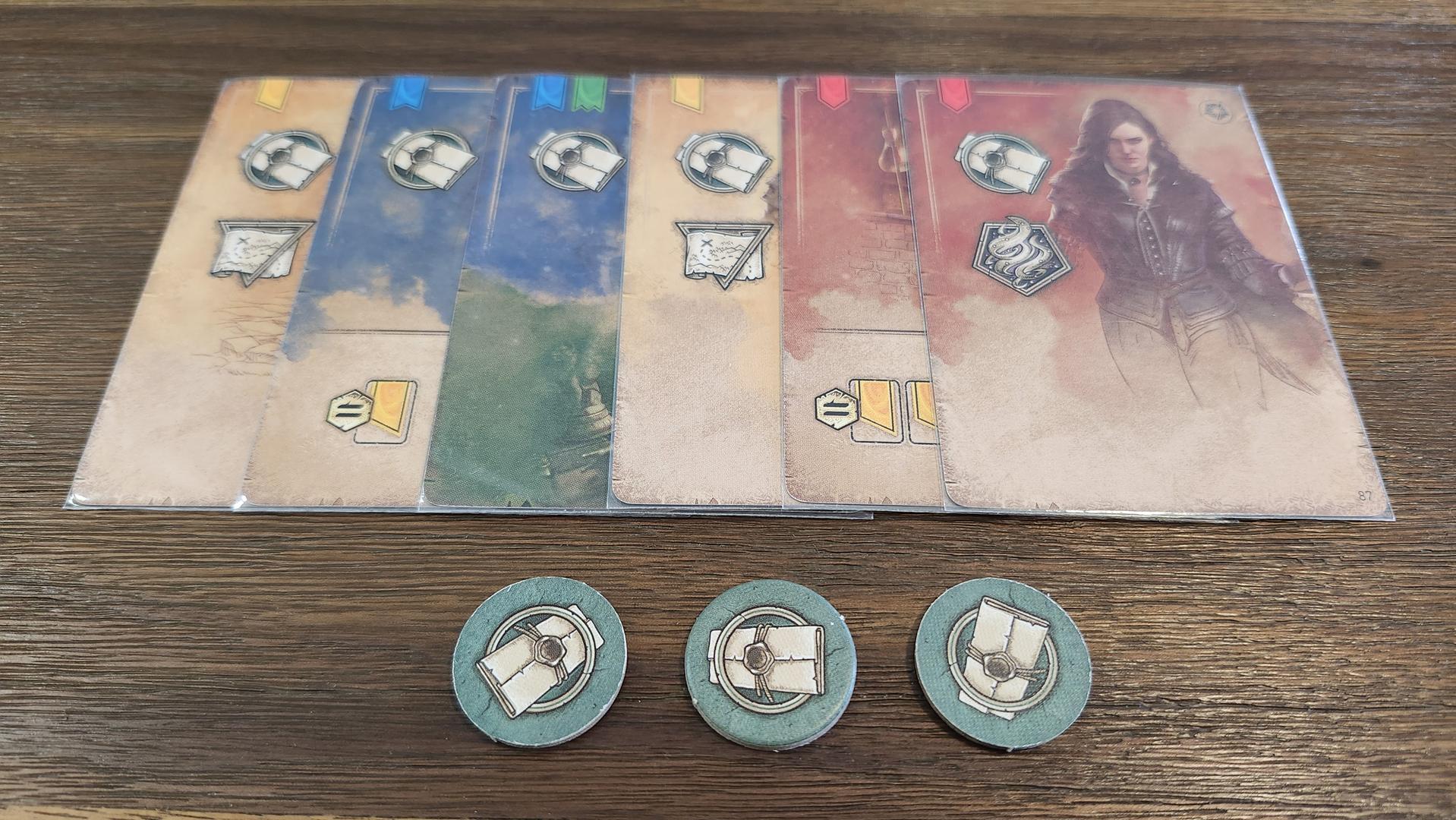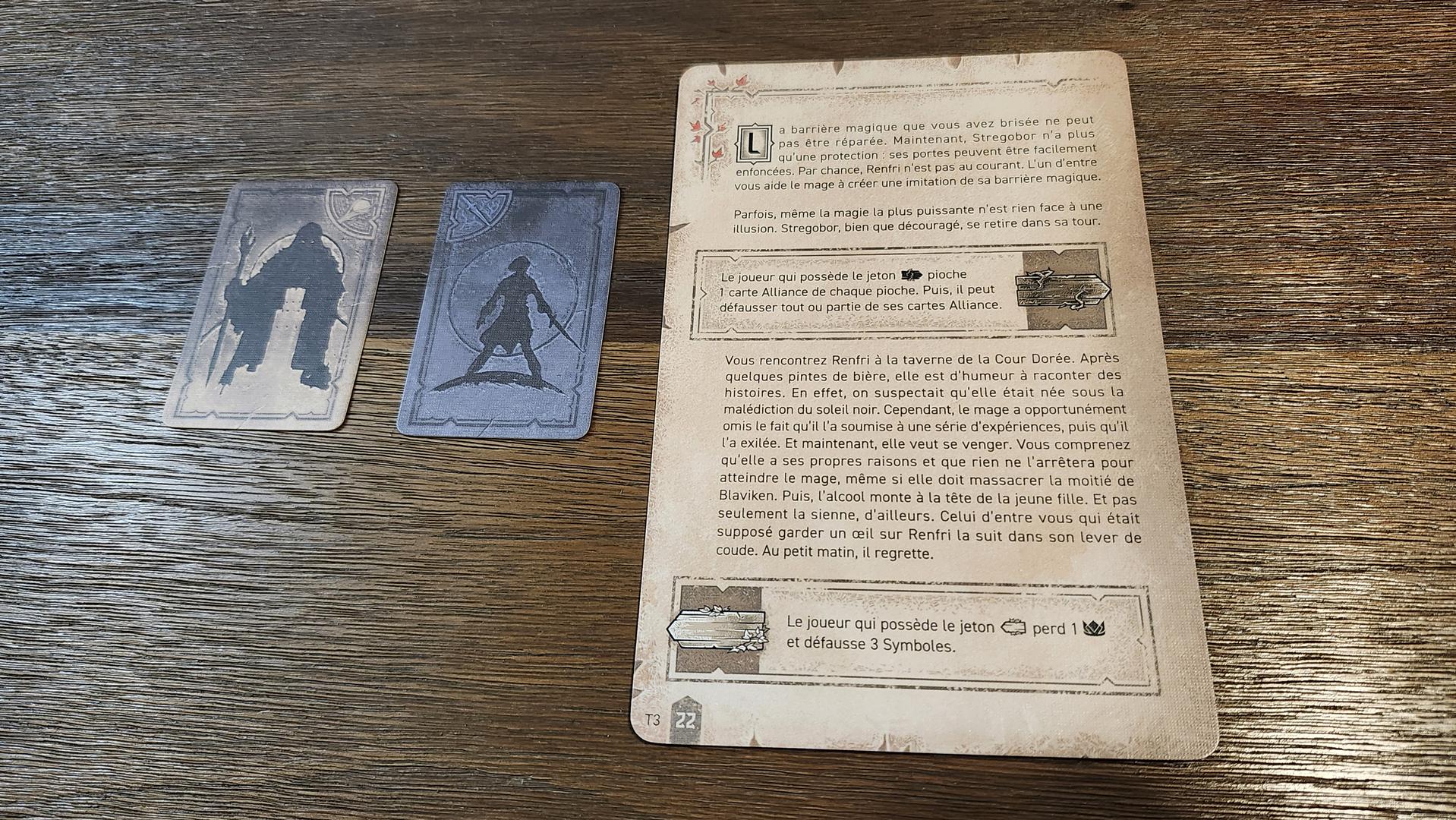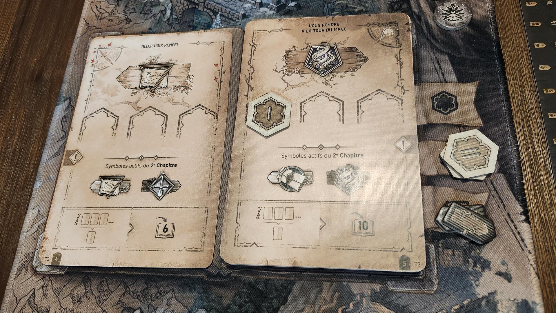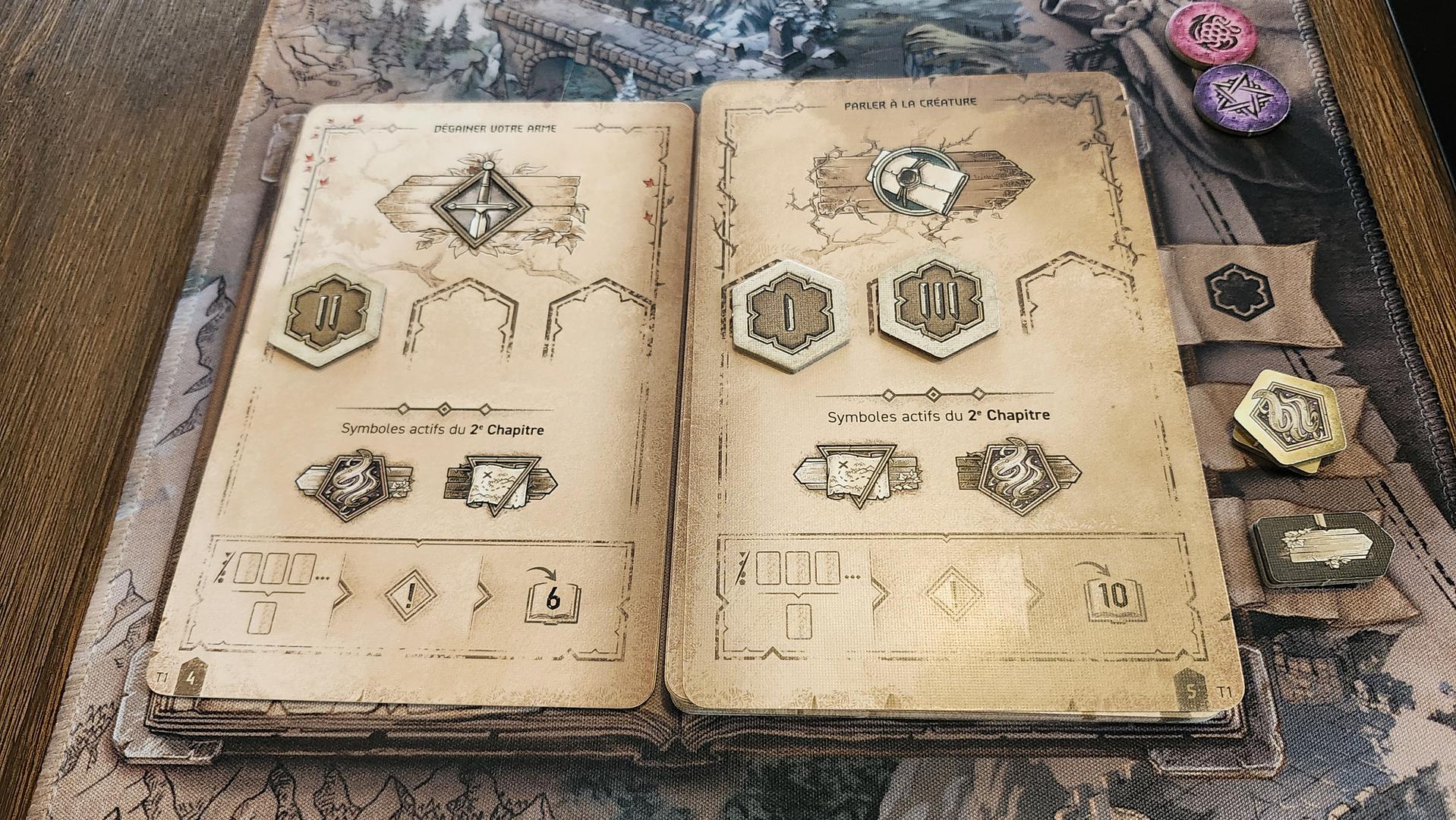 Ce qui s’approche le plus du jeu vidéo est la trame narrative qui dirige le jeu. Dans la boite, vous aurez accès à trois scénarios, soit Le Bout du Monde, La Strige et Le Moindre Mal. Chacun de ces scénarios a ses particularités, comme des objectifs secrets ou des bonus d’alliance, mais ils sont essentiellement les mêmes. La trame narrative raconte une histoire sortie tout droit de l’univers de The Witcher, mais, en réalité, c’est plus une excuse pour raconter une histoire entre les tours plutôt qu’un élément essentiel. La façon dont cette partie du jeu fonctionne est que, à chaque ronde, les joueurs doivent accumuler des symboles dans leur tableau qui correspondent aux symboles actifs de l’histoire. Le jeu comporte quatre symboles et ceux présents sur les pages du livre sont considérés comme étant les symboles actifs, tandis que les deux autres sont les symboles inactifs. À la fin de chaque tour, les joueurs feront le décompte de leurs symboles. Au bout de trois tours, si la majorité des joueurs ont principalement les symboles présents sur la page de droite, ce sera cette option narrative qui sera choisie et le contraire s’applique. À ce moment, chaque symbole actif gagnant présent sur votre tableau vous rapportera un point de victoire et chaque symbole actif perdant vous rapportera un point d’expérience, tandis que les symboles inactifs ne rapportent rien du tout. Vous irez alors à la page indiquée pour continuer le récit et entamer la deuxième ronde. Bien qu’il soit amusant de lire un récit en jouant, vous baserez rarement, voire jamais, votre stratégie sur les choix narratifs. Que le texte vous permette de choisir entre un affrontement ou une enquête n’affectera jamais votre décision. Ce sont les symboles qui sont importants, point final. Le texte n’est là que pour tenter de faire coller le thème au jeu et ça fonctionne plus ou moins.