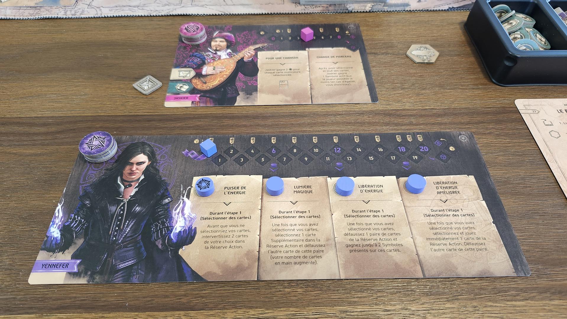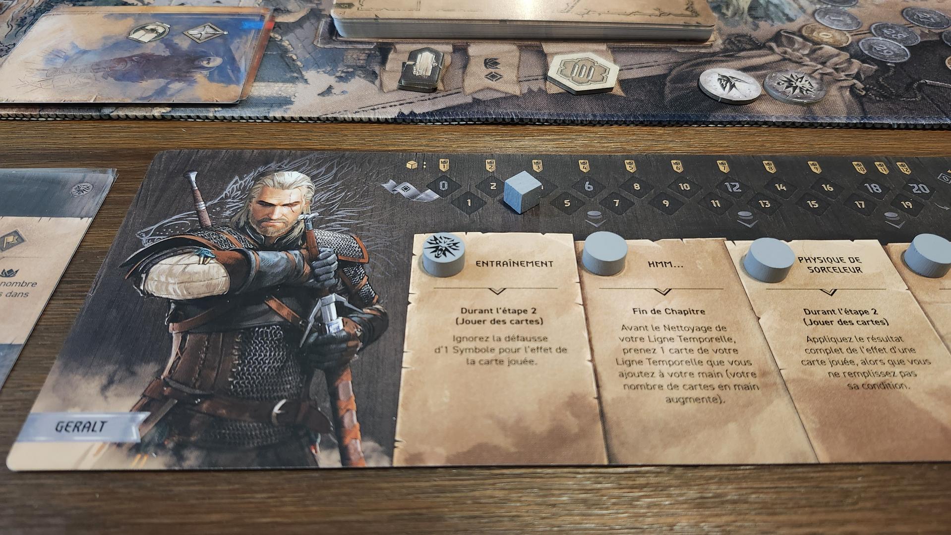 Premièrement, parlons tout d’abord de l’éléphant dans la pièce. Je ne peux évidemment pas parler d’un jeu portant ce titre sans parler de la thématique. Puisque les principales raisons qui vous donneront envie de vous le procurer sont son titre et sa superbe boite, il est important de mentionner qu’il ne s’agit que d’une illusion. Ce que je veux dire par là est que la thématique n’est tout simplement pas représentée à travers les mécaniques de jeu. Certes, vous incarnerez des personnages de l’univers du jeu vidéo, mais aucune des actions que vous effectuerez n’est en lien avec l’univers de The Witcher et les figurines ne servent qu’à marquer l’ordre des tours. Après tout, il s’agit d’un tableau builder dans lequel vous faites correspondre des symboles. Il n’y a pas de combats, pas de magie, pas de potions ni d’aventures épiques, seulement des symboles sur des cartes.
