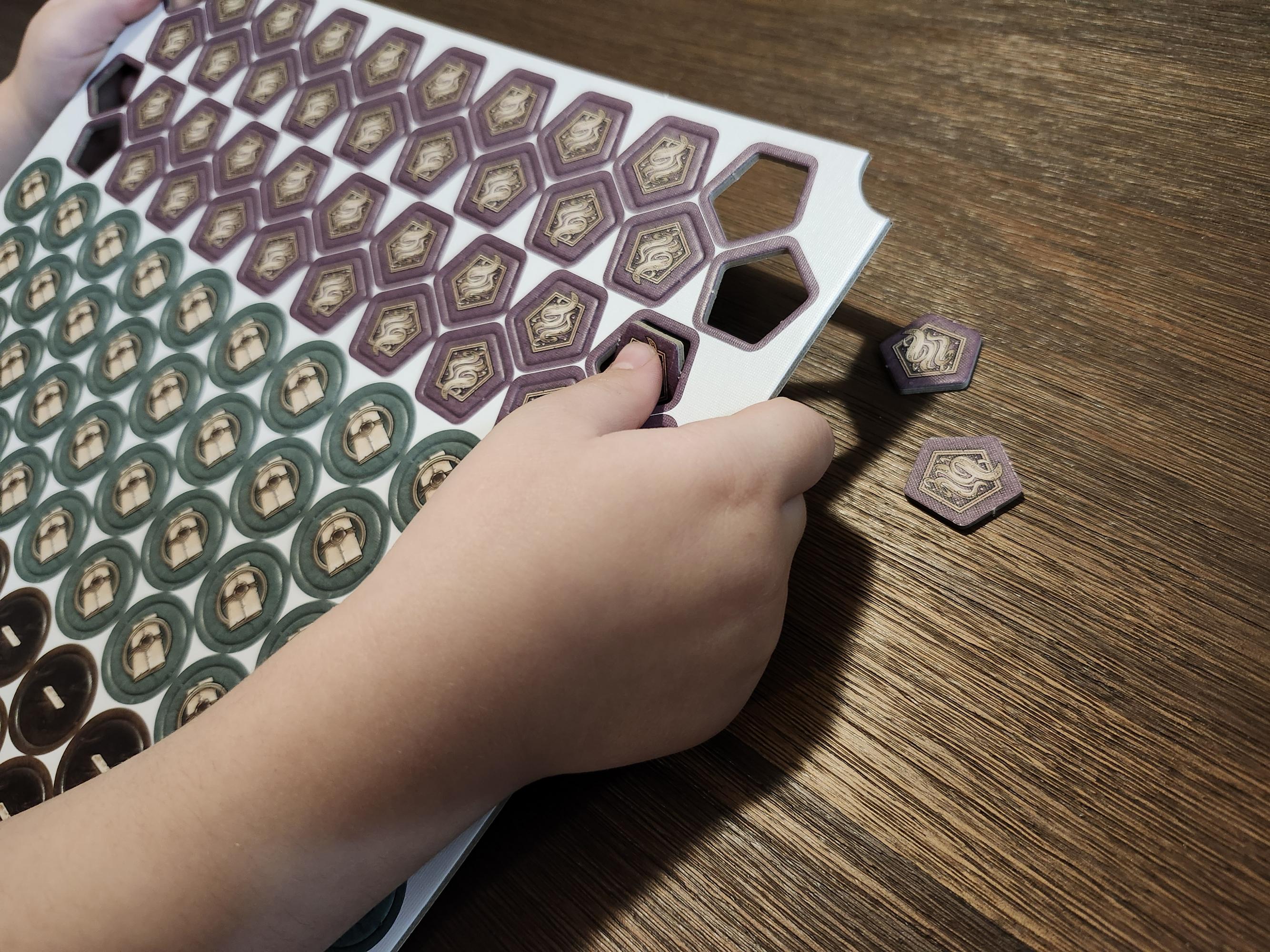 Comme à l’habitude, j’ai profité du déballage pour passer du temps de qualité avec ma fille. Pendant que je révise les règles et que je découvre le jeu, elle s’affaire à « puncher » les jetons. Depuis qu’elle a deux ans, c’est l’une de ses activités préférées. Elle prépare tous les jetons, elle les classe par formes et par couleurs et les place dans des petits sacs de plastique pour le rangement. Elle a classé plus d’une centaine de jeux depuis ses débuts et elle est toujours impatiente d’ouvrir une nouvelle boite. Comme quoi même vos jeunes enfants peuvent s’amuser avec les jeux de votre collection! Dans mon cas, je lui ai appris à compter avec les dés et les jetons, je lui ai appris ses formes, ses couleurs et le principe du tri. La faire manipuler des pièces de jeu de cette façon lui a permis de développer un intérêt envers les jeux de société et cela me permettra éventuellement d’avoir une partenaire avec laquelle partager ma passion!