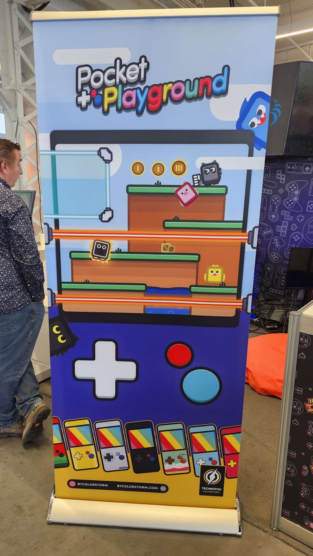 Pocket Playground est un jeu développé par ColorStorm. Il s’agit de leur premier jeu mobile multijoueur conçu pour des matchs de mini-jeux ultras rapides jusqu’à quatre joueurs. Conçu avec une interface de style « Game Boy » pour des commandes classiques, nostalgiques et accessibles. Nous avons pu affronter les créateurs (je crois qu’ils nous ont laissé des chances) et notre fille de cinq ans est immédiatement tombée sous le charme. Les graphismes sont colorés, la jouabilité est simple, mais efficace et l’optimisation pour les différents appareils présentés était plutôt épatante. Il s’agit d’un jeu parfait pour les pauses au travail ou les moments d’attentes. Les parties sont rapides et le mode multijoueur fonctionne à merveille. Se connecter à une partie ne prend que quelques secondes et les matchs durent environ deux minutes. Notre mode de jeu favori est le roi de la montagne, mais notre fille a adoré le mode « collection de pièces ».