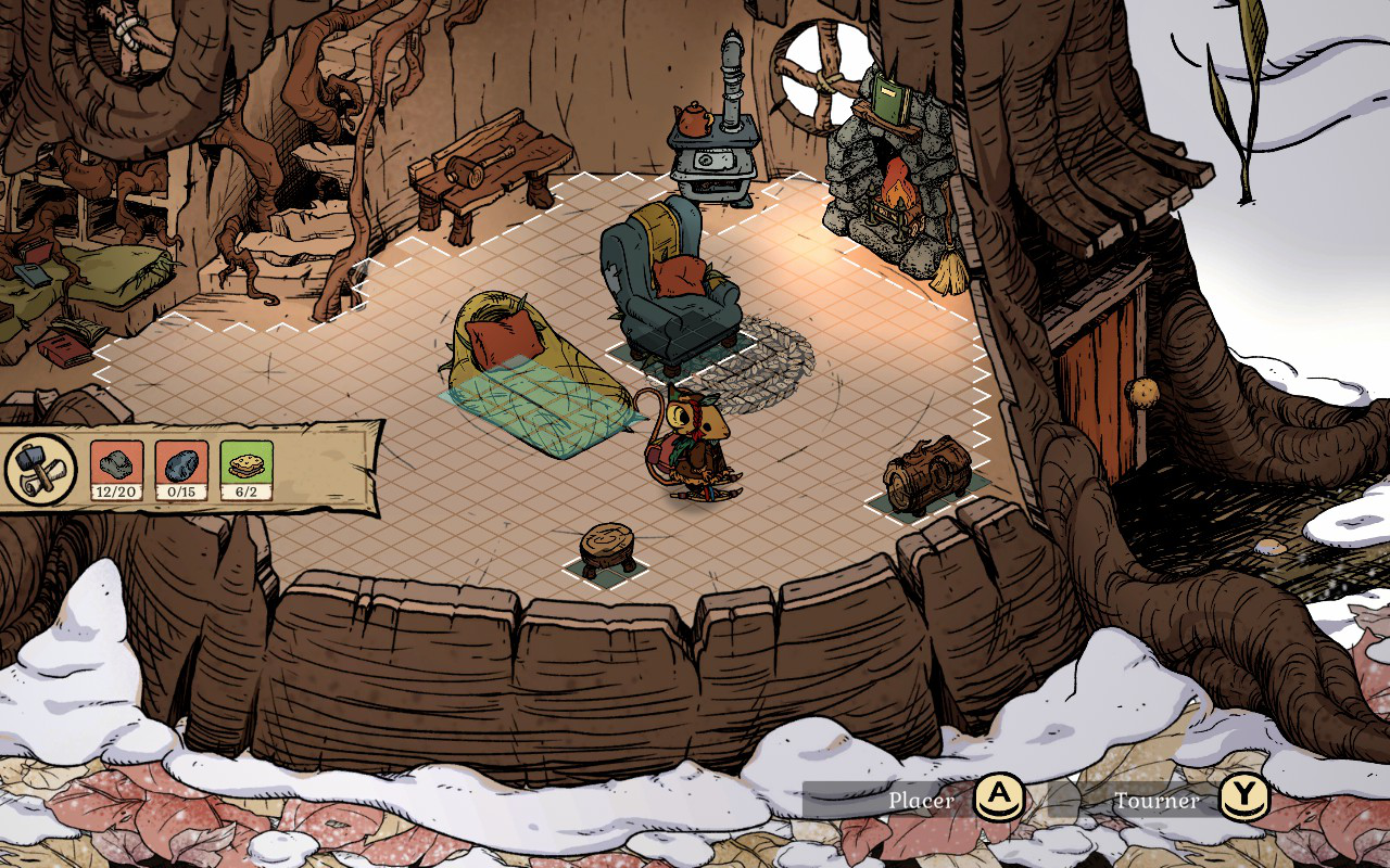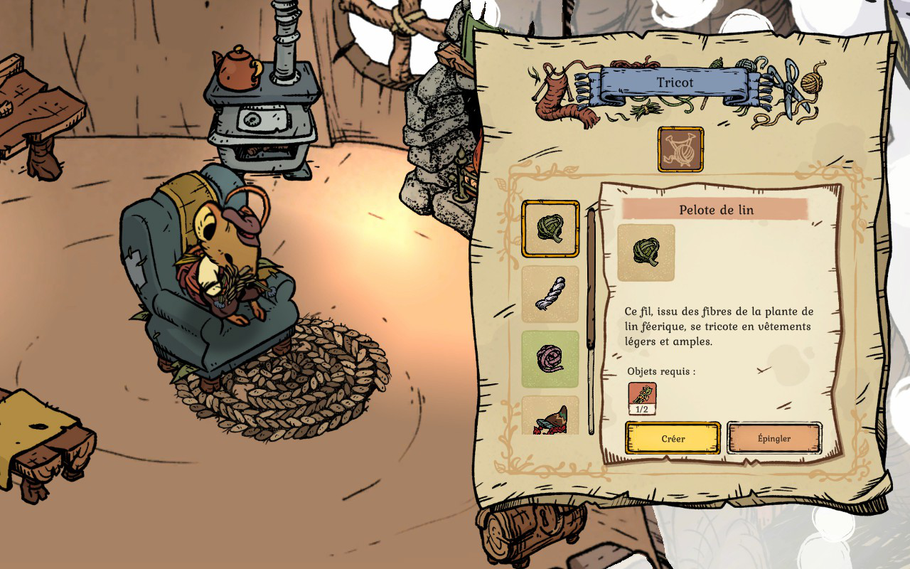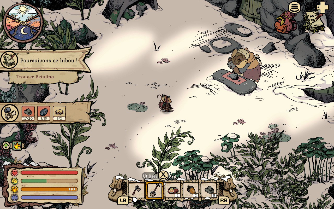 En commençant, vous allez très vite remarquer que l’hiver et le froid rendront votre aventure périlleuse. Plus vous explorez et plus vous vous éloignez de votre maison, plus vous devez trouver des façons de rester au chaud. Il est possible de vous réchauffer en allumant des petits feux un peu partout où vous allez. Vous devez les fabriquer et en garder un sur vous en tout temps quand vous partez plus loin de chez vous, sinon vous avez peu de chances de rester en vie. Ces feux vous permettent aussi de vous reposer pour passer la nuit. Vous aurez aussi la possibilité de vous réchauffer près d’un PNJ. Cependant, vous ne pouvez pas vous reposer à ces endroits. Vous devrez aussi rapidement vous tricoter des chandails et des habits qui garderont votre souris au chaud plus longtemps. Le côté survie est assez bien fait et j’aime comment le tout fonctionne et la logique derrière chaque mécanique de jeu. On doit vraiment se préoccuper de ces éléments pour pouvoir survivre, sinon on succombe au froid assez rapidement.