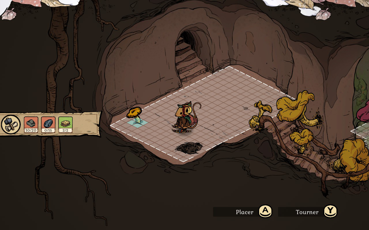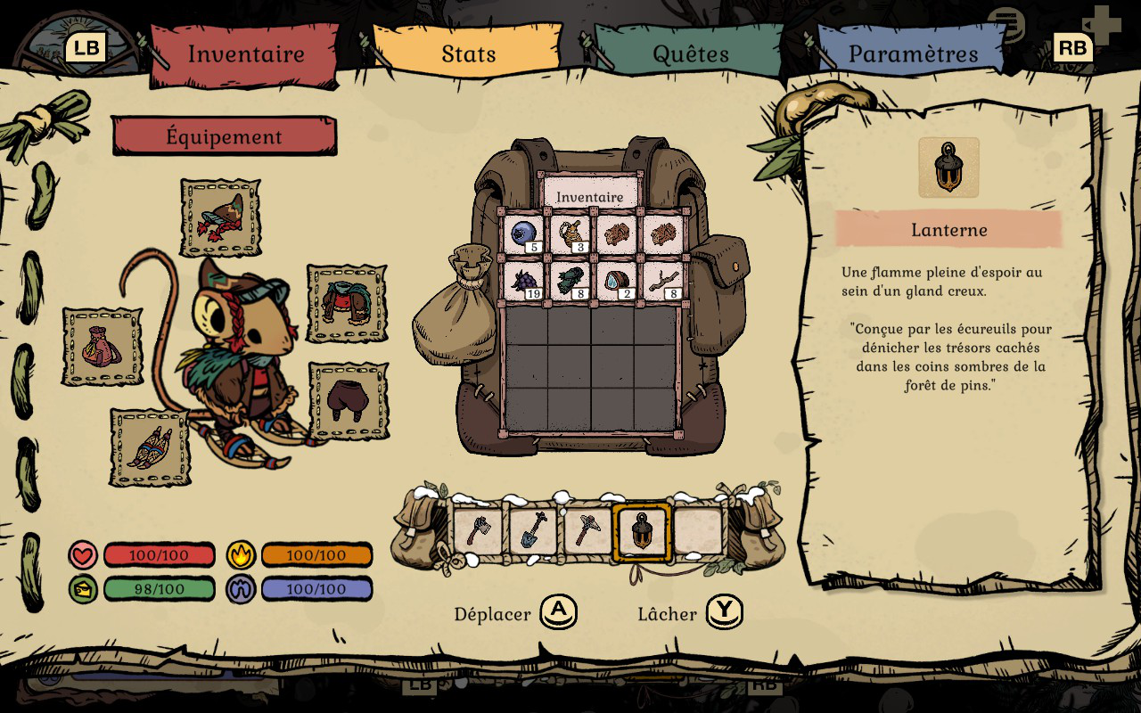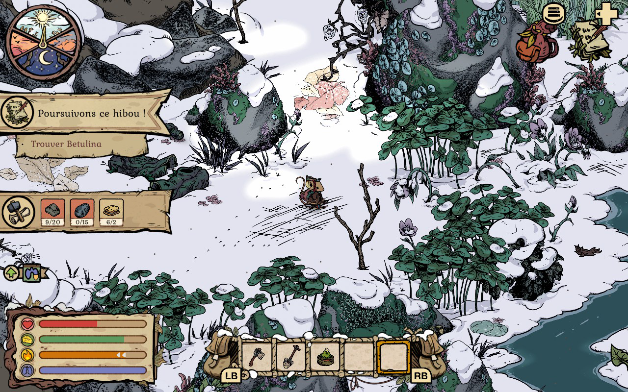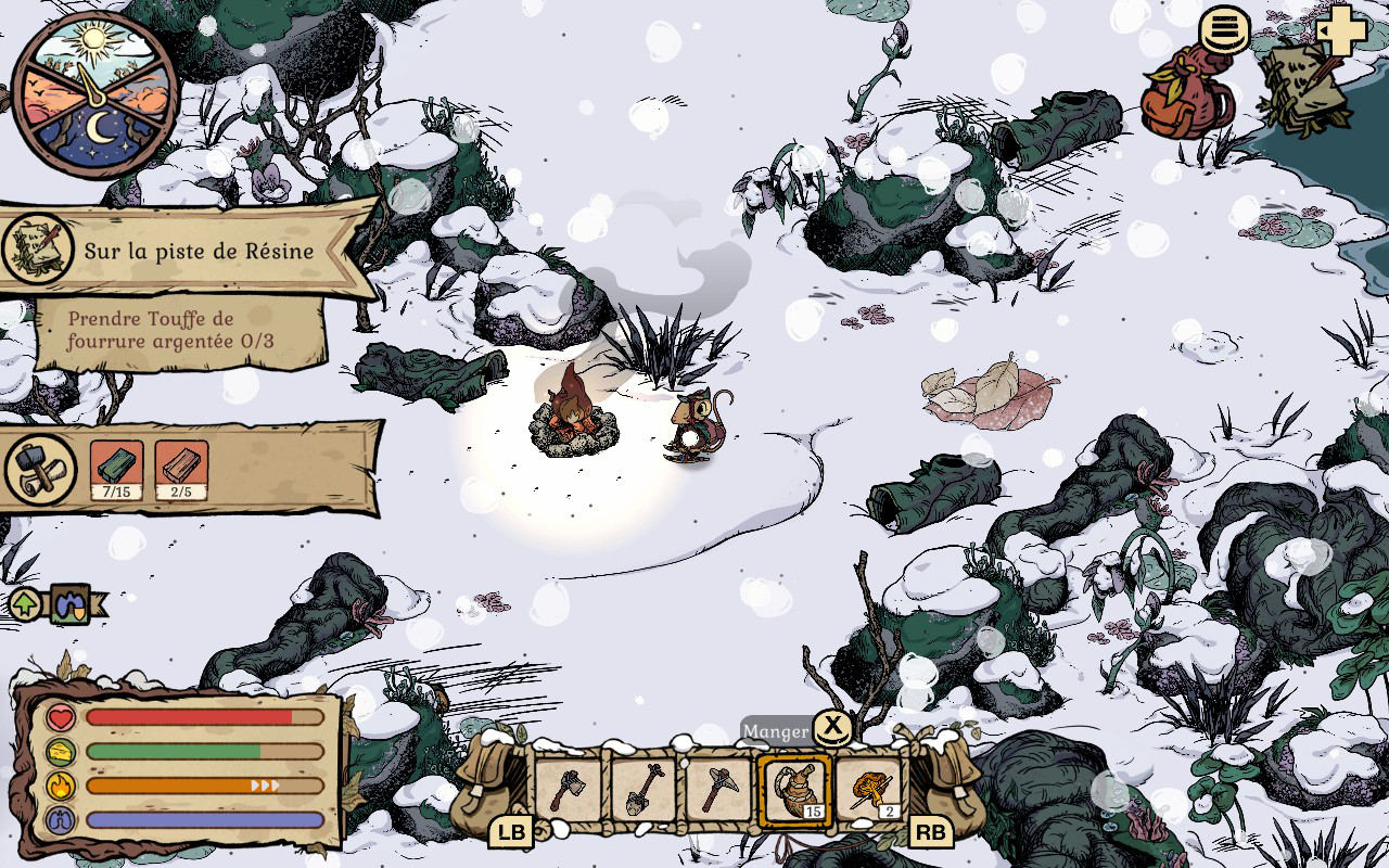 En commençant, vous allez très vite remarquer que l’hiver et le froid rendront votre aventure périlleuse. Plus vous explorez et plus vous vous éloignez de votre maison, plus vous devez trouver des façons de rester au chaud. Il est possible de vous réchauffer en allumant des petits feux un peu partout où vous allez. Vous devez les fabriquer et en garder un sur vous en tout temps quand vous partez plus loin de chez vous, sinon vous avez peu de chances de rester en vie. Ces feux vous permettent aussi de vous reposer pour passer la nuit. Vous aurez aussi la possibilité de vous réchauffer près d’un PNJ. Cependant, vous ne pouvez pas vous reposer à ces endroits. Vous devrez aussi rapidement vous tricoter des chandails et des habits qui garderont votre souris au chaud plus longtemps. Le côté survie est assez bien fait et j’aime comment le tout fonctionne et la logique derrière chaque mécanique de jeu. On doit vraiment se préoccuper de ces éléments pour pouvoir survivre, sinon on succombe au froid assez rapidement.