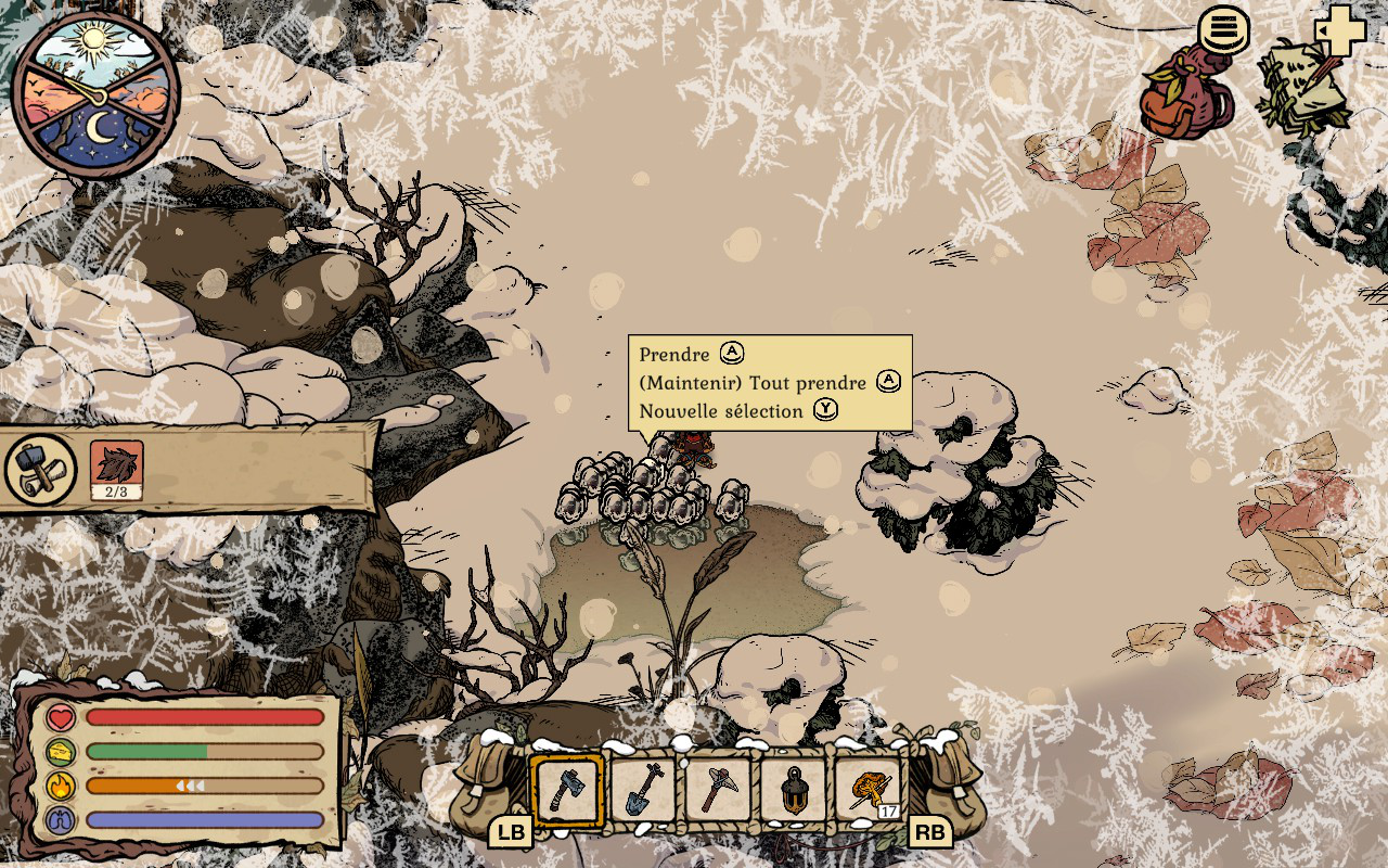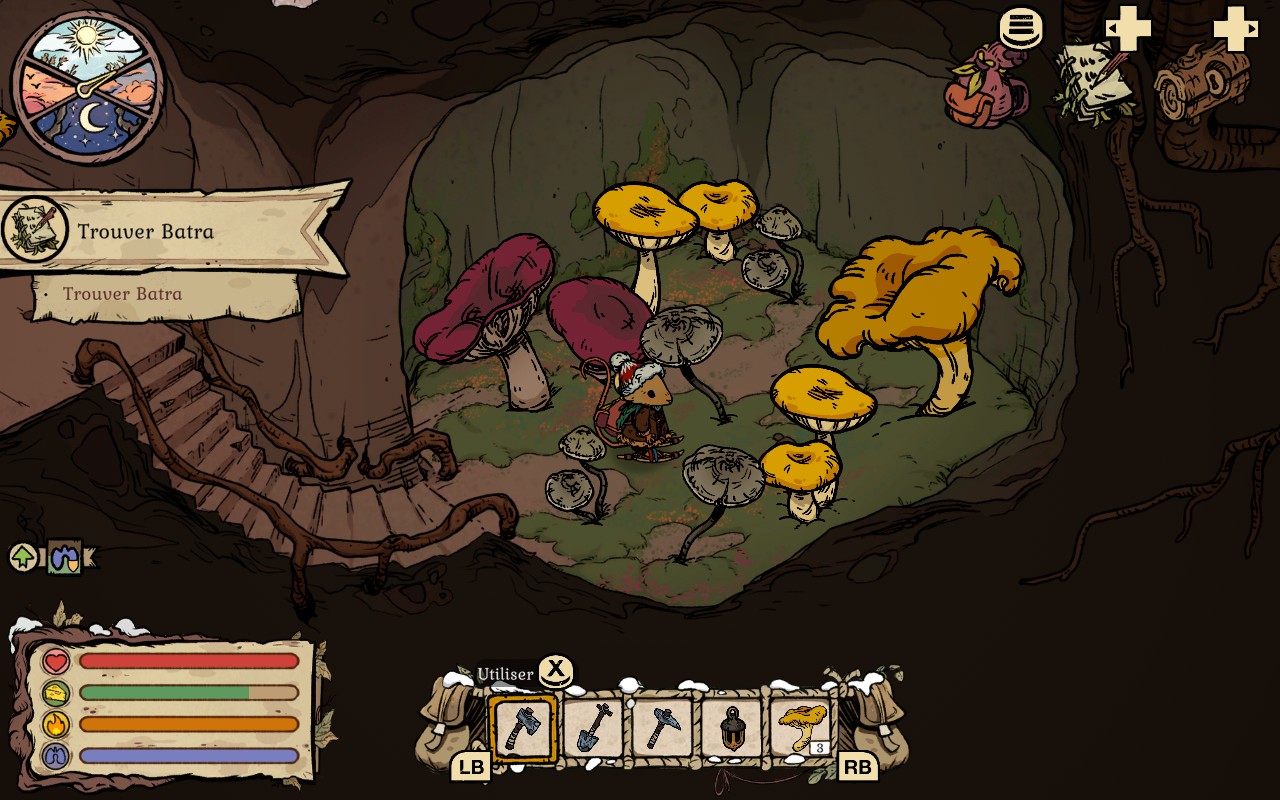 Peu après votre arrivée, vous retrouvez votre tante Betulina, qui habite non loin de chez vous. Elle sera à vos côtés pour quelque temps afin de vous aider et de vous guider pour survivre dans votre nouvel environnement. Elle vous donnera la clé pour avoir accès à votre sous-sol où vous pourrez faire pousser des champignons. Elle vous donnera aussi la recette pour vous fabriquer des raquettes pour aller plus vite dans la neige. Cependant, elle ne sera pas là pour vous guider très longtemps. Je ne veux pas trop rentrer dans les détails pour ne pas vous dévoiler tout ce qui se passe dans l’aventure, mais vous devrez explorer la forêt de long en large et vous rencontrerez plusieurs personnages qui vous récompenseront pour votre aide tout au long de votre périple. L’histoire est très touchante et les personnages sont tous plus attachants les uns que les autres. C’est assurément l’un des jeux les plus charmants auxquels j’ai eu la chance de jouer cette année.