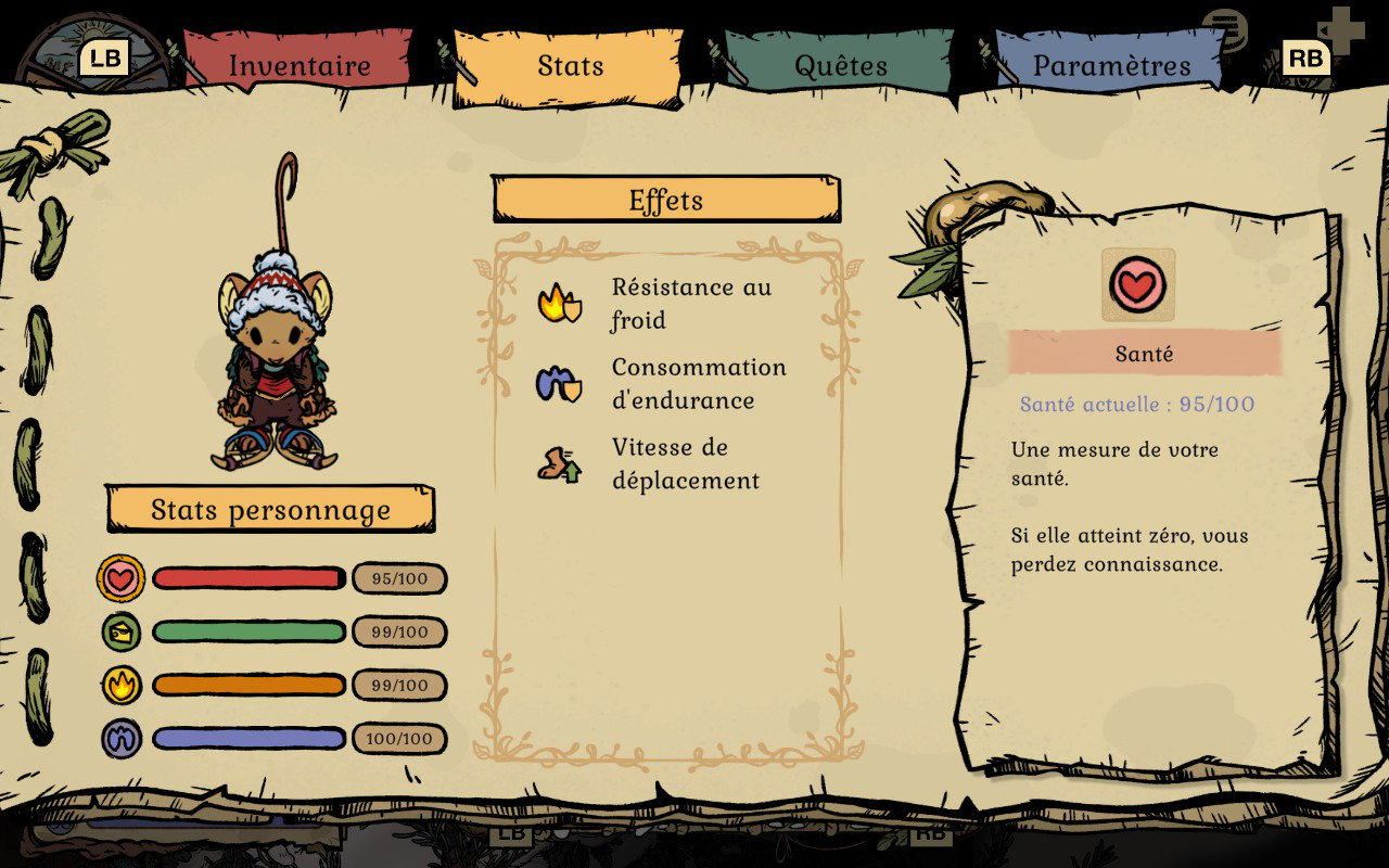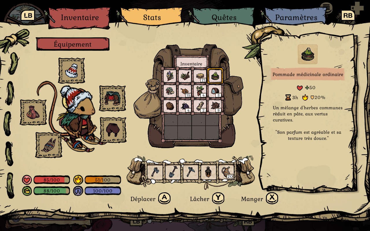 Votre personnage a quatre statistiques différentes, soit la santé, la satiété, la chaleur et l’endurance. Pour commencer, la santé (ou plutôt vos points de vie) est représenté par un cœur dans vos statistiques. Si elle atteint le 0, vous perdez connaissance et vous retournez à votre terrier. Quand cela arrive, vous perdrez le contenu de votre sac et vous devrez retourner le récupérer là où vous êtes mort. Cependant, vous ne perdez pas vos outils et vos pièces d’équipement, seulement les objets, ce que j’ai trouvé génial, car, dans la plupart des jeux du genre, vous perdez tout et cela peut vite devenir frustrant. Si vous subissez des dégâts, vous pouvez vous soigner en mangeant certains aliments, comme les chanterelles grillées, tout autre champignon, de la viande ou tous les aliments qui affichent des cœurs dans votre inventaire.