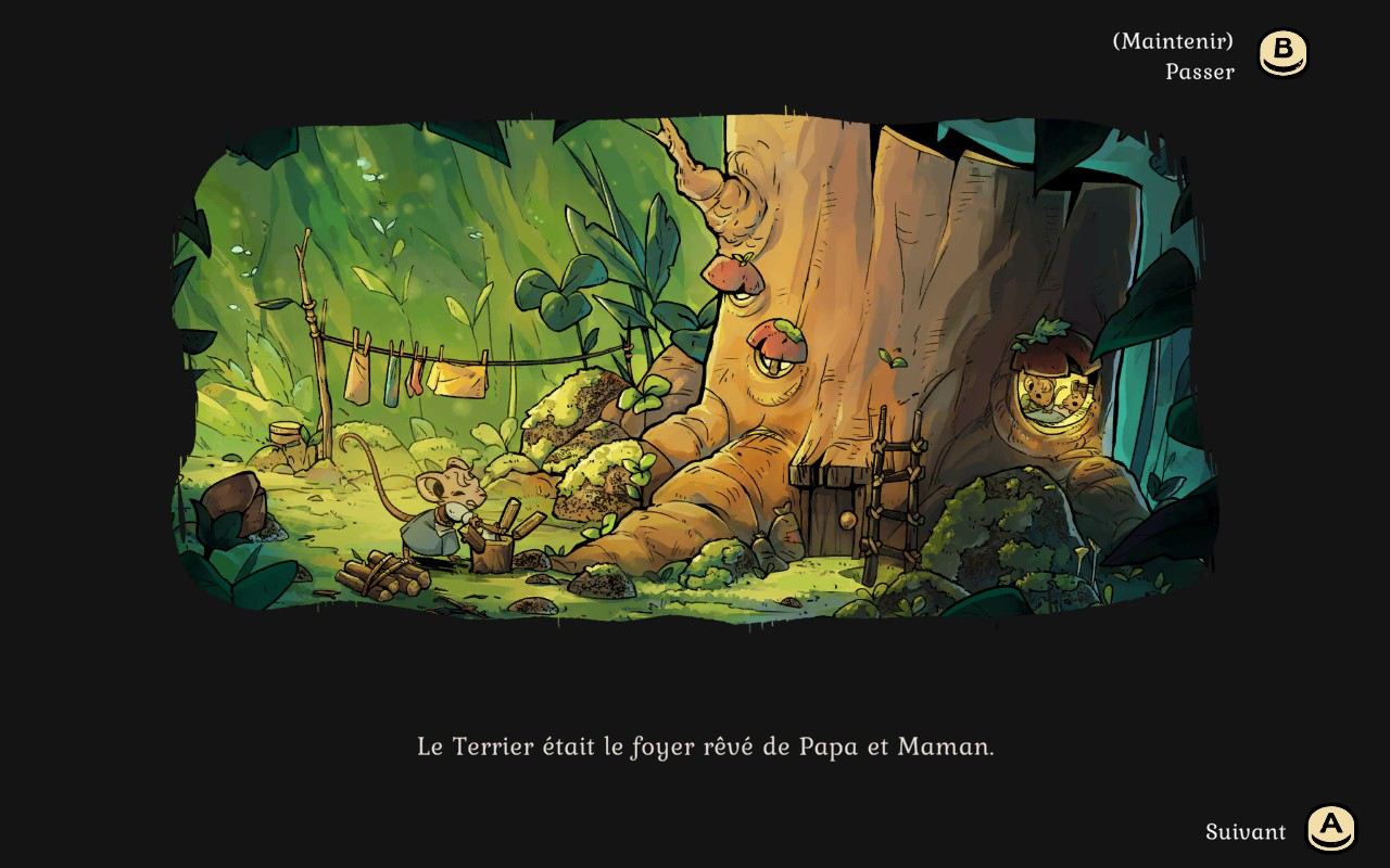 Vous incarnez une petite souris qui retourne dans son terrier d’enfance après la mort de ses parents. En arrivant, vous voyez que votre maison est en piteux état. Les escaliers sont brisés, il n’y a plus de lit et le petit coin de détente est démoli. Vous devrez donc mettre les pattes à la pâte pour rebâtir le tout afin d’en refaire un endroit confortable et sécuritaire. Vous allez donc partir à l’aventure pour trouver les matériaux dont vous avez besoin pour vous construire un lit et vous devrez vous trouver de la nourriture pour survivre à la rude saison hivernale.