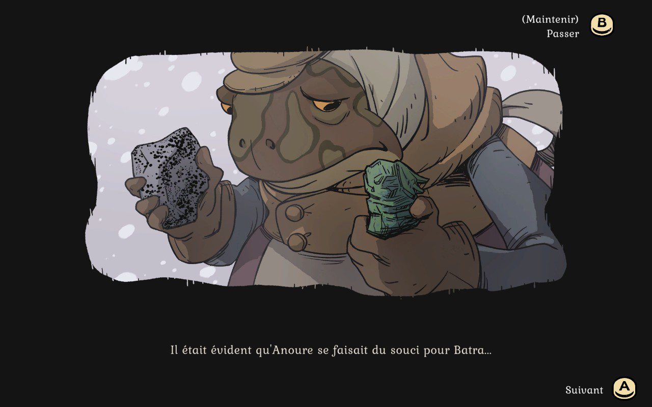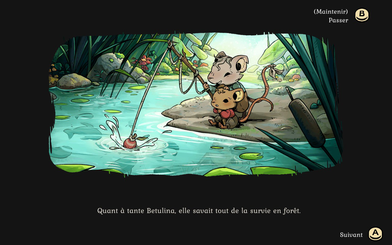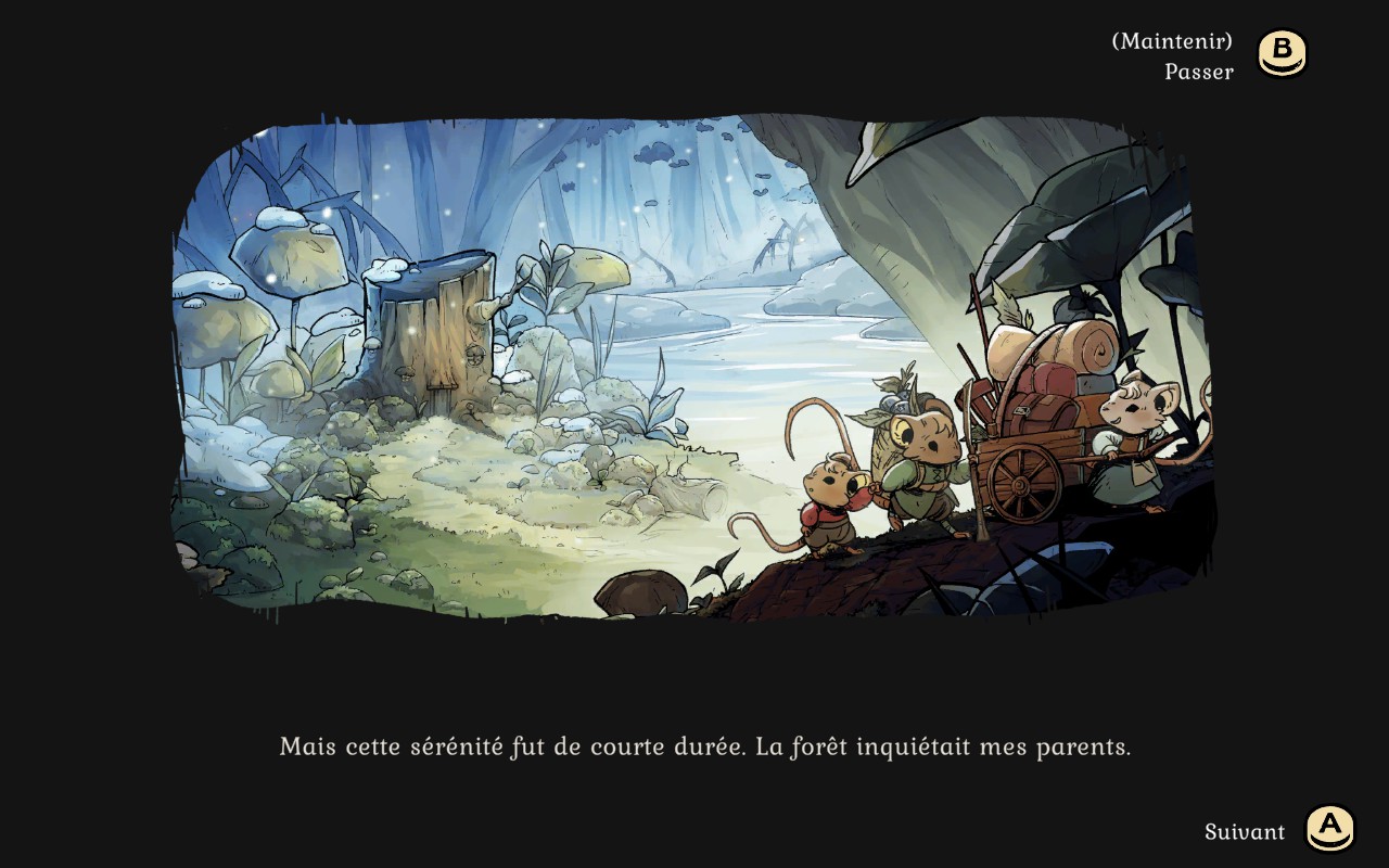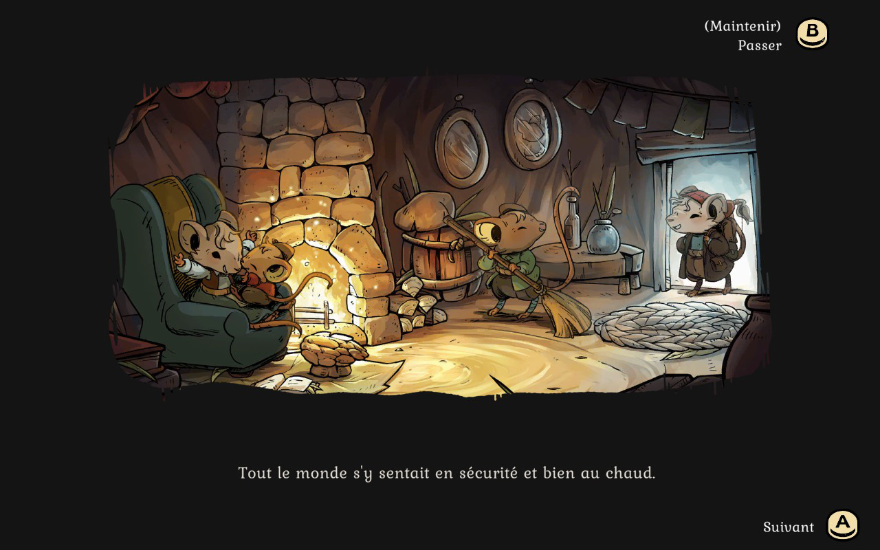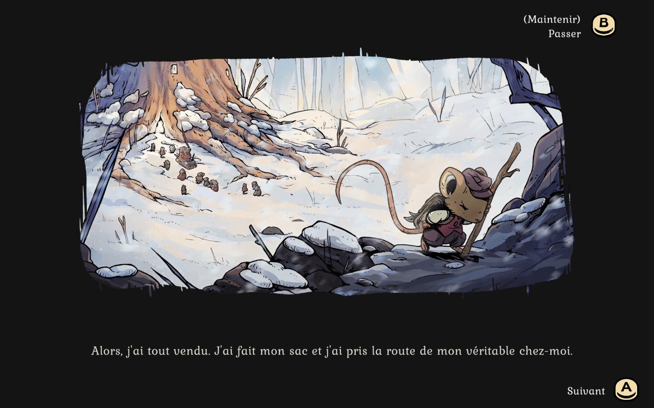 Le jeu a une superbe ambiance auditive et visuelle. Le design est charmant et absolument magnifique. La neige est magnifique, et vous remarquerez que votre écran se couvre de givre, plus vous avez froid. Les personnages sont aussi tous plus adorables les uns que les autres. Le visuel est assez particulier et d’une qualité qu’on ne voit pas souvent. La direction artistique est tout à fait remarquable. Les plus vieux remarqueront quelques similitudes avec Redwall ce qui plaira assurément à beaucoup de gens. C’est sans aucun doute le jeu 2D qui m’a le plus plu cette année. J’ai été impressionnée par le superbe design du début à la fin de mon aventure.