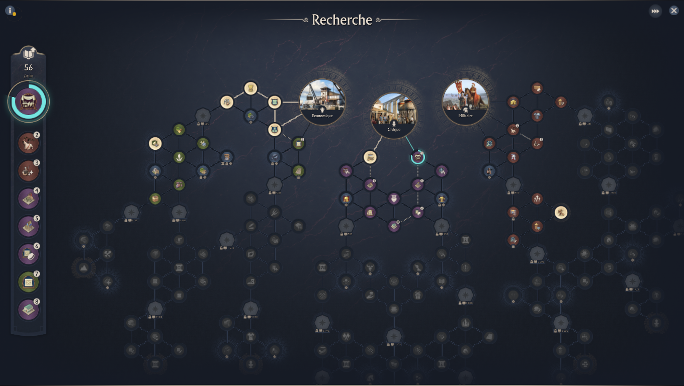 - Un système de bonus et de malus (statut de ville, effets de bâtiments) peu lisible