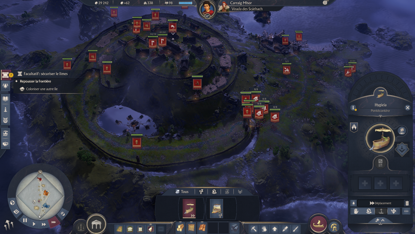 La grande nouveauté, c’est la gestion de deux provinces majeures: le Latium et l’Albion. Le premier, Méditerranéen, offre le cliché assumé de la carte postale romaine: ports baignés de soleil, forums, villas en terrasses. Le second, Albion, est une Bretagne celte brumeuse, faite de marais, de rochers et de villages recroquevillés sur des terres ingrates. Chaque région a sa population, ses ressources et ses besoins. Les Liberti et Eques de Latium réclament sardines, garum, porridge, puis fromage et vin; les Forgerons et Aldermen Romano-Celtes d’Albion préfèrent les anguilles, les coquillages, la bière et leurs propres luxes. Le jeu est intelligent sur un point: il t’oblige à raisonner en empire plutôt qu’en cartes indépendantes, en verrouillant certaines productions dans une seule région. Si tu veux nourrir tes élites romaines avec du fromage, il faudra assumer que la production se trouve en Albion et organiser la logistique en conséquence.