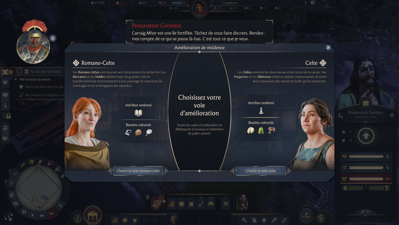 C’est excellent pour le gameplay, mais un peu moins pour la crédibilité historique. Voir Rome incapable de produire son propre fromage fait sourire et rappelle que certains choix sont d’abord là pour forcer des routes commerciales plutôt que pour coller à la réalité. La gestion d’Albion s’enrichit d’un autre système: la romanisation. Tu peux garder des Celtes « traditionnels » ou pousser tes habitants vers le statut de Romano-Celtes, plus exigeants, mais plus intégrés à l’économie de l’empire. Sur le terrain, cela se traduit par des arbres de besoins et des réactions diplomatiques différentes. L’idée de choc des cultures est séduisante, même si elle reste assez mécanique et aurait pu porter un commentaire plus fort sur la domination romaine.