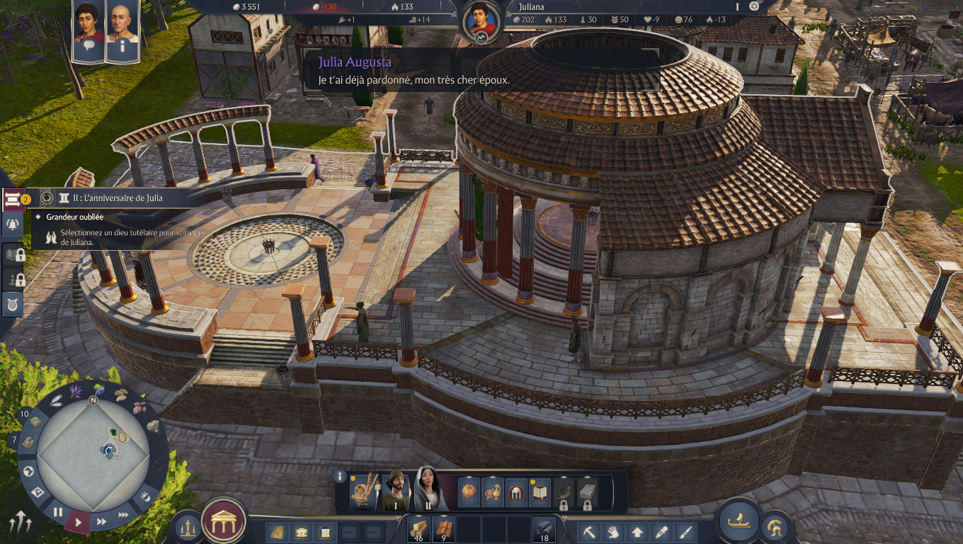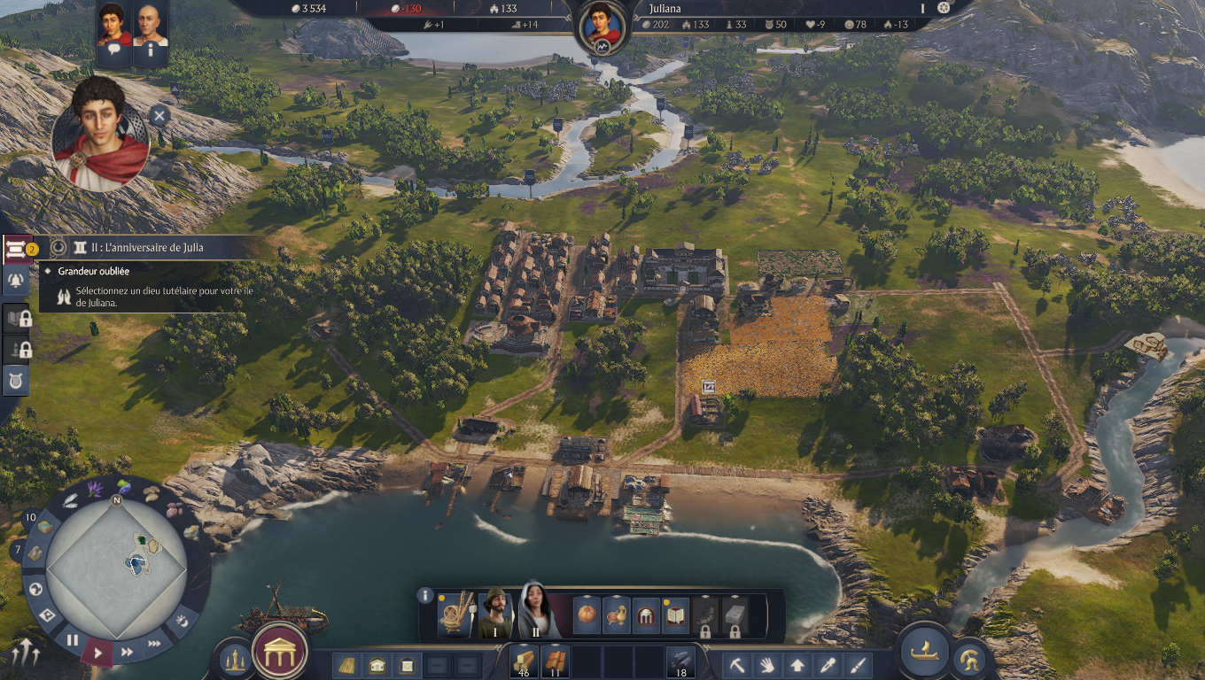 La campagne te met dans la peau de Marcus ou Marcia, enfants de l’empereur Decimus. C’est la première fois qu’Anno te laisse incarner une femme en campagne, dans une intrigue de gouvernance « en coulisses », de mari pas tout à fait mort et de loyauté discutée envers Rome. Ce n’est pas du grand drame historique, mais ça fonctionne comme cadre pour un long tutoriel scénarisé d’une dizaine d’heures. En avançant, tu découvres progressivement les systèmes, les deux régions et les mécaniques de romanisation que j’ai trouvée particulièrement intéressante. La pression constante entre une allégeance identitaire romaine et l’accommodement au peuple celte est bien pensée. Une fois cette introduction digérée, le jeu montre son vrai visage: le mode bac à sable, où Rome te laisse enfin tranquille avec tes grilles, tes routes commerciales et tes crises de surproduction.