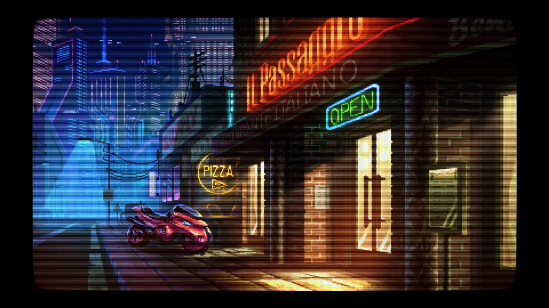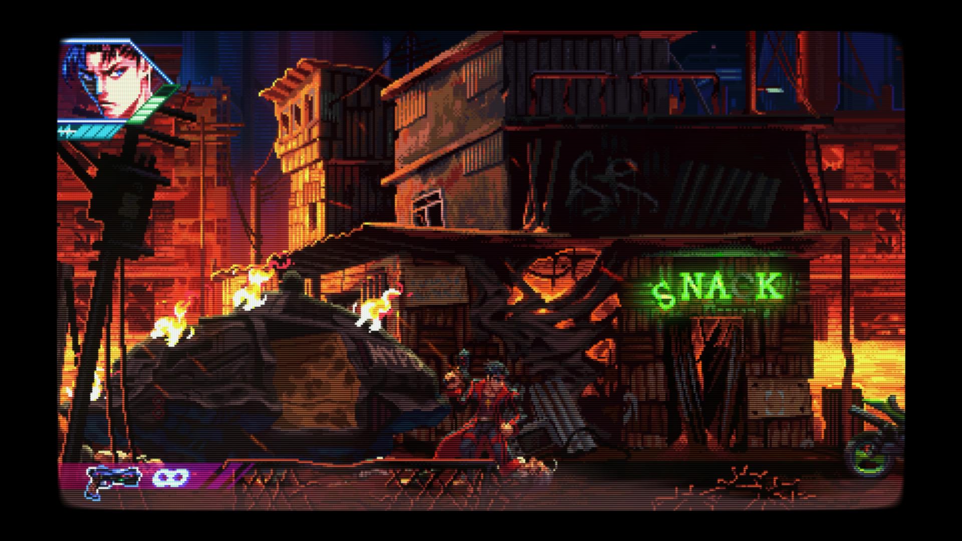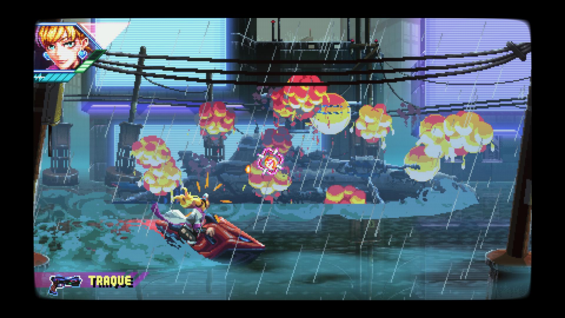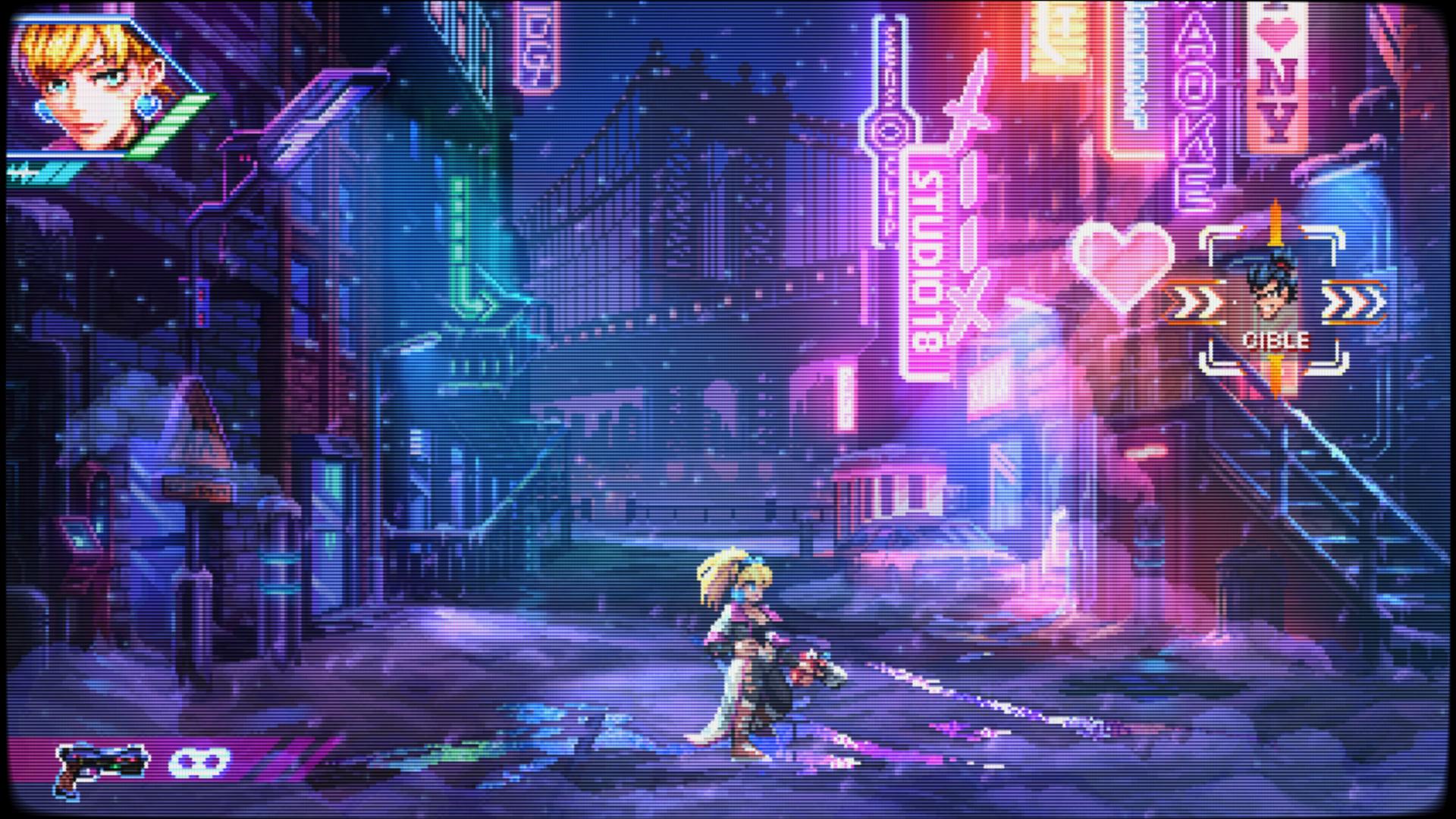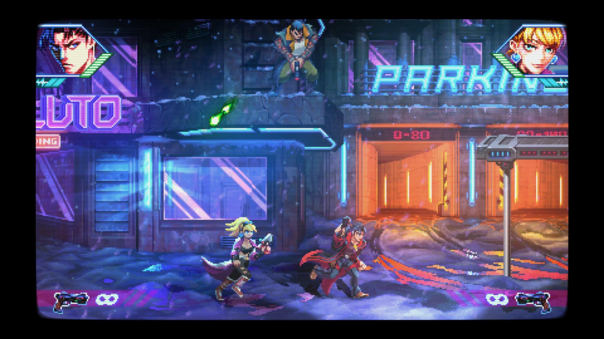 Visuellement, Neon Inferno met la barre assez haute. Les décors sont tout simplement sublimes. Ils mélangent un pixel art soigné à des effets de brouillard et de lumière saisissants. Après Steel Assault, Zenovia Interactive démontre, encore une fois, son savoir-faire dans le domaine. Les premières minutes de jeu vous en mettront immédiatement plein la vue et vous ne cesserez jamais d’être épatés. Les animations sont fluides, l’action est lisible et les niveaux ont tous une identité visuelle forte. Le design des boss et des ennemis est réussi et les séquences entre les missions sont particulièrement réussies. J’ai beaucoup aimé certains détails, comme le reflet du visage des personnages sur les surfaces de verre, en plus des séquences qui sont pensées pour inclure l’un ou l’autre des personnages selon le personnage joué.