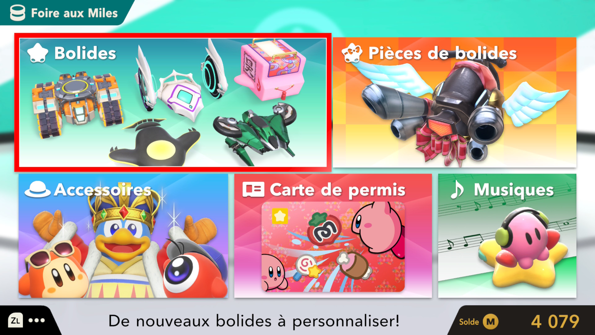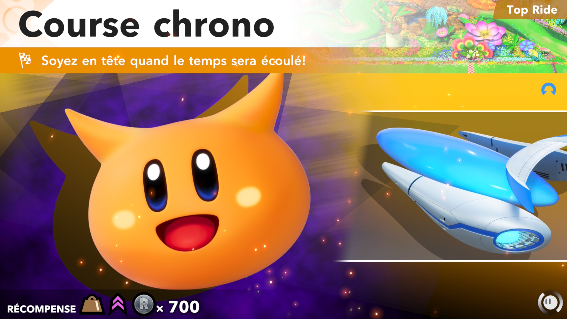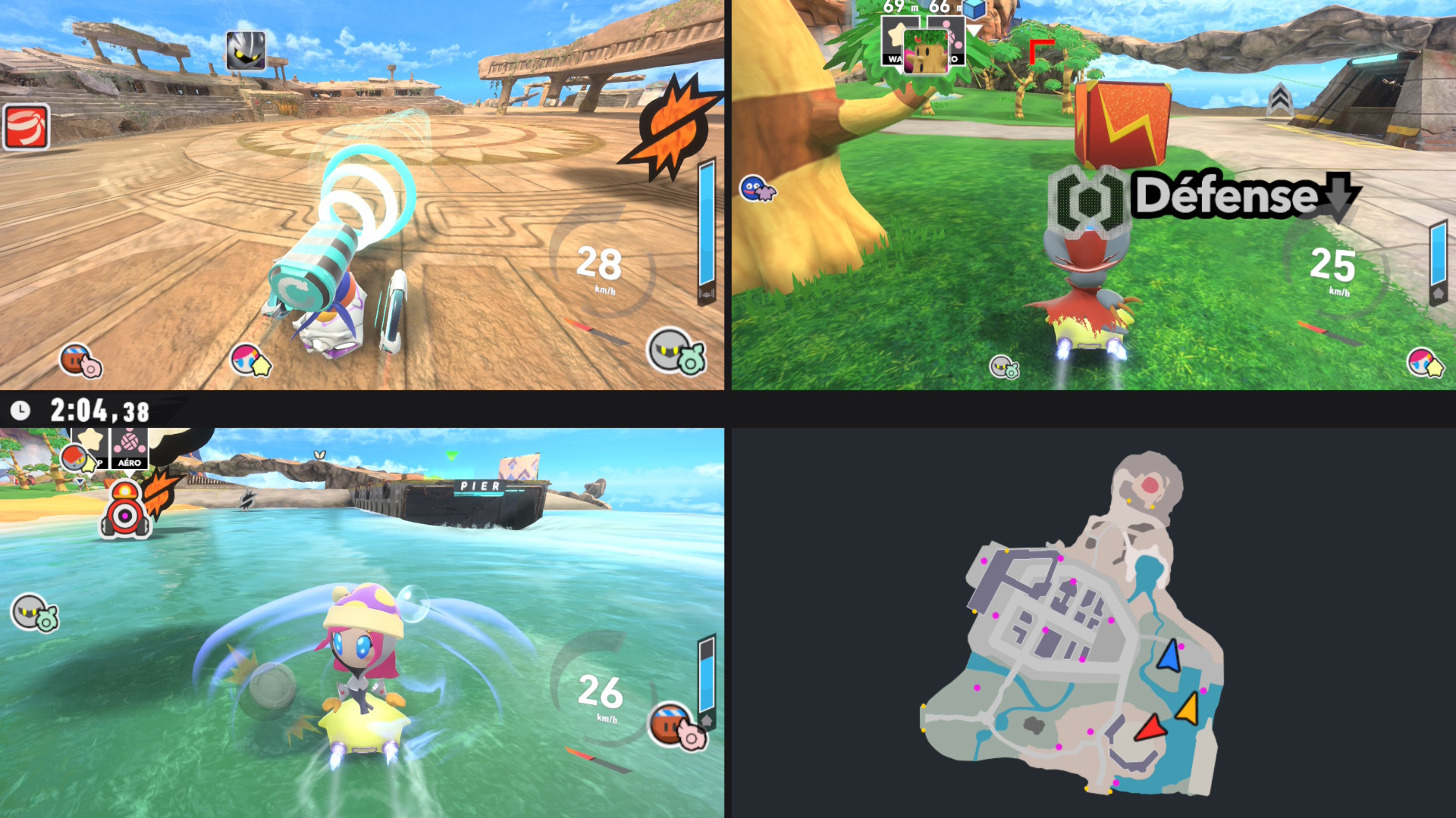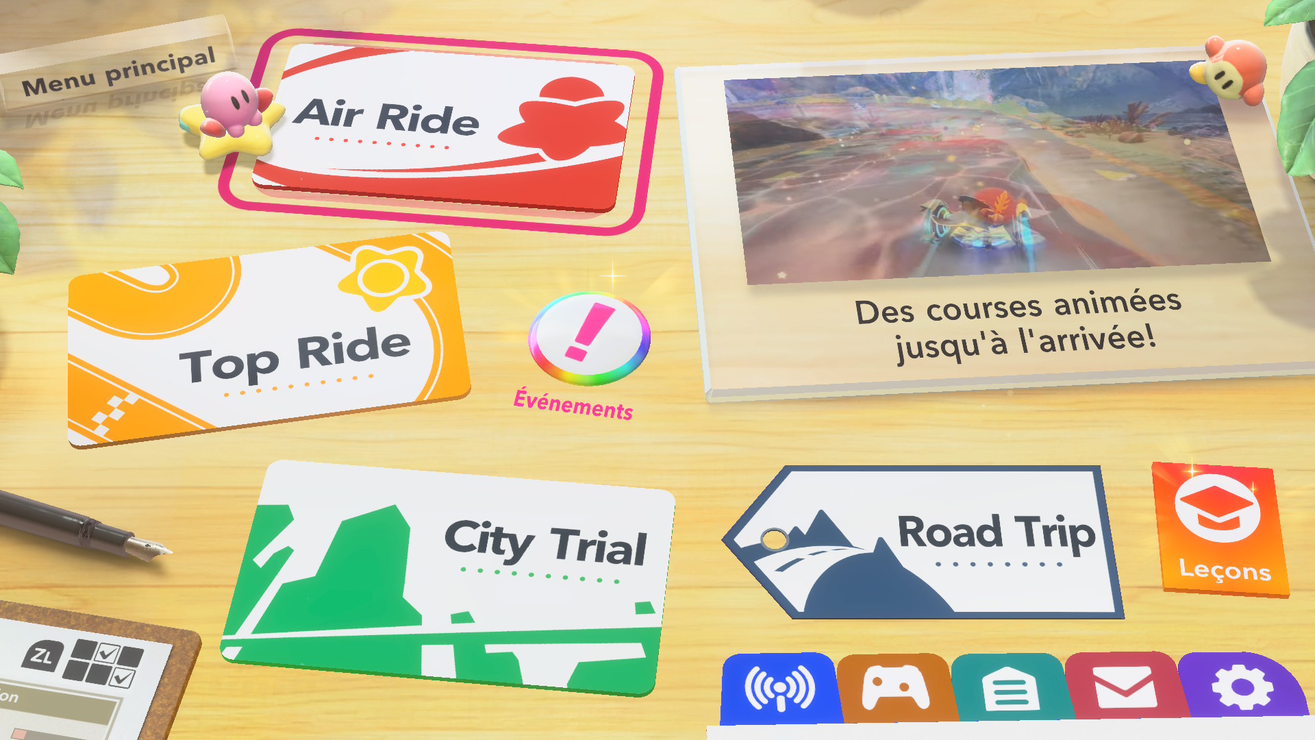 Kirby Air Riders est un jeu de course avec différents modes de jeu qui font en sorte que notre expérience ne soit pas trop monotone. Les quatre modes principaux sont le « Air Ride », le « Top Ride », le « City Trial » et le « Road Trip ». Je vous parlerai plus en détail de chacun de mode un peu plus tard. Je vais commencer par la jouabilité qui nous sort de nos habitudes des jeux de courses. Ce qui rend ce jeu unique est que vous n’avez pas à appuyer sur une touche pour faire avancer votre véhicule: votre bolide avance tout seul. C’est comme si nous mettions en permanence le mode « Accélération automatique » qui, comme son nom l’indique, fait en sorte que vous avancez seul, dans les plus récents Mario Kart. J’ai été forcée de constater que nos habitudes de Mario Kart sont difficiles à perdre et j’ai tendance à envoyer le stick analogique gauche vers l’avant lorsque je joue à Mario Kart. Malheureusement, pour ma part, j’arrive difficilement à enlever cette habitude qui fait en sorte de me ralentir, puisque dans Kirby Air Riders, cela fait en sorte que mon bolide pique du nez. Le drift, aussi appelé « glisse », joue un rôle crucial, puisqu’elle vous permet, en fonction du véhicule sélectionné, d’obtenir un boost de vitesse. Encore une fois, cette mécanique est très différente du jeu de course de notre ami à moustache. Lorsque vous appuyez sur la touche pour faire de la glisse, votre véhicule ralentira jusqu’à complètement s’arrêter. Pendant ce temps, vous pourrez choisir la direction que vous désirez prendre et, lorsque vous relâcherez la touche, un gros boost de vitesse vous sera octroyé. Attention cependant à ne pas le maintenir trop longtemps au risque de surchauffer votre véhicule et de perdre de précieuses secondes supplémentaires pour que celui-ci récupère. Vous l’aurez compris, il y a beaucoup de technique à comprendre dans ce jeu afin d’utiliser le plein potentiel de votre rider et de son bolide. Je vous conseille donc de faire les leçons qui vous permettront d’apprendre toutes les techniques de conduite. Ces leçons, bien que facultatives, sont nécessaires pour comprendre toutes les subtilités offertes par Kirby Air Riders. J’ai moi-même dû en refaire quelques-unes afin de me permettre de bien comprendre toutes les mécaniques de jeu.
