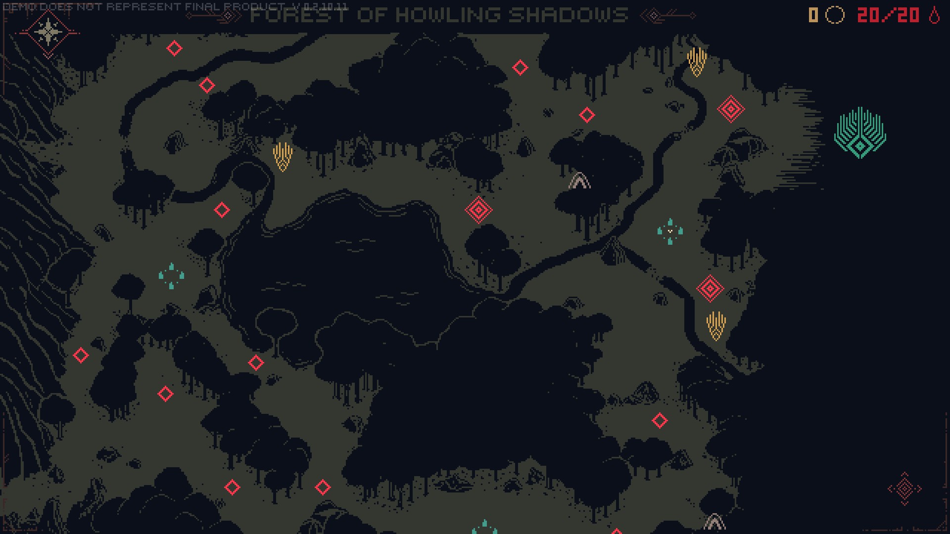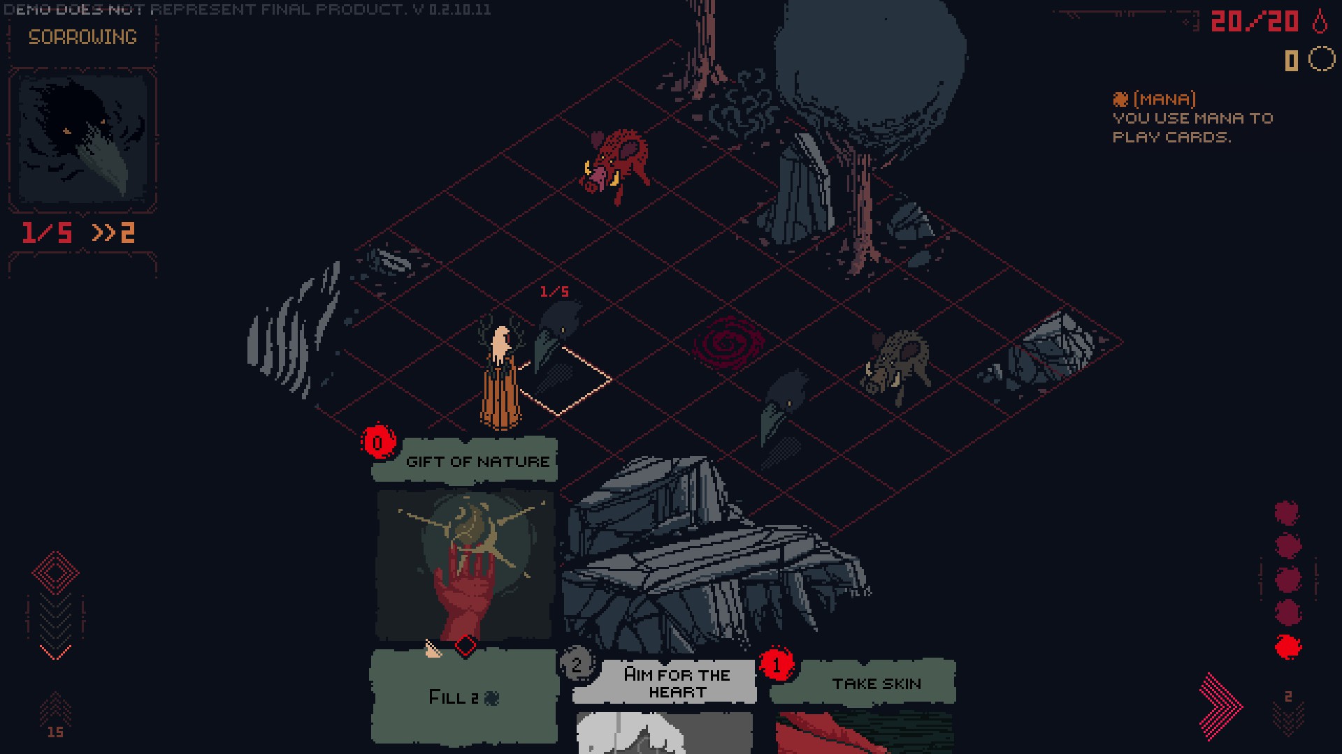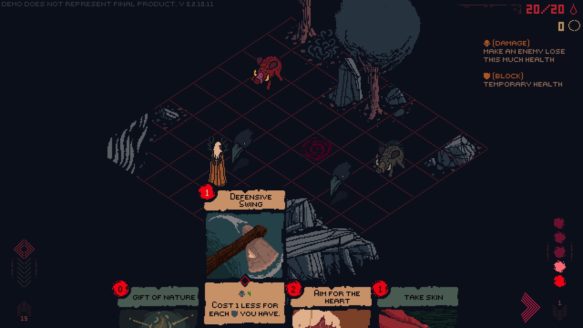 Au début de votre tour, vous pigerez cinq de vos vingt cartes. Chacune d’entre elles aura un coût en mana pour être jouée, et vous débuterez avec cinq points de mana. Vous vous déplacerez dans une arène quadrillée de taille moyenne et, pour ce faire, vous pourrez dépenser des points de mana ou utiliser des cartes de déplacement. Vous devrez vous déplacer sur la grille et affronter vos adversaires en utilisant vos cartes d’attaque. Certaines cartes, qui sont beaucoup plus fortes, demanderont d’être détruites une fois utilisées. Elles ne seront pas détruites de manière permanente, cela signifie seulement qu’elles seront mises de côté dans une pile distincte de votre défausse et qu’elles ne seront pas mélangées avec le reste de votre paquet lorsque vous aurez épuisé vos cartes à piger. Pendant l’aventure, vous affronterez plus d’une trentaine d’ennemis avec des comportements uniques. Apprendre à connaître chacun des ennemis est crucial pour la réussite des combats, un autre aspect fortement inspiré des Soulslike.