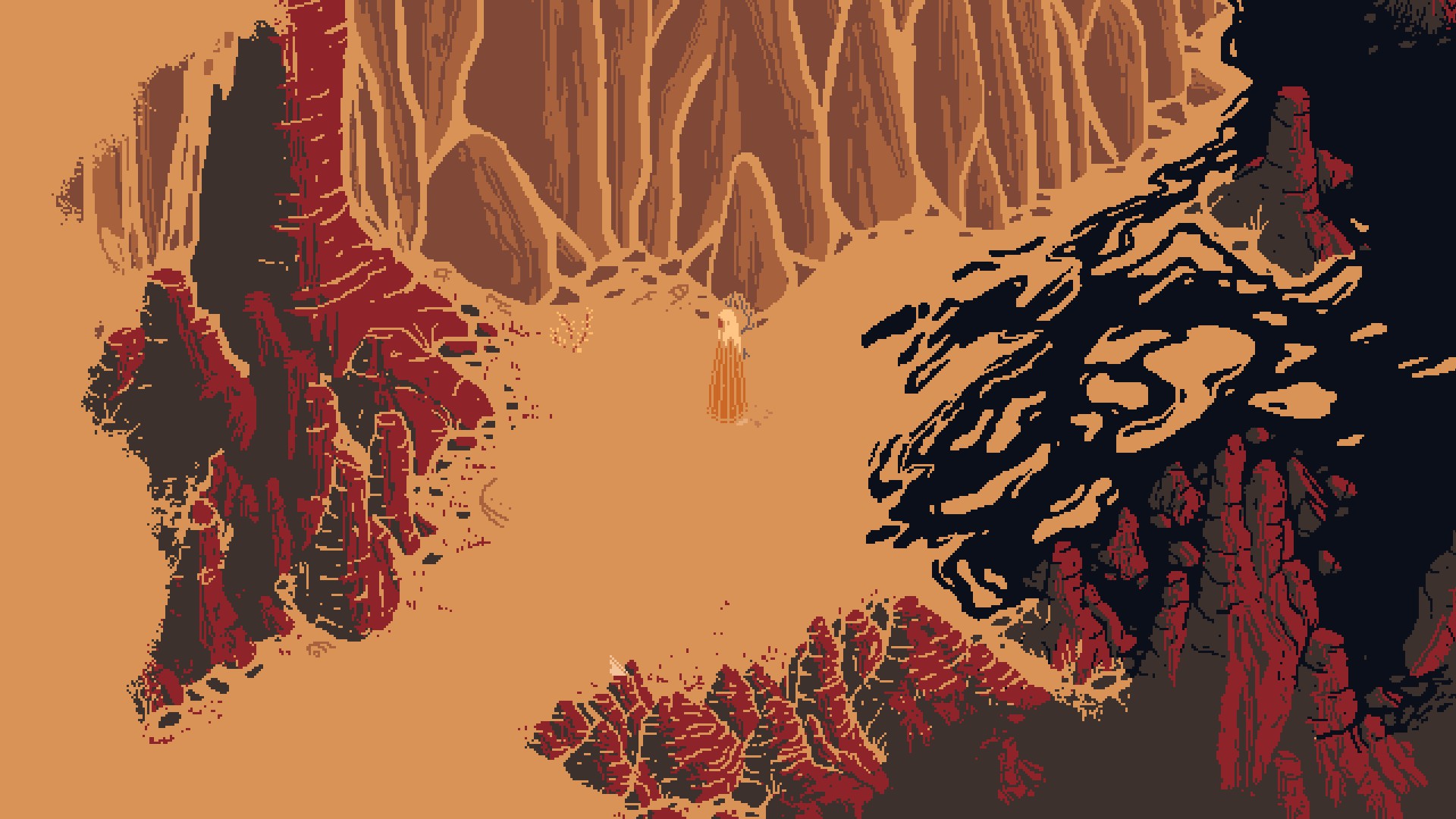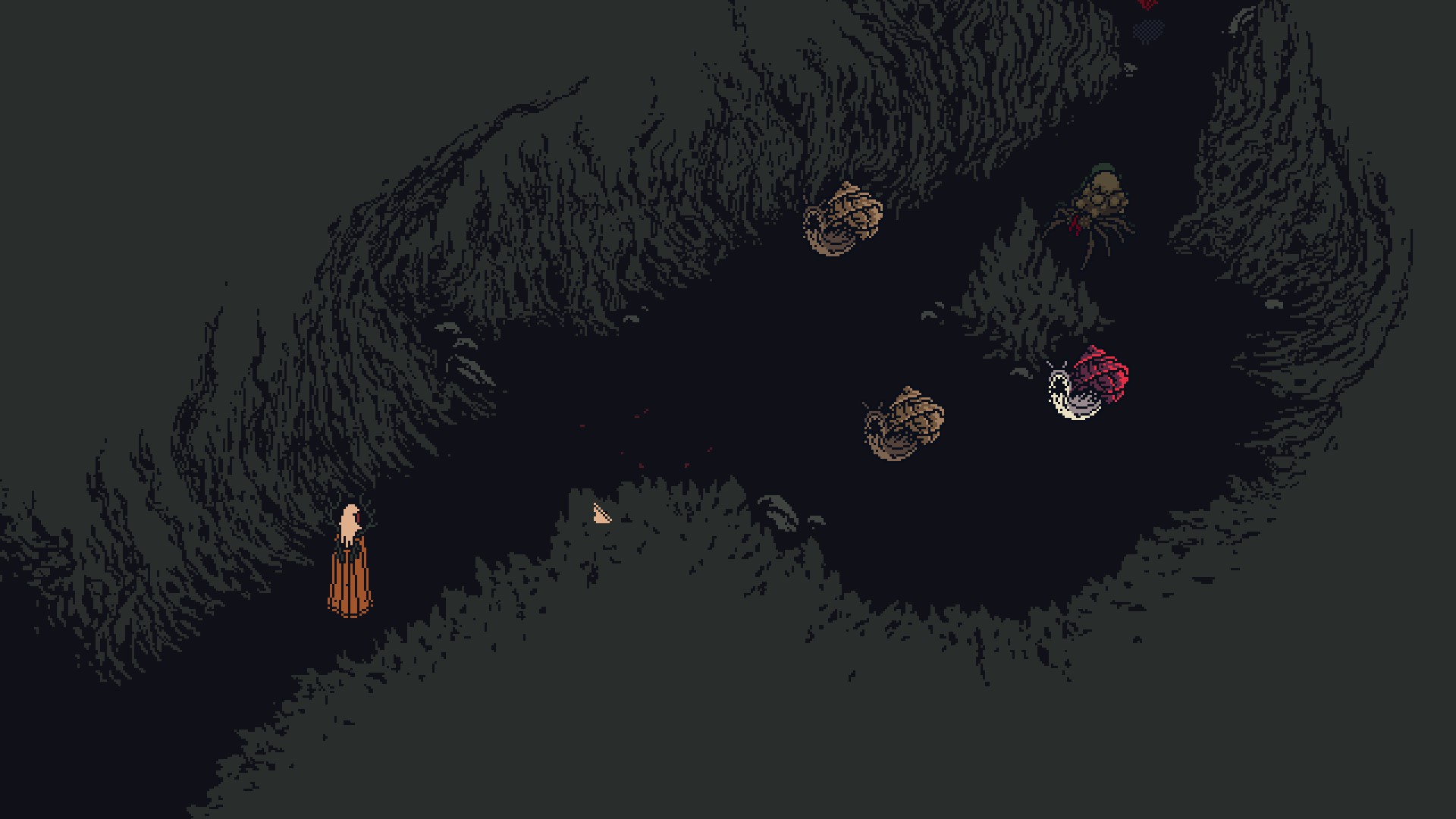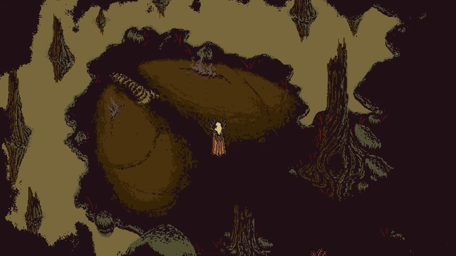 Le côté pixel art est minimaliste, mais il est parfaitement exécuté. Ce qui le distingue assurément des autres jeux optant pour le même style, c’est sa palette et son design inquiétant. En effet, les couleurs sont limitées à des nuances très sombres, tandis que les décors ne comptent que quelques couleurs, ce qui renforce considérablement l’aspect rétro du titre. Les décors sont oppressants et l’ambiance générale du jeu est vraiment très mélancolique. Cela est accentué par une bande-son atmosphérique aussi angoissante que les décors qu’elle accompagne. Je n’ai cessé d’être impressionné par les environnements et les palettes de couleur. Death Howl propose un style visuel déstabilisant qui lui va comme un gant!