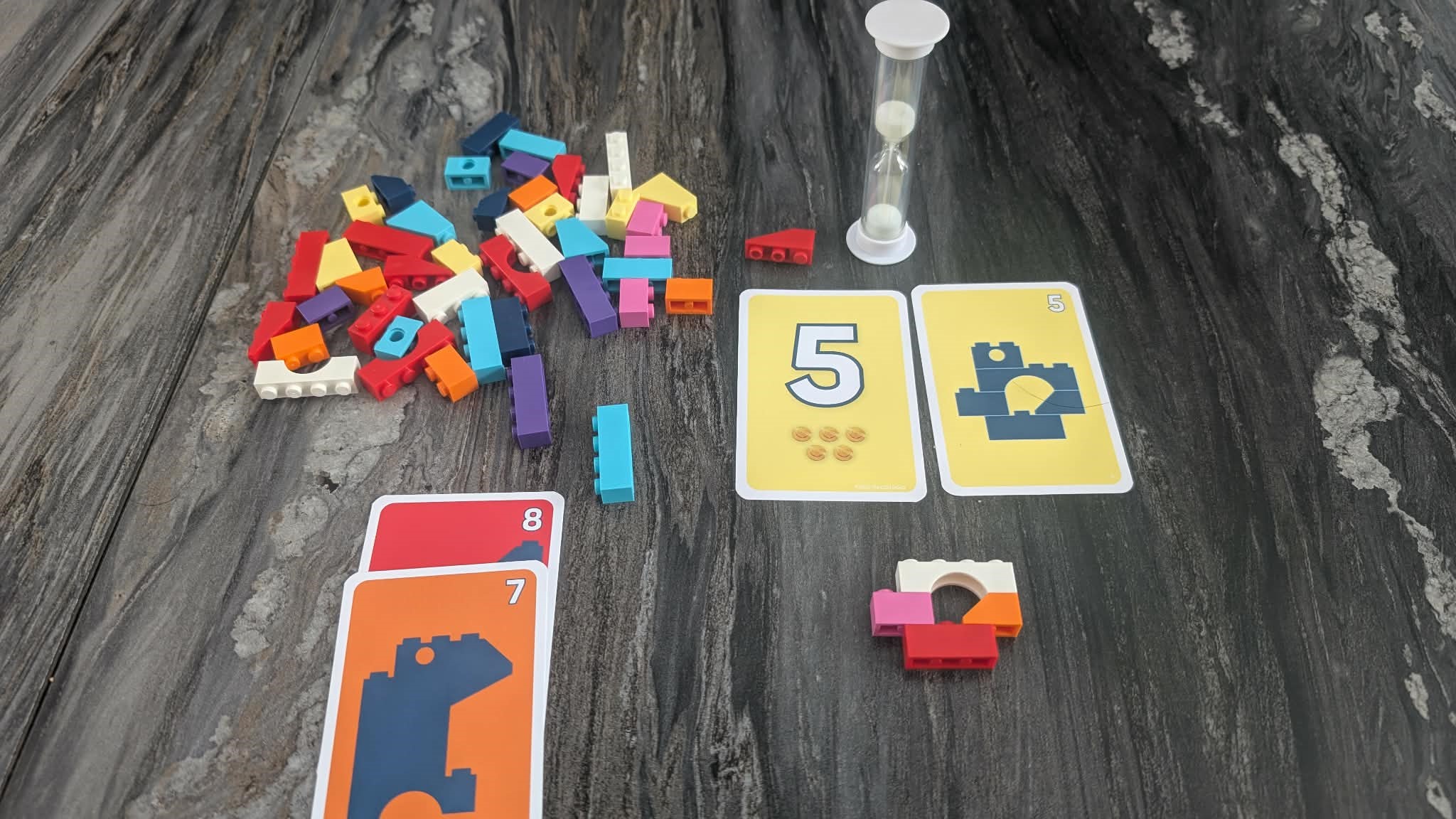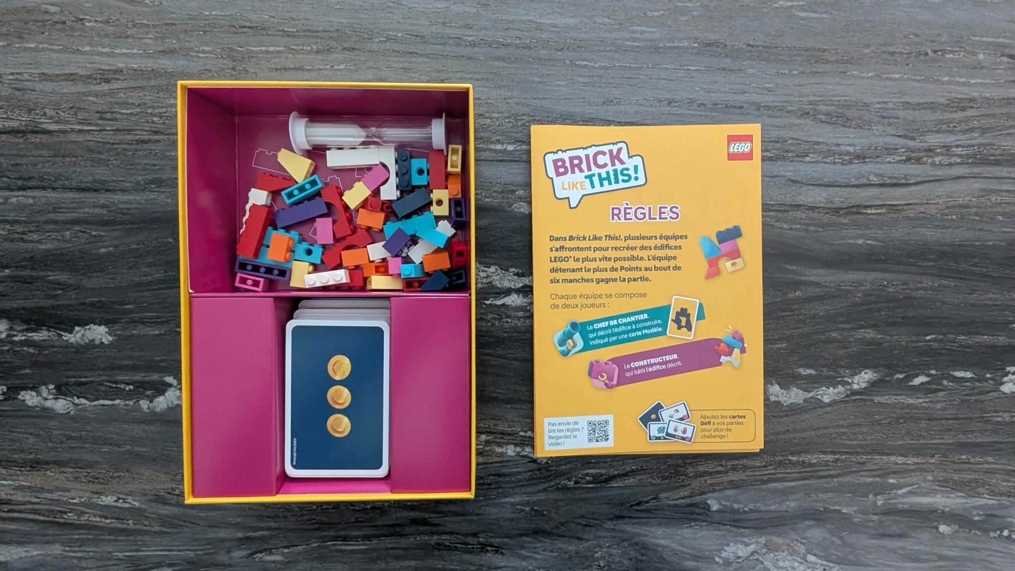 La mise en place de Brick Like This est particulièrement rapide. Trois étapes suffisent pour commencer une partie. Premièrement, vous devrez trier les cartes modèles par leur valeur (5, 6, 7 ou 8), puis vous devrez mélanger chaque pile et les déposer, face visible, à proximité de tous les joueurs. Ensuite, vous placerez les briques LEGO à la portée de tous les joueurs, directement sur la table ou dans le compartiment prévu à cet effet dans la boîte du jeu. Et finalement, vous placerez le sablier à côté de la zone de jeu. Et voilà! Une installation simple et efficace. Cette rapidité est un énorme point fort, surtout pour un jeu de party, où l’on cherche avant tout à enchaîner les parties sans perdre de temps.