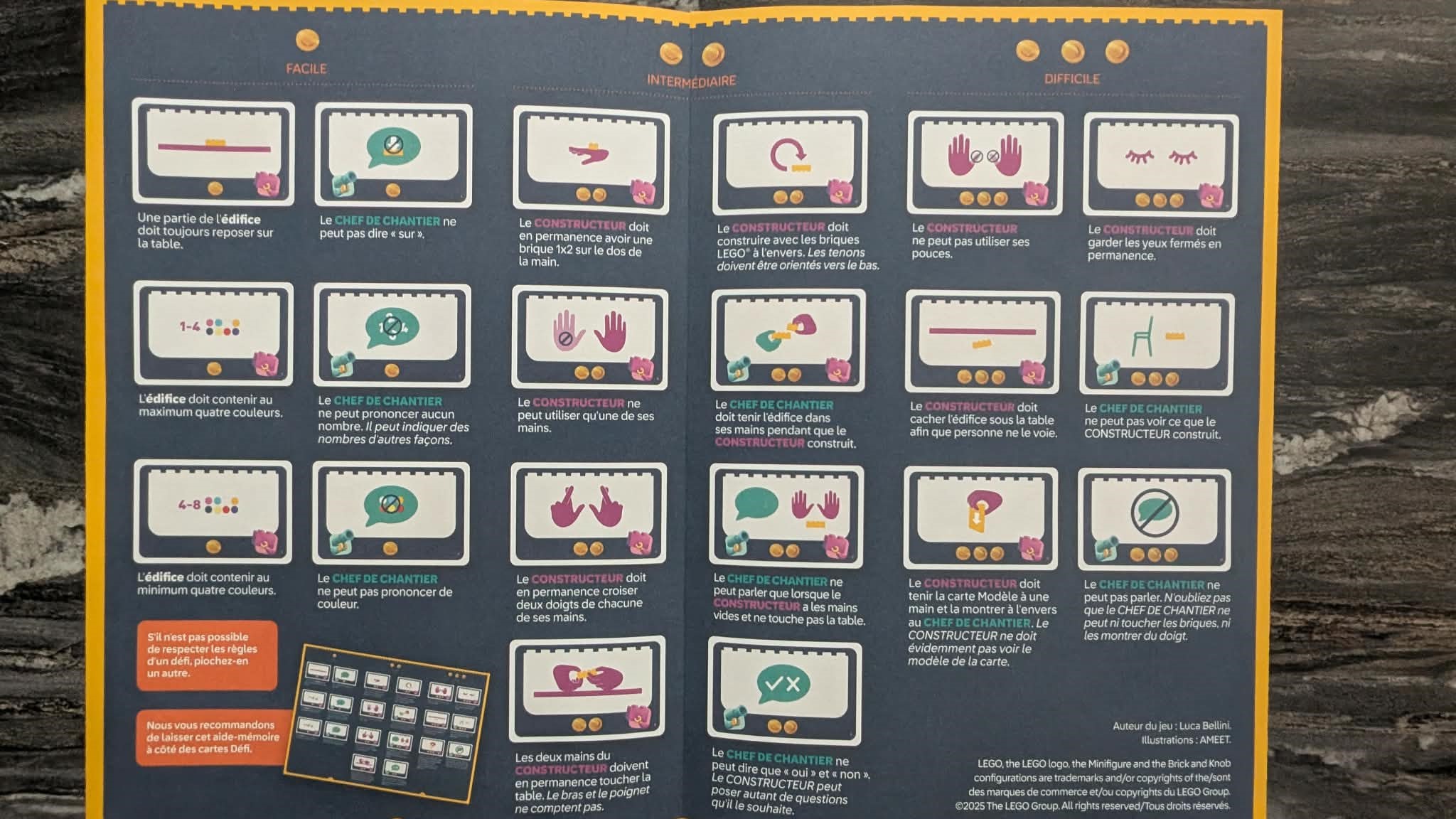 Imaginez devoir réaliser une construction sans pouvoir utiliser ses deux mains, sans pouvoir dire le mot « sur », en ayant les yeux fermés ou même en réalisant la construction en ayant toujours les bras collés à la table. Ces défis génèrent des situations cocasses et, surtout, énormément de rires. Une fois qu’on y a goûté, il devient difficile de revenir en arrière et de jouer sans elles. Pour les plus jeunes, certains défis peuvent toutefois s’avérer trop complexes. Il est alors recommandé de jouer en mode standard. Cela dit, dès que les enfants sont en mesure de relever la majorité des défis, leur intégration devient, selon moi, essentielle.