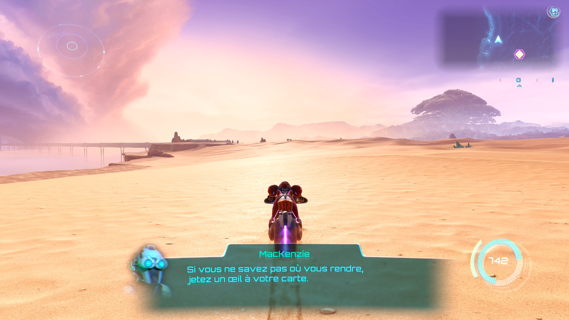 Si, comme moi, vous aviez regardé les bandes-annonces du jeu avant de vous lancer, vous avez certainement remarqué la présence d’une moto dans le jeu. Cette moto est utilisée principalement dans la partie monde ouvert du jeu. Proprement dit, le jeu n’est pas un monde ouvert, mais une partie du jeu l’est, soit le désert. Ce désert sert à relier les zones principales entre elles et est un bon divertissement. Certes, il n’est pas très complexe et n’offre pas les possibilités d’un Breath of the Wild ou d’un Horizon, mais il est occupé par quelques ennemis, des objets cachés et quelques « shrines » dans lesquelles se trouvent les améliorations d’armes. Pour ma part, je ne m’attendais à rien de cette partie du jeu, alors je n’ai pas été trop déçu. Se balader en moto est agréable et le paysage est époustouflant. Et, surtout, n’oubliez pas de foncer dans les cristaux verts qui se trouvent sur votre chemin, car vous en aurez grand besoin.