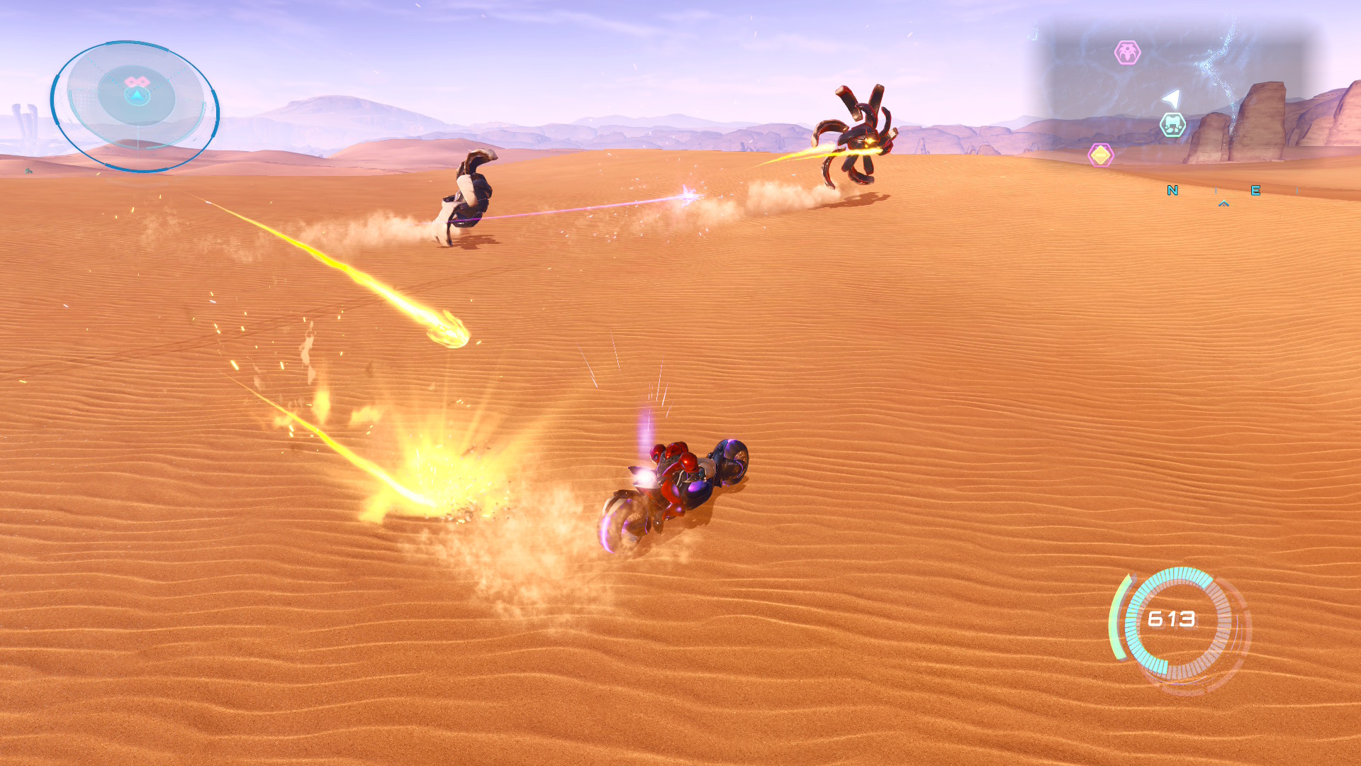 Dans Beyond, vous explorerez cinq donjons pour obtenir les cinq clés nécessaires pour accéder à la zone finale. Vous commencerez par explorer la jungle, qui est aussi le centre névralgique de l’aventure. Cette zone est peu complexe, mais c’est aussi l’une des plus jolies et elle abrite le centre de contrôle où tous les personnages se rencontreront. C’est ici que vous reviendrez entre chaque mission et c’est aussi ici que vous pourrez échanger les fameux cristaux verts contre des récompenses. Une fois la jungle terminée et la première clé obtenues, vous partirez en direction du désert où se trouvent les autres donjons. Dans les quatre directions du désert se dressent les quatre donjons suivants: la forge Volt, la ceinture de glace, le bassin ardent et les grandes mines. Vous devrez visiter chaque donjon à quelques reprises pour tout obtenir, mais, une fois la clé et la puce obtenues dans un donjon, vous retournerez au centre de contrôle pour obtenir l’amélioration correspondante, soit le prochain tir élémentaire.