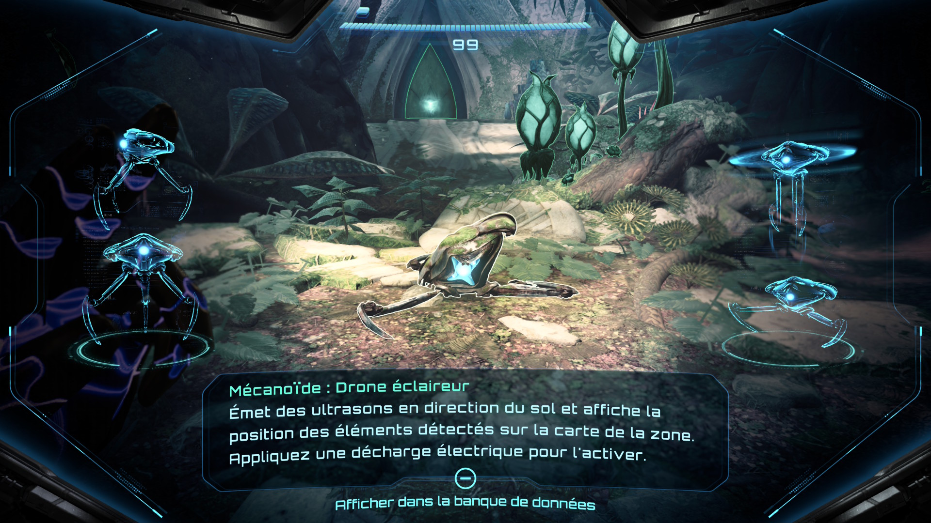 Beyond est parsemé d’objets à ramasser, mais surtout d’objets à numériser. Comme je l’ai mentionné plus tôt, les objets ne sont pas cachés très profondément dans les niveaux et vous ne vous creuserez pas trop la tête pour tous les récolter, mais les objets sont nombreux. Bien qu’ils ne soient pas toujours significatifs (il s’agit toujours de missiles supplémentaires, de tirs élémentaires supplémentaires et d’amélioration pour votre réserve d’énergie), c’est tout de même plaisant de mettre la main sur un objet caché. Cependant, ce qui est moins plaisant est le besoin constant de tout numériser dans les pièces. Que ce soit pour accéder à une console, activer un ascenseur ou obtenir toute forme d’information, vous devrez entrer en mode « scan » et numériser tout ce qui s’illumine en vert dans votre écran. Je dois avouer que, après une quinzaine d’heures de jeu, je n’en peux plus de numériser chaque objet présent dans le jeu. Certes, plusieurs de ces « scans » sont secondaires, mais, comme je viens de le mentionner, plusieurs objets doivent être numérisés avant de pouvoir interagir avec eux. Dans Beyond, vous verrez la vie en vert…