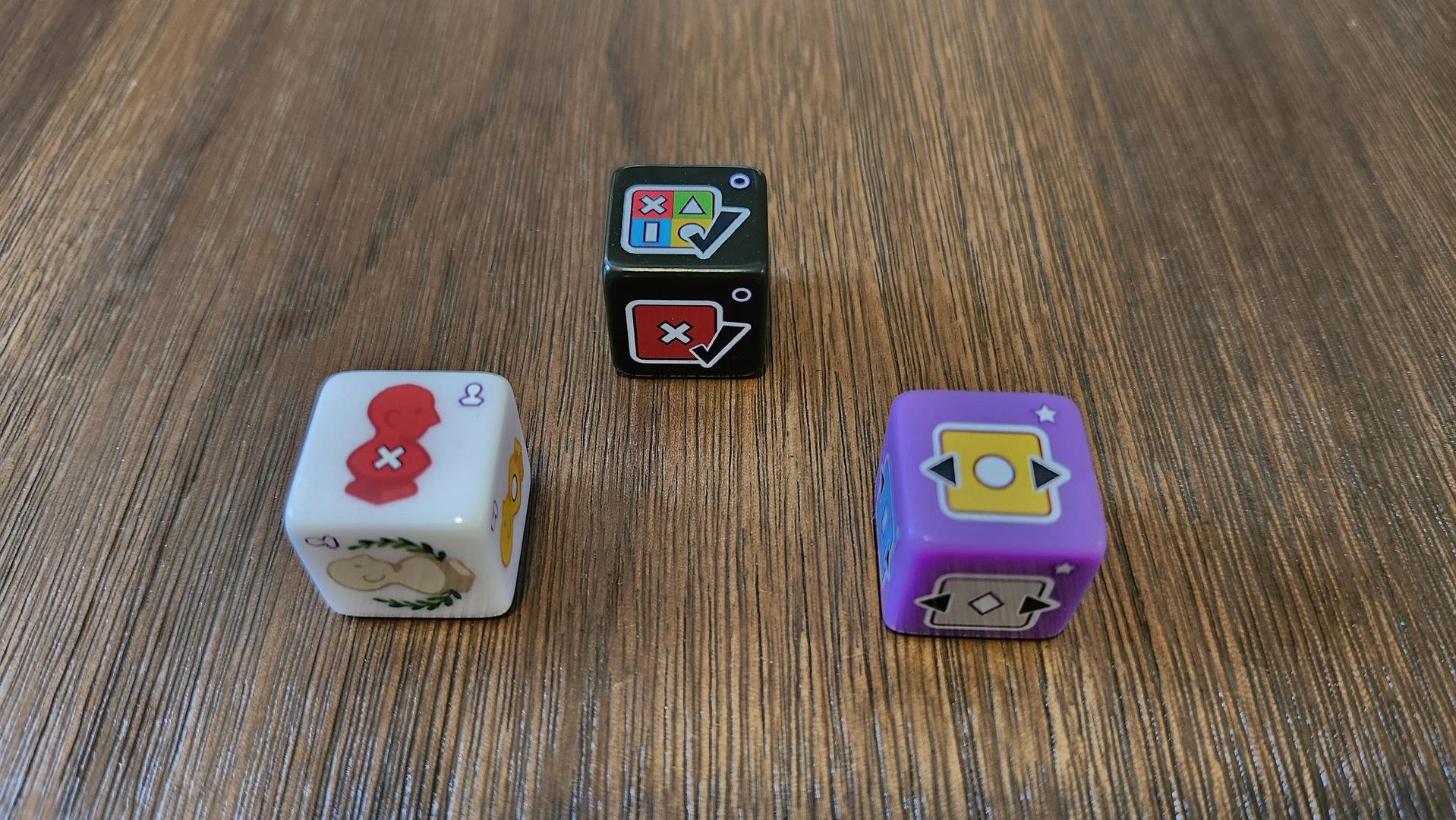 Le dé mauve: Le dé mauve est le seul dé qui vous permet de marquer des cases dans le bâtiment mauve. Ce bâtiment est extrêmement lucratif en points d’expérience, mais, pour y marquer des cases, vous devrez non seulement avoir accès au dé mauve, mais aussi remplir les conditions indiquées sur le dé. Par exemple, si la face indique le bâtiment jaune, vous devrez comparer votre plateau avec vos adversaires et avoir plus de cases marquées dans votre bâtiment jaune que le joueur de gauche et de droite. Si c’est le cas, vous pourrez marquer une case dans le bâtiment mauve.