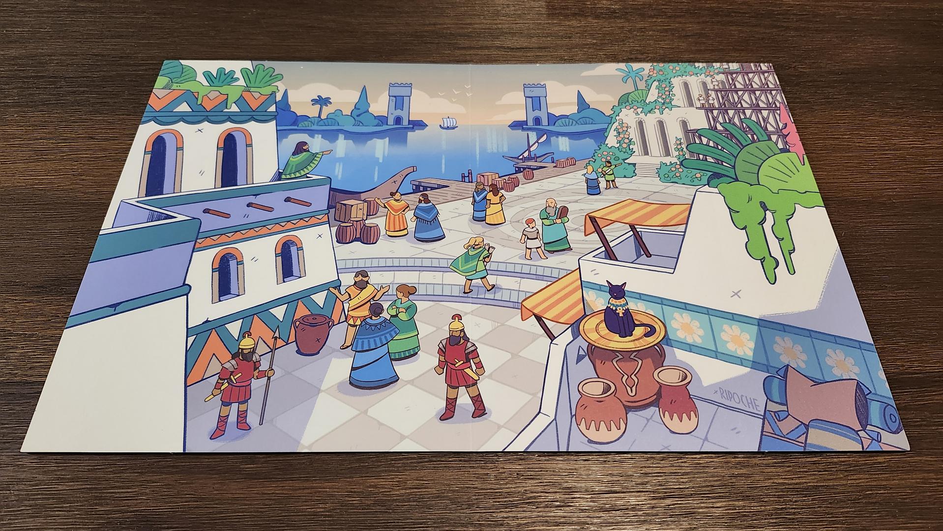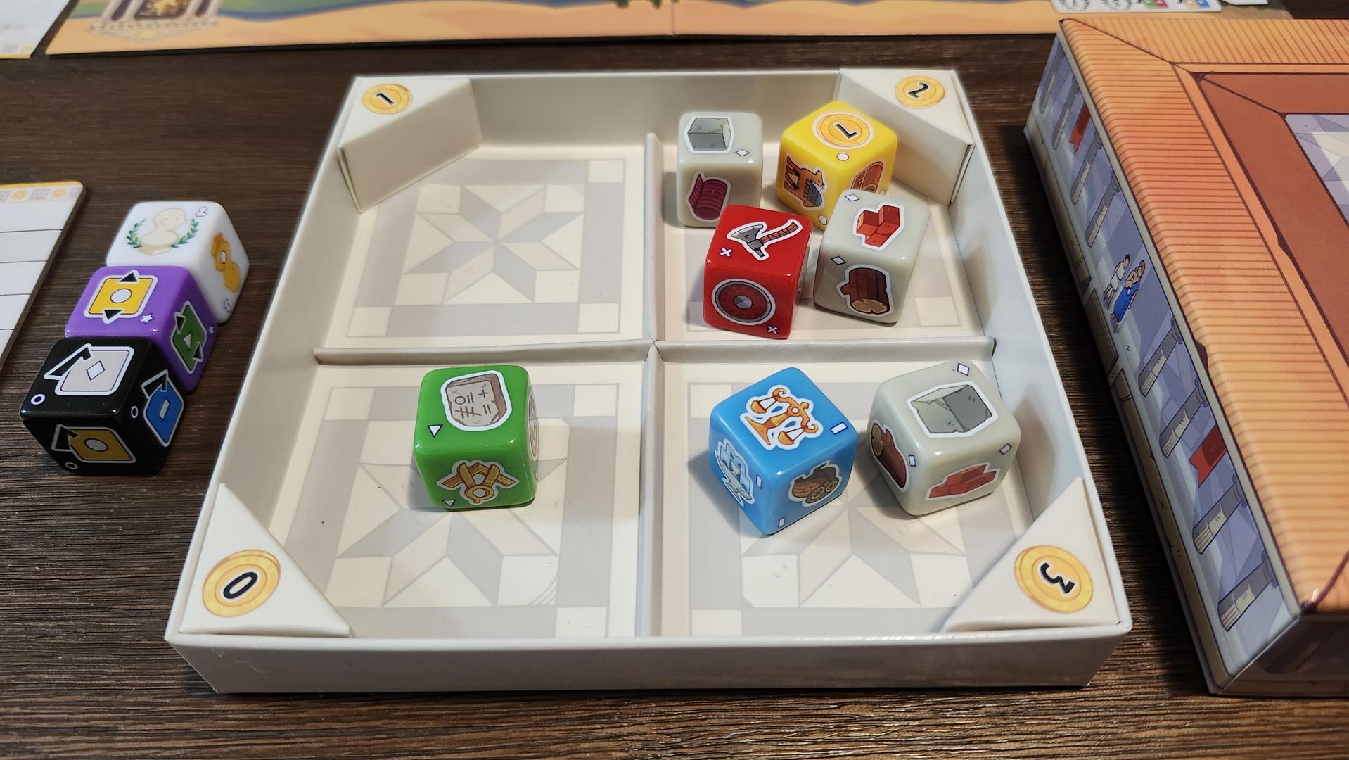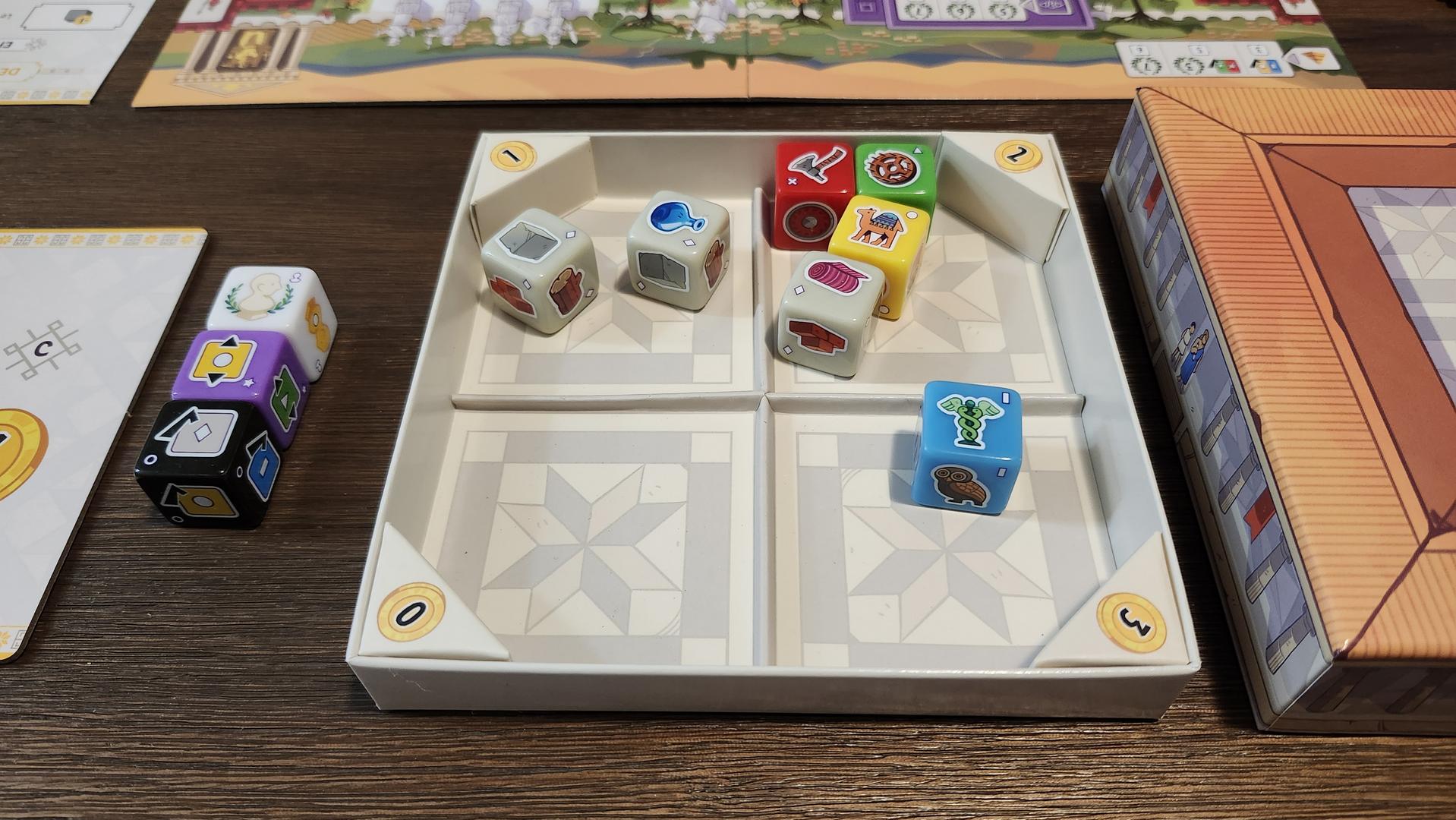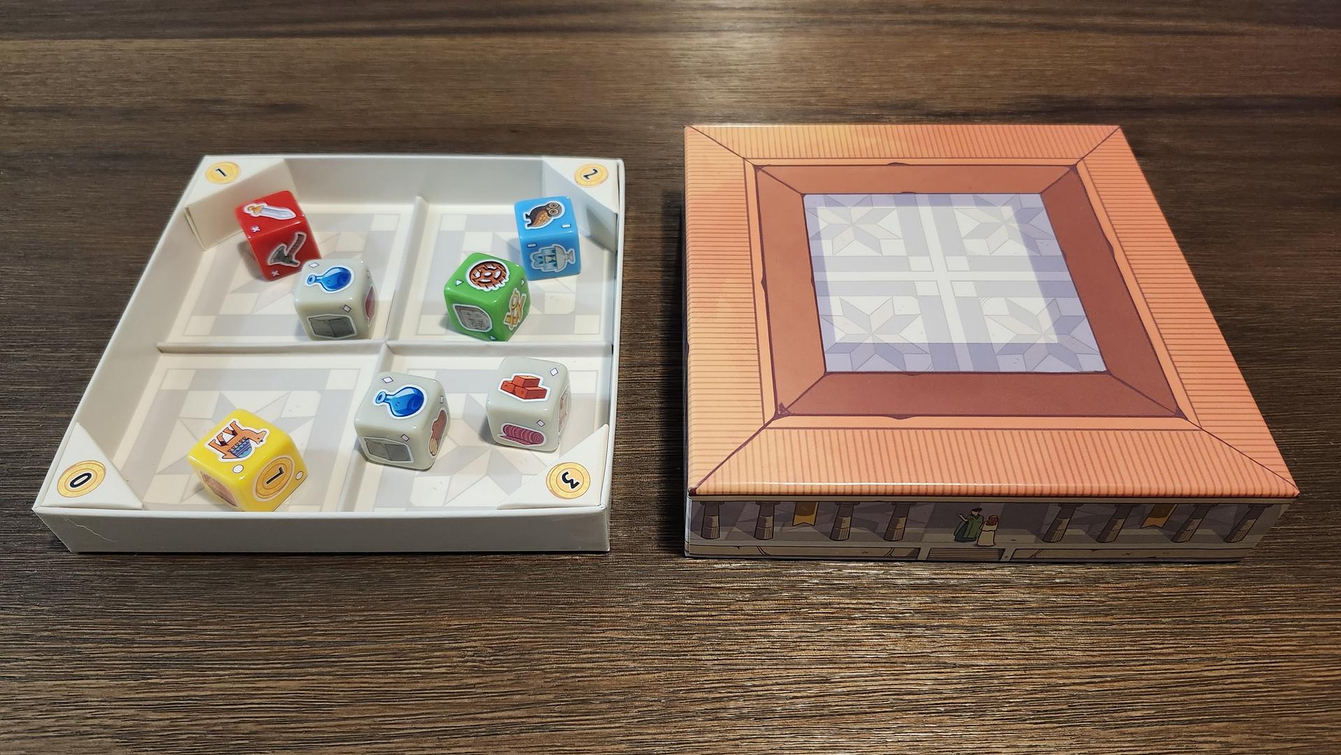 Pour commencer, parlons de l’emballage. La première chose que vous pourrez constater est que la boite est superbe! De plus, vous n’aurez pas de préparation à faire, puisqu’il n’y a pas de tokens à ensacher ni de cartes à sleever. Les composantes du jeu sont minimales, mais très jolies. Les plateaux de joueurs sont magnifiques et résistants en plus d’arborer une superbe illustration à l’arrière. Les dés sont aussi très réussis et le livret de règle est compact et facile à suivre. Mais ce que j’aime le plus est le forum: la petite boite en carton dans laquelle vous brasserez les dés. Elle n’est pas simplement jolie, elle est aussi très agréable à utiliser. Pour brasser les dés entre les rondes, il suffit de fermer le couvercle et de secouer la boite. Les petites divisions à l’intérieur font pivoter les dés et assurent un résultat différent pour chaque brasse. Toutefois, je vous conseille de faire pivoter la boite quelques fois avant de l’agiter. Cela évite que les dés se retrouvent souvent dans le même coin (vous comprendrez plus tard pourquoi cet aspect est important). Si vous ne faites que des mouvements circulaires comme indiqué dans les règles sans faire pivoter la boite au préalable, il se peut que les dés se retrouvent fréquemment dans les deux mêmes compartiments. Si l’on oublie ce léger détail, puisqu’il est facile d’y remédier en faisant pivoter la boite avant de l’agiter, la brasse des dés est vraiment très rapide et très agréable.